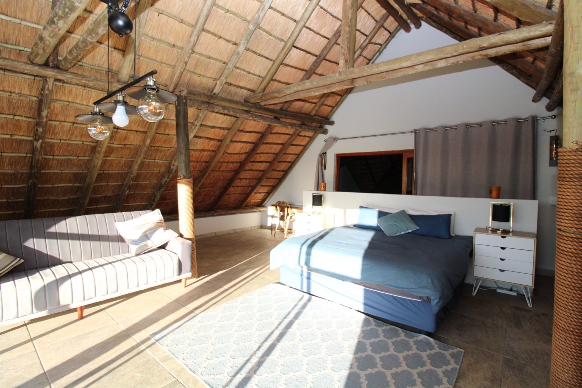 Step into a spacious, open-plan pavilion anchored by a dramatic thatched roof and framed by floor-to-ceiling wooden glass sliding doors.