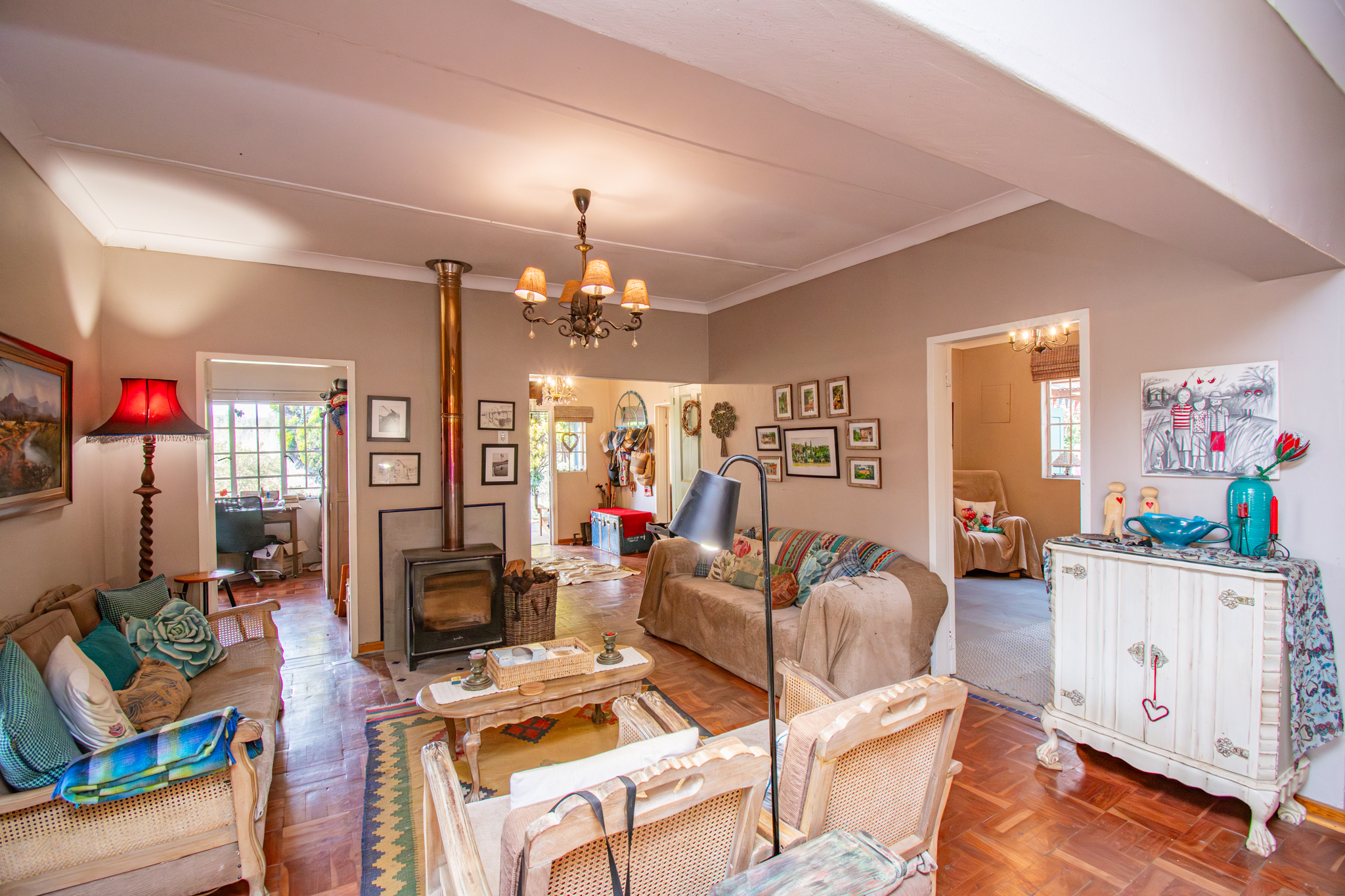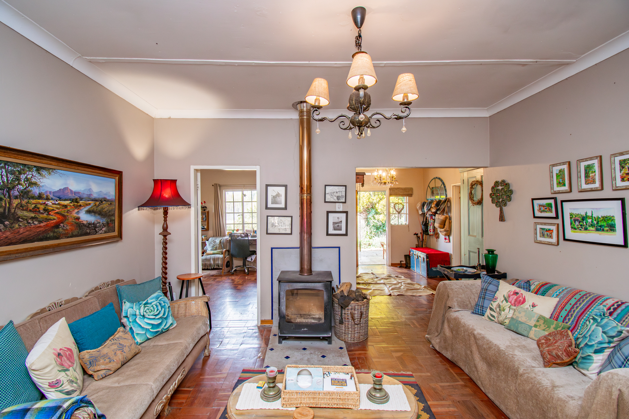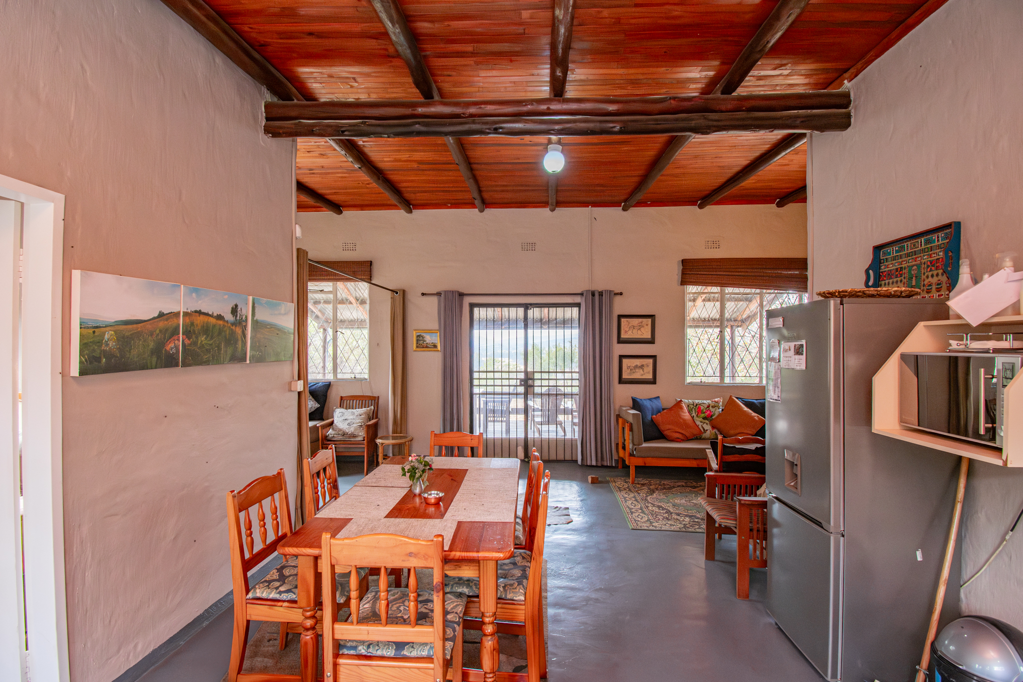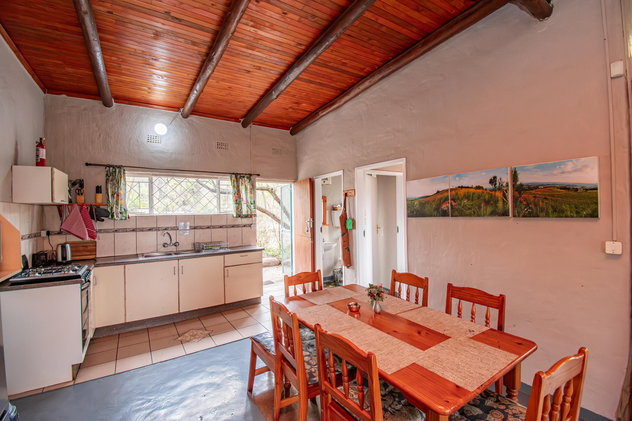 This is a property where passion and purpose meet. The owners have lovingly poured their hearts into every aspect of this farm over the past 20 years — and you can feel it from the moment you arrive. From the restored 1940s farmhouse to the carefully nurtured gardens and character-filled guest cottages, this is a place built with care, soul, and vision. At the centre of the property lies the beautifully restored original farmhouse, filled with timeless character and warmth. It features a welcoming entrance hall, two cozy fireplaces, a comfortable lounge, three bedrooms, two bathrooms, a generous dining room, and a traditional farm-style kitchen. Private lounge can be uitilsed as a fourth bedroom. The large undercover patio with built-in braai overlooks manicured gardens, peaceful patios, and layered terraces framed by hedges — perfect for slow mornings or long summer evenings. Set within a lush landscape, this property offers fertile, arable land – approximately 4 hectares, ideal for organic farming, grazing, or expansion. The organic vegetable gardens are already thriving — a testament to sustainable living. And with a greenhouse to boot, you can prepare for summer planting.