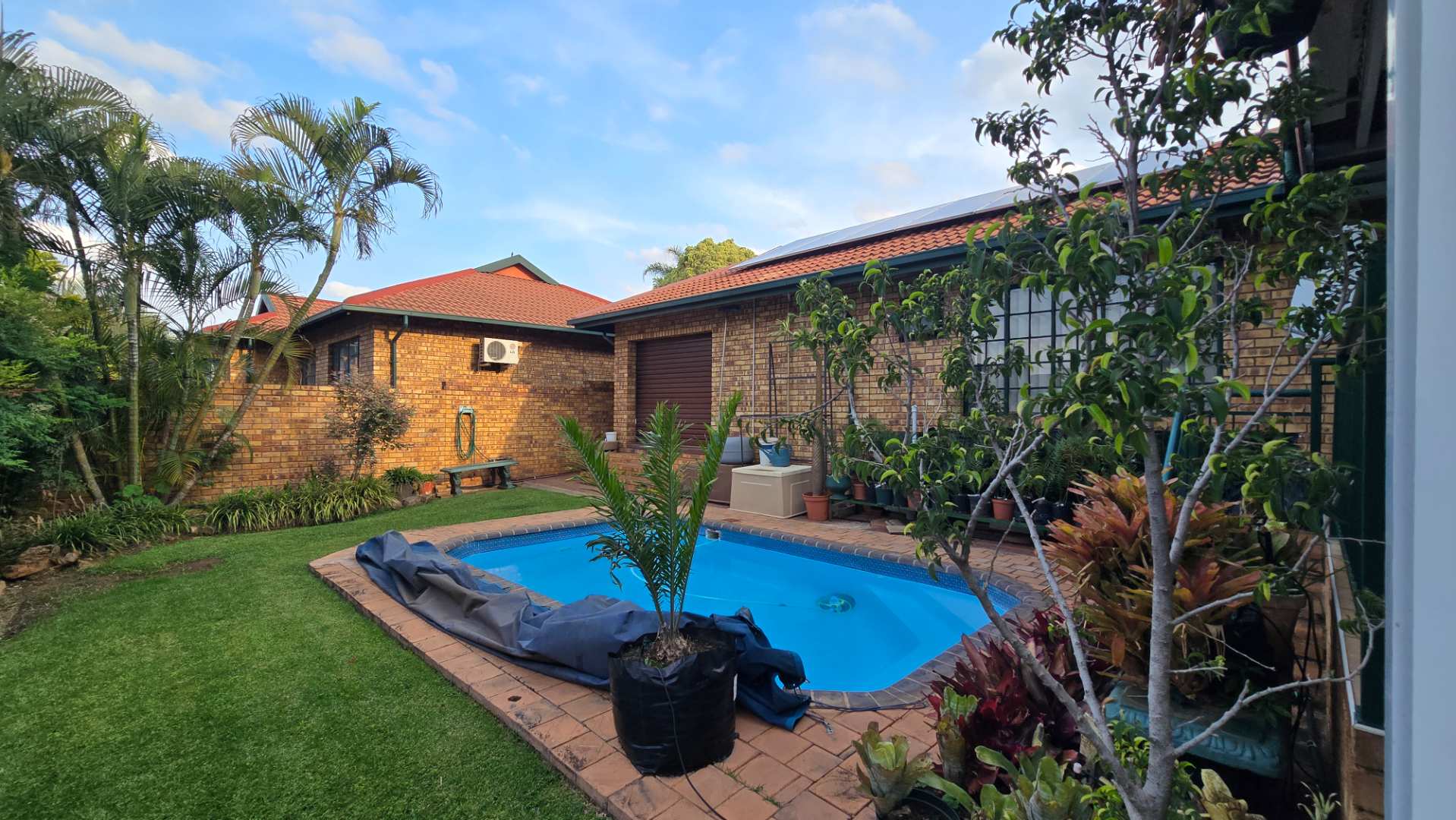 A standout feature of this property is the tranquil patio that overlooks a sparkling blue pool, surrounded by a beautifully maintained lush garden. A Wendy house in the garden's corner provides convenient storage for gardening necessities.