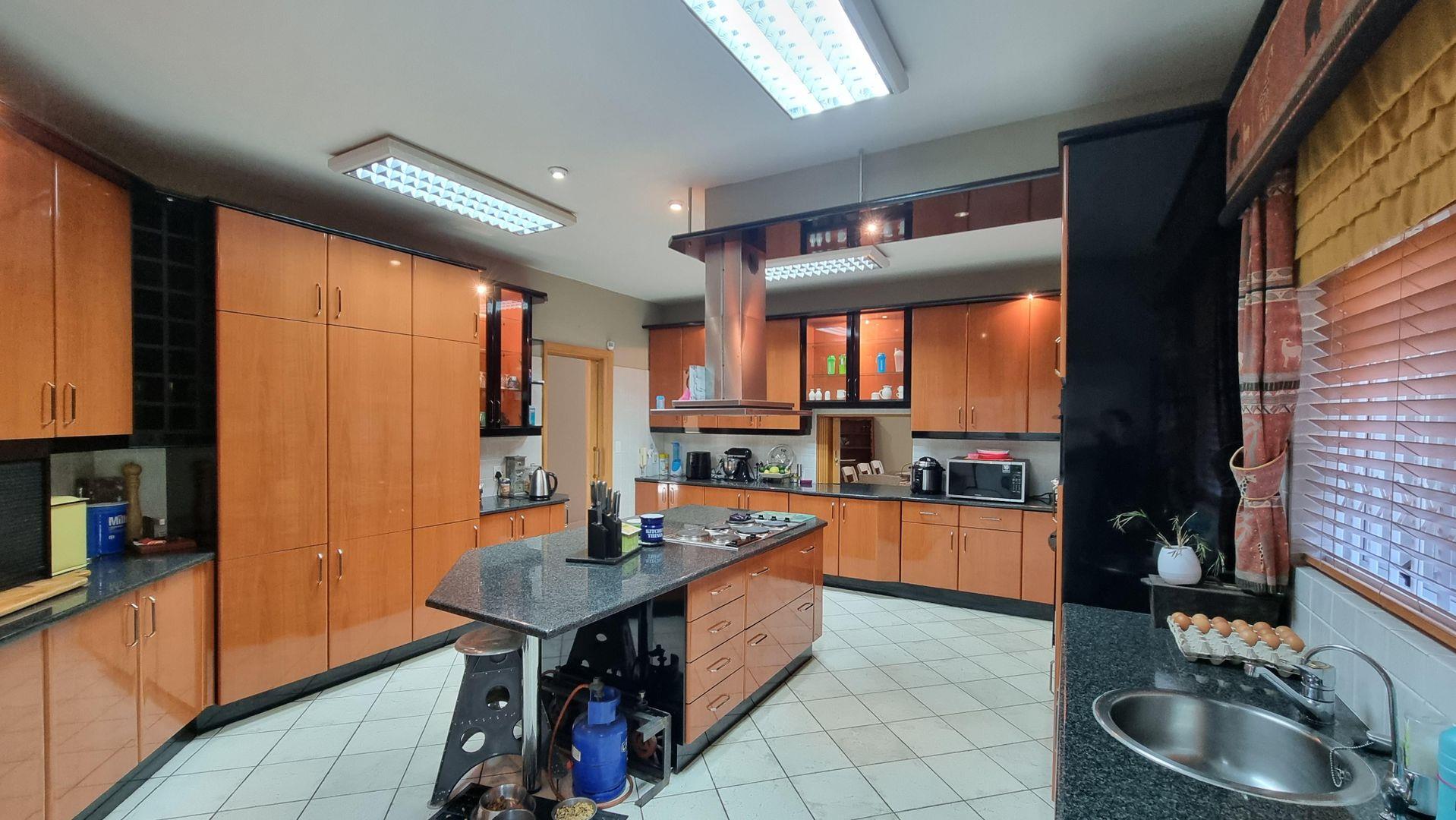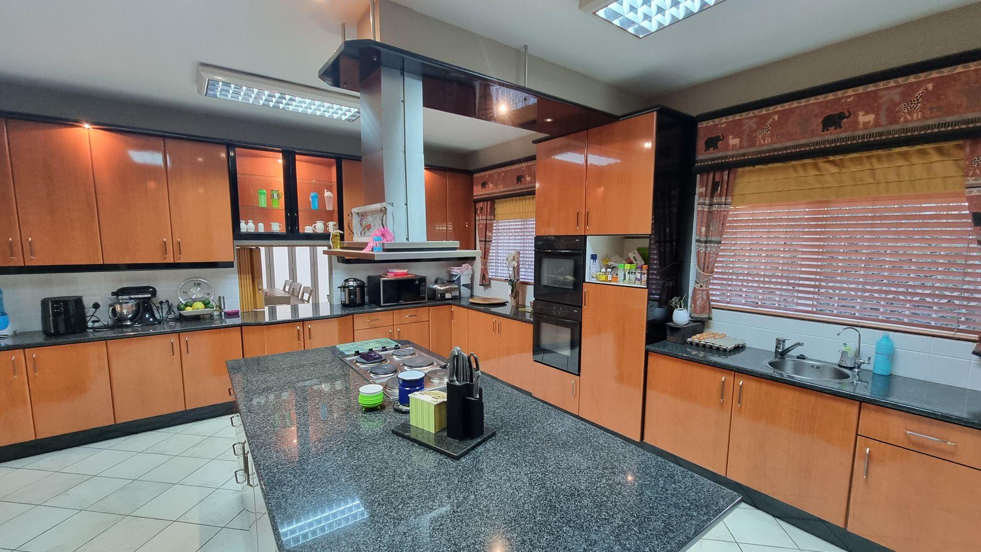 The kitchen is timeless in design — a blend of style and functionality — complete with a centre preparation island, gas hob, eye-level oven, and a separate laundry/scullery.