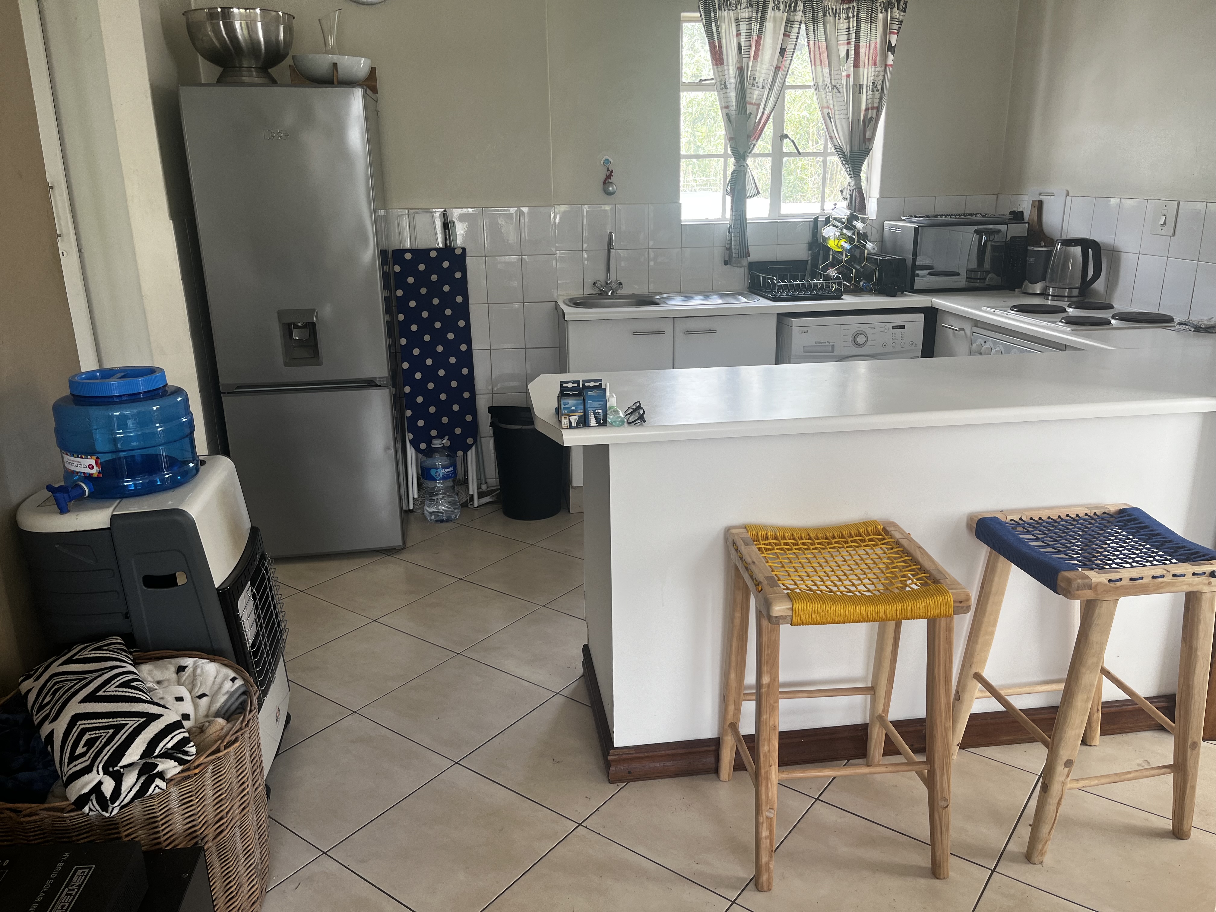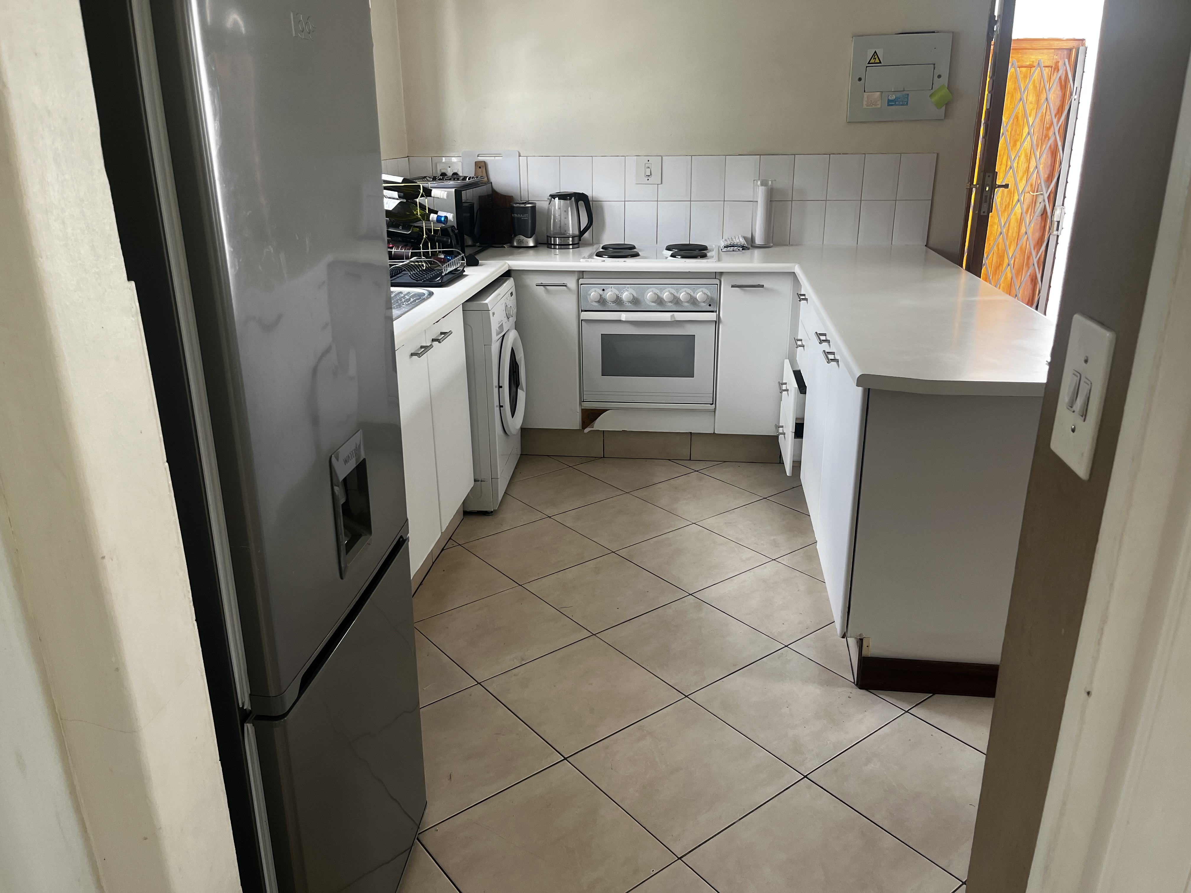 The kitchen has hob and under counter oven this kitchen with double basins set in tops . There is space for one wet appliance and single door fridge This kitchen comes with cupboard space.