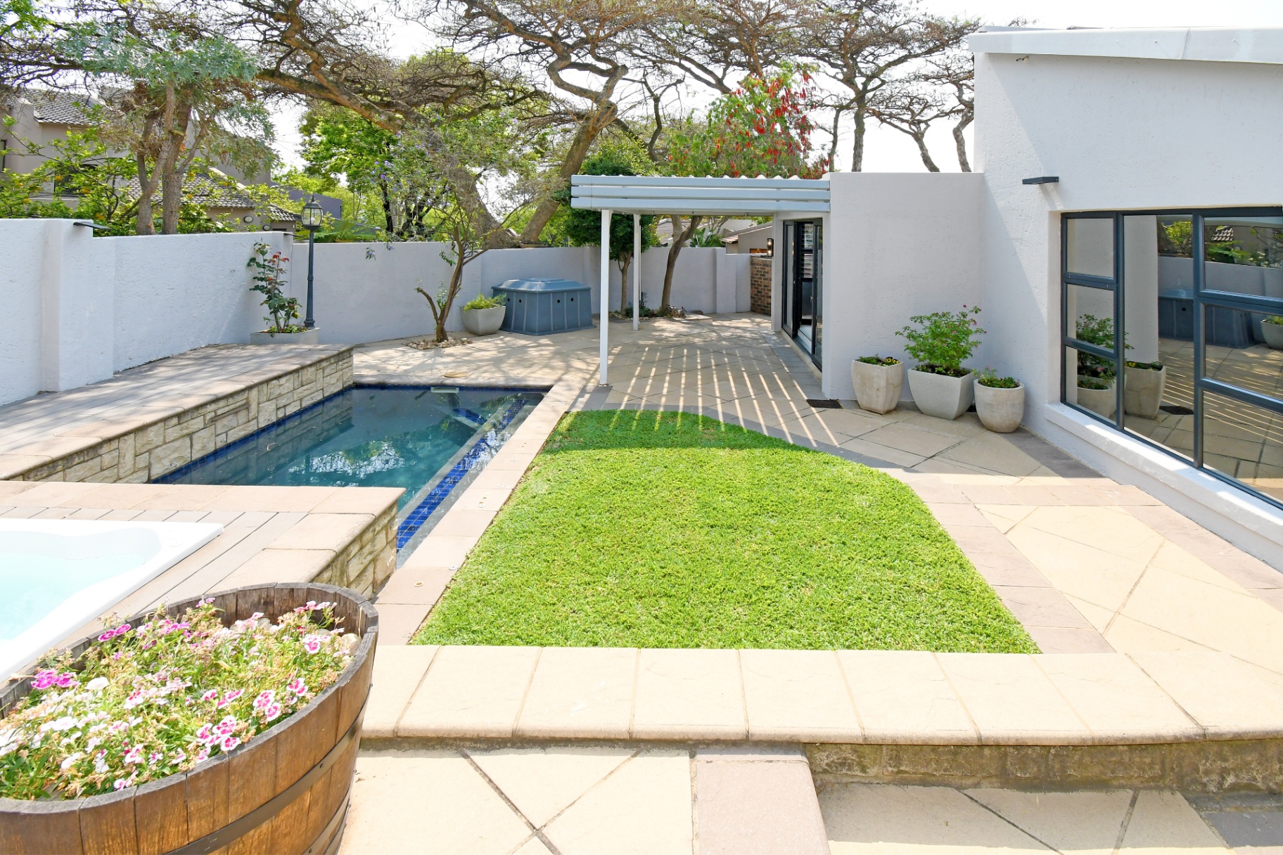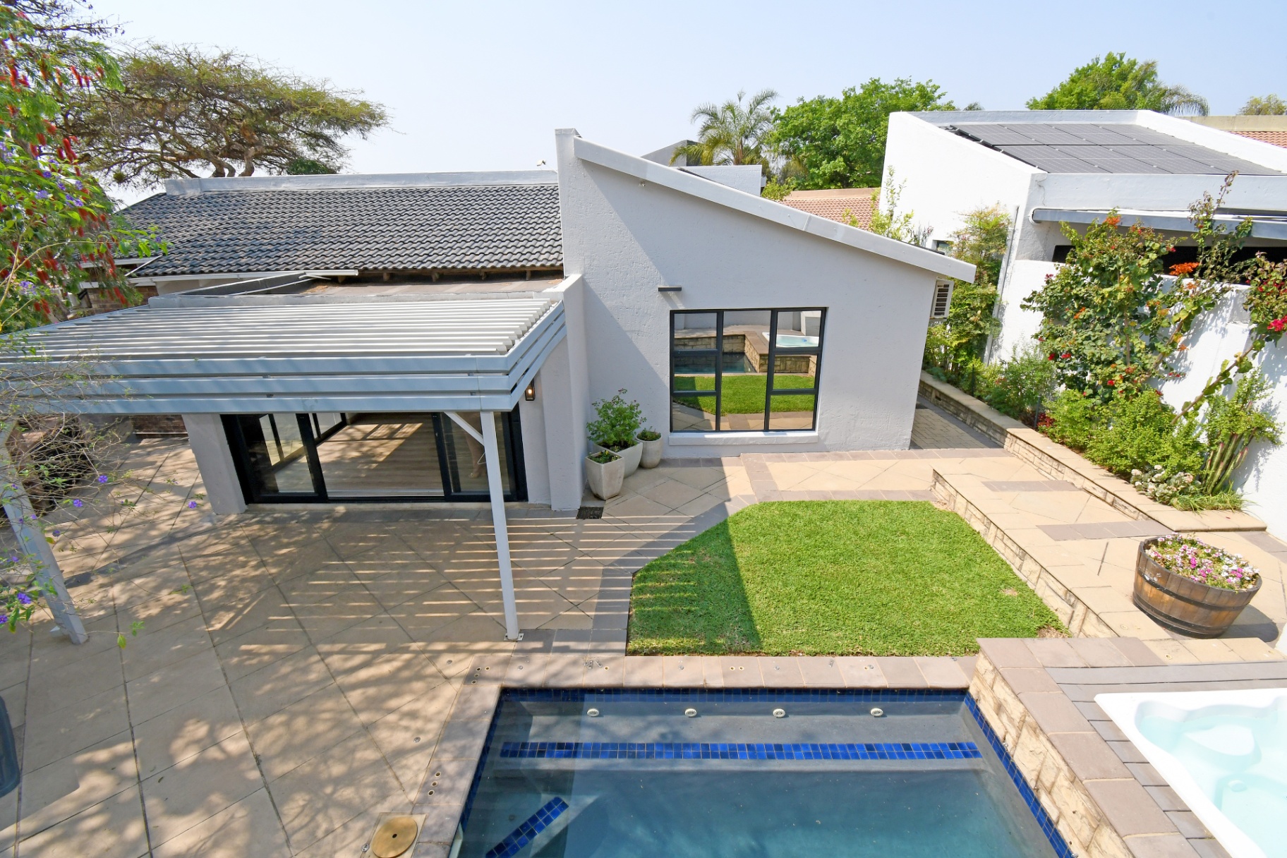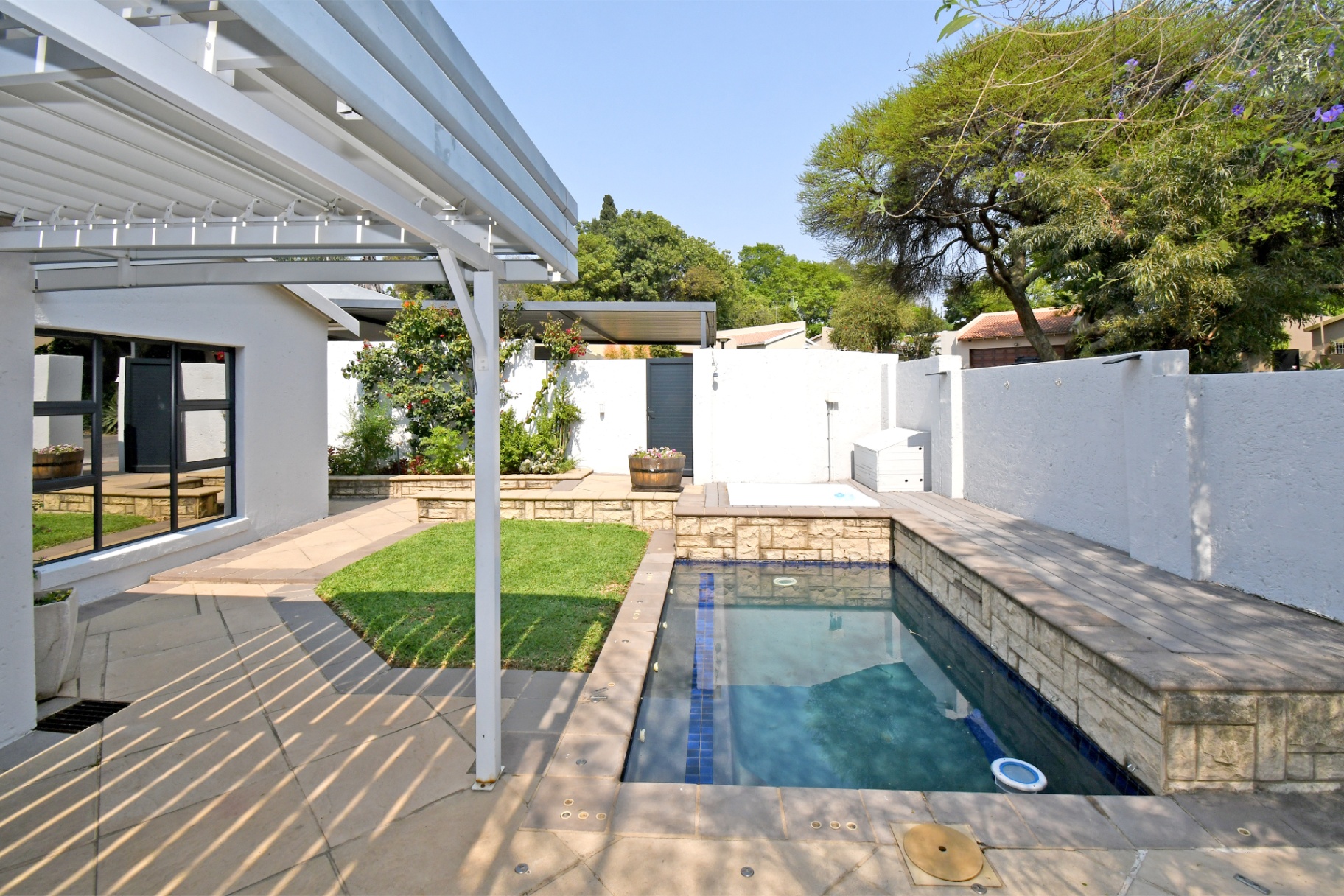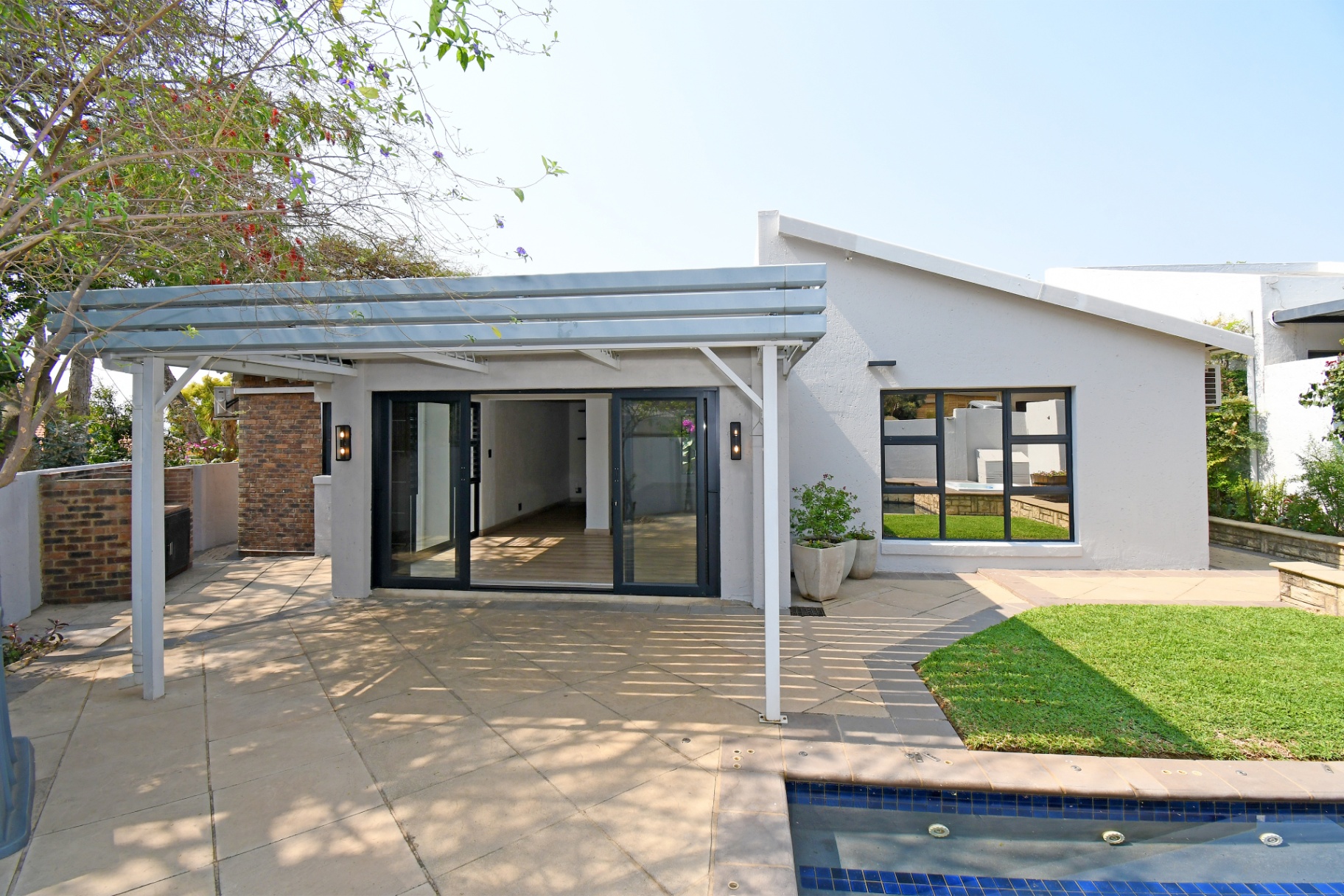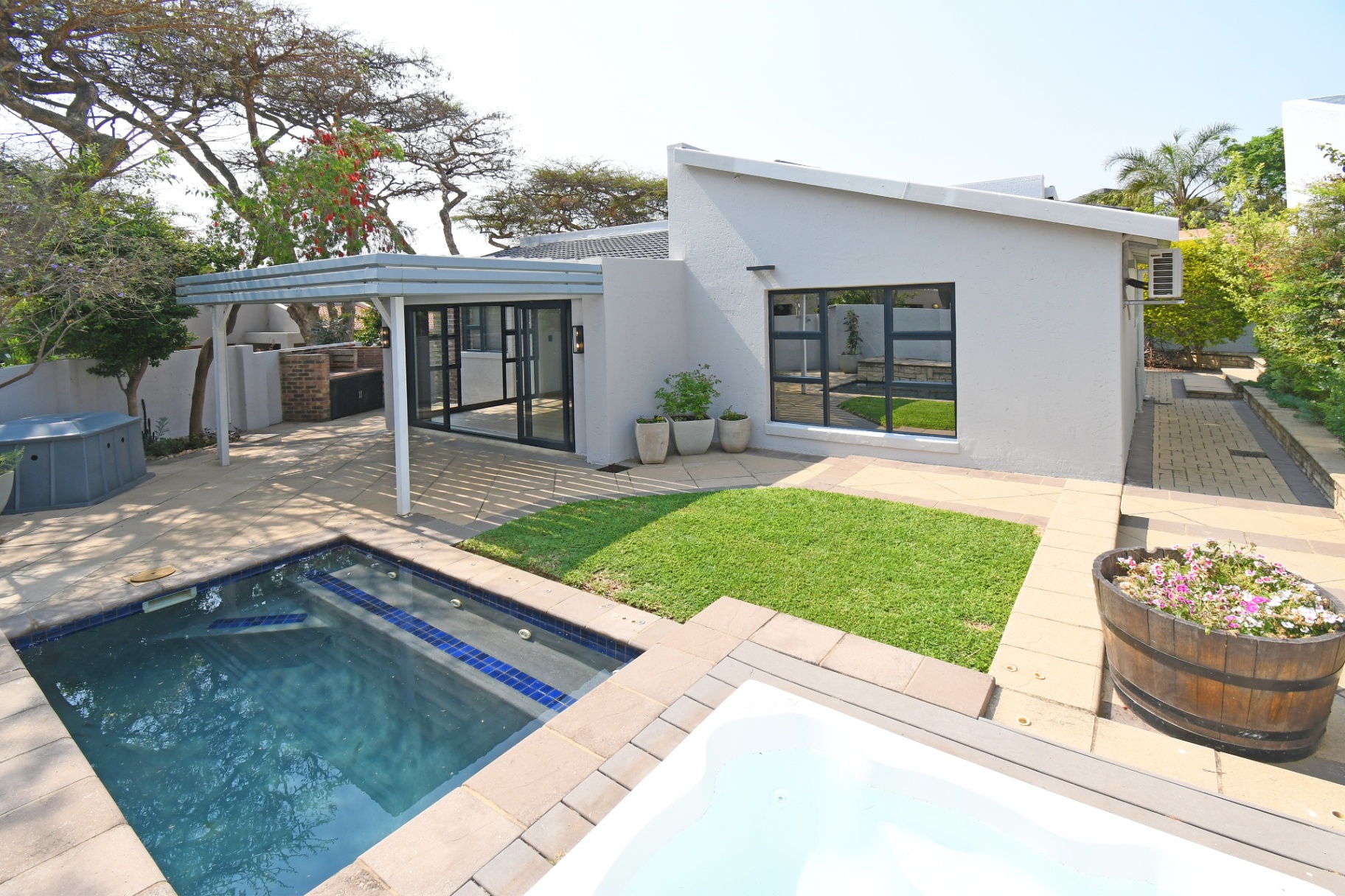 Open-plan lounge and dining spaces spill onto a covered patio with adjustable awning, overlooking the sparkling pool, Jacuzzi, and private garden with braai area. The ultimate entertainer’s setup!