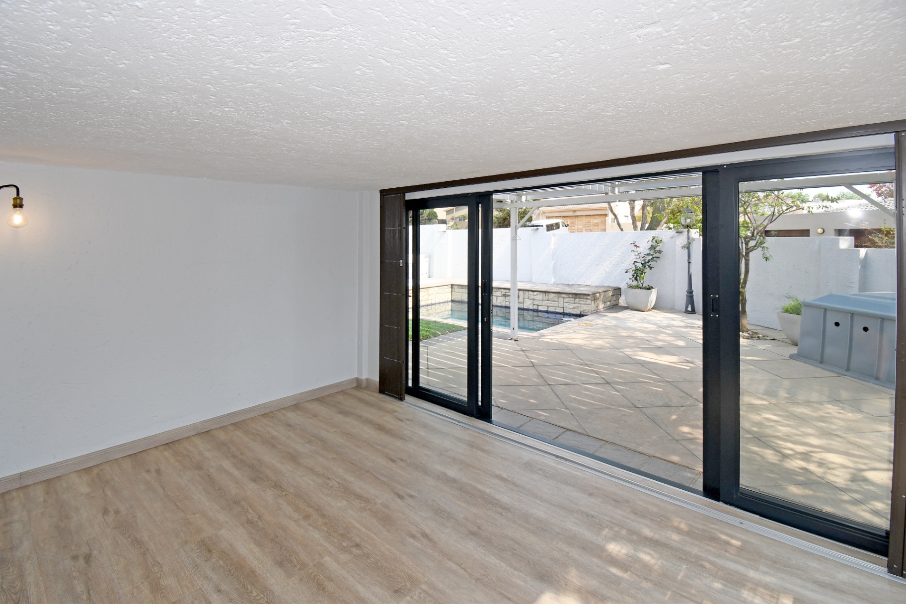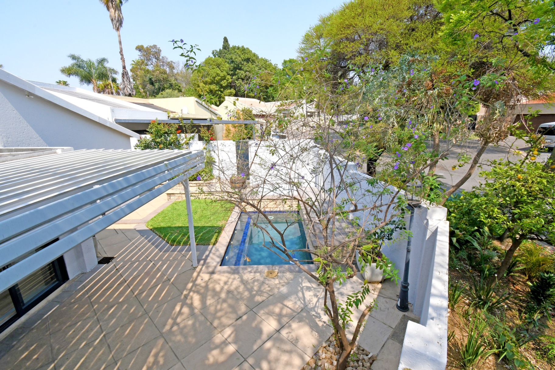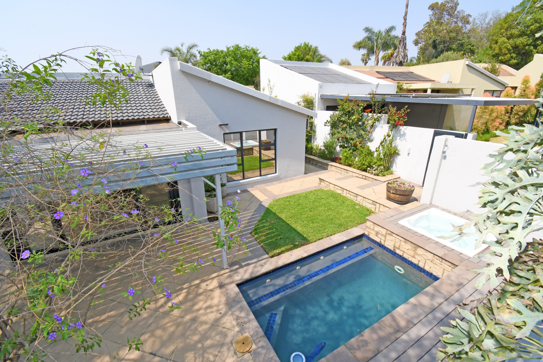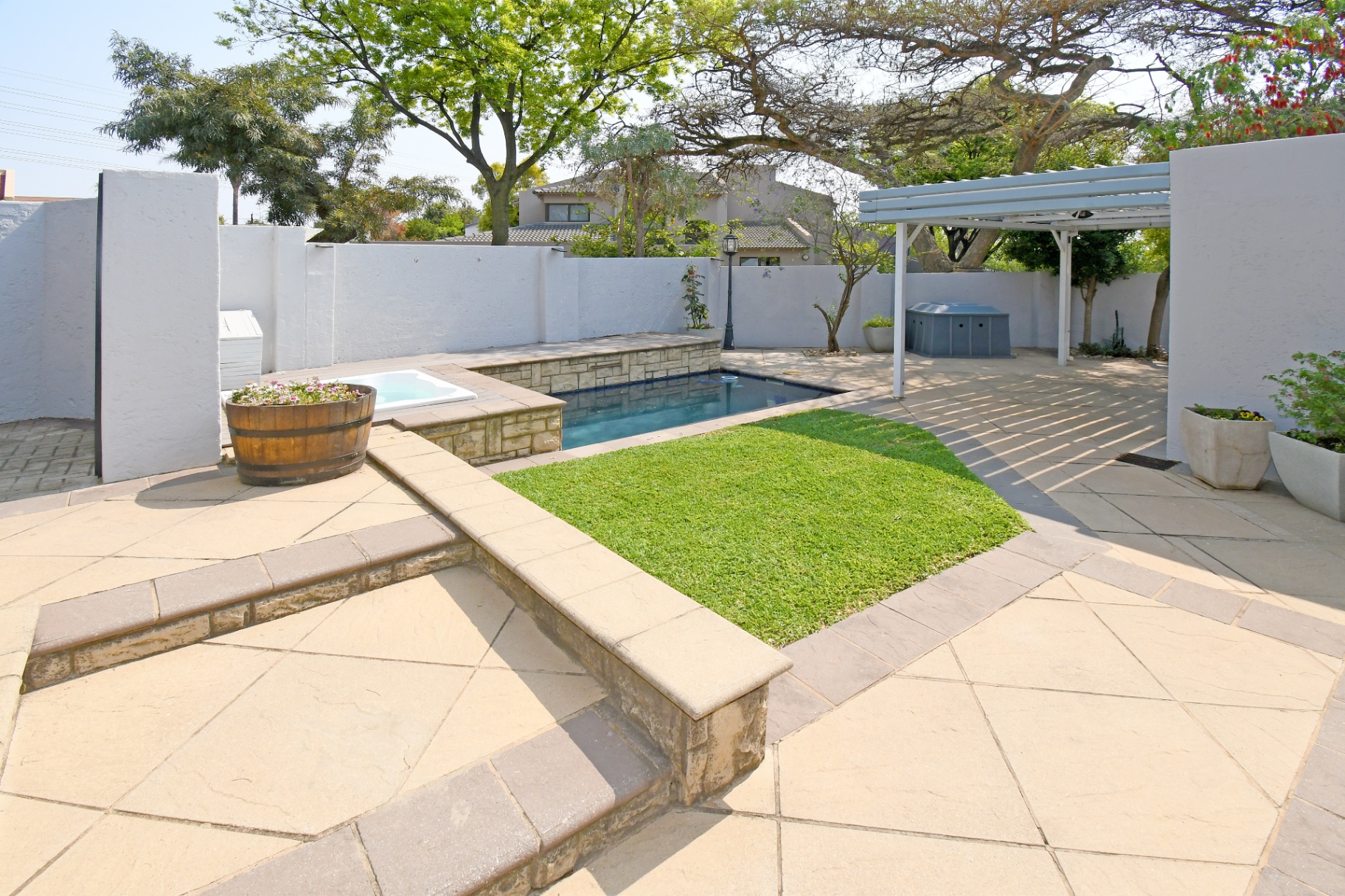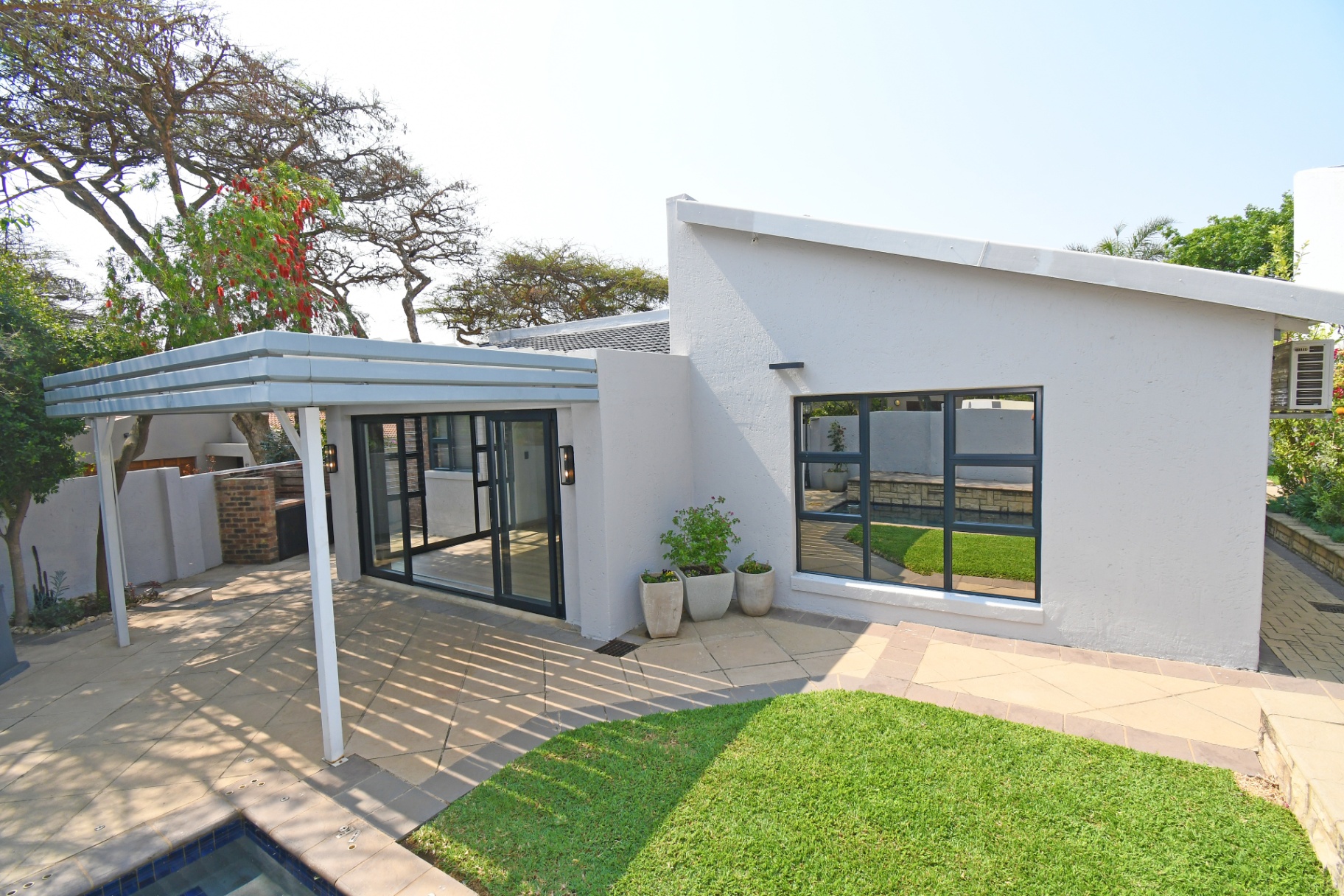 Open-plan lounge and dining spaces spill onto a covered patio with adjustable awning, overlooking the sparkling pool, Jacuzzi, and private garden with braai area. The ultimate entertainer’s setup!