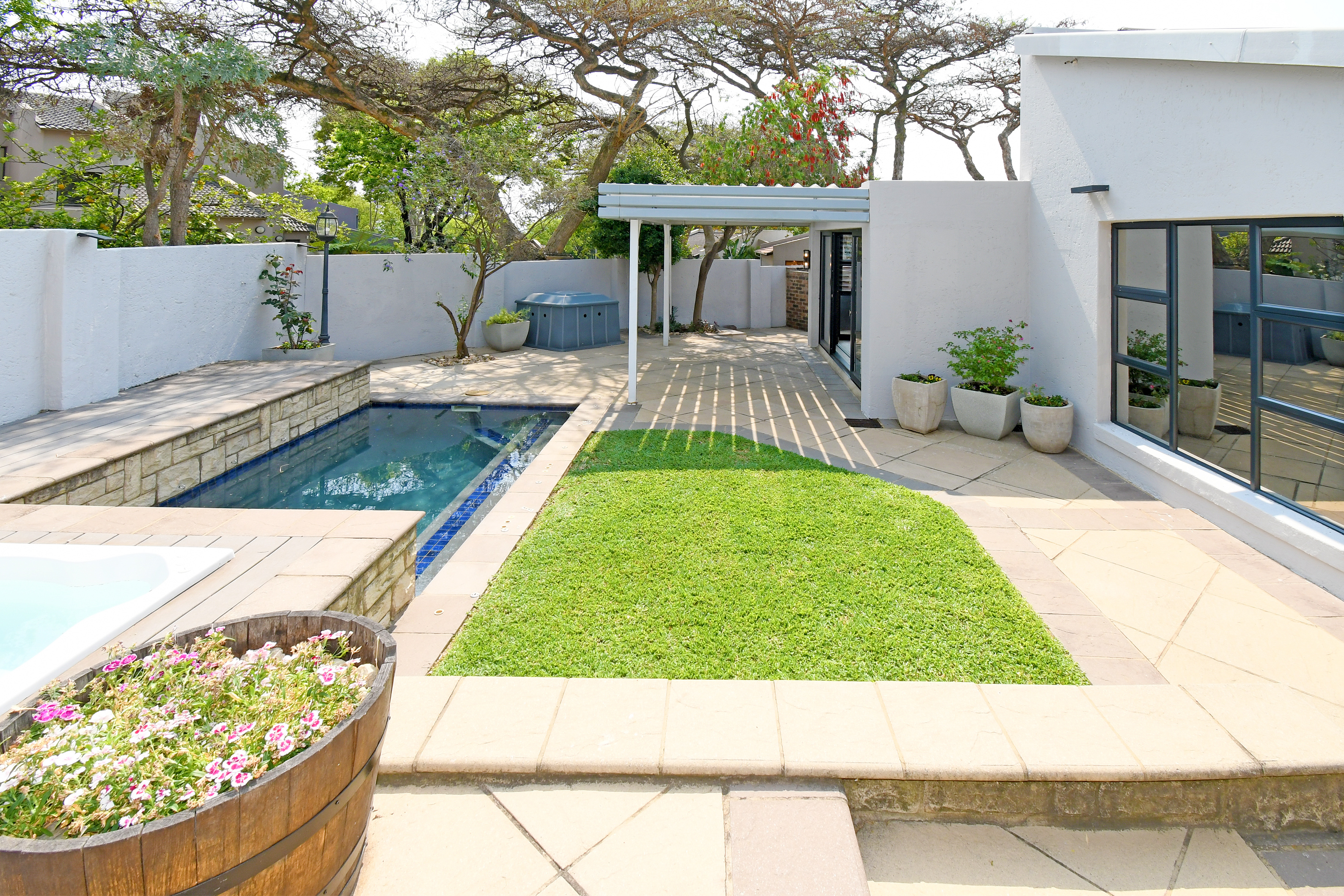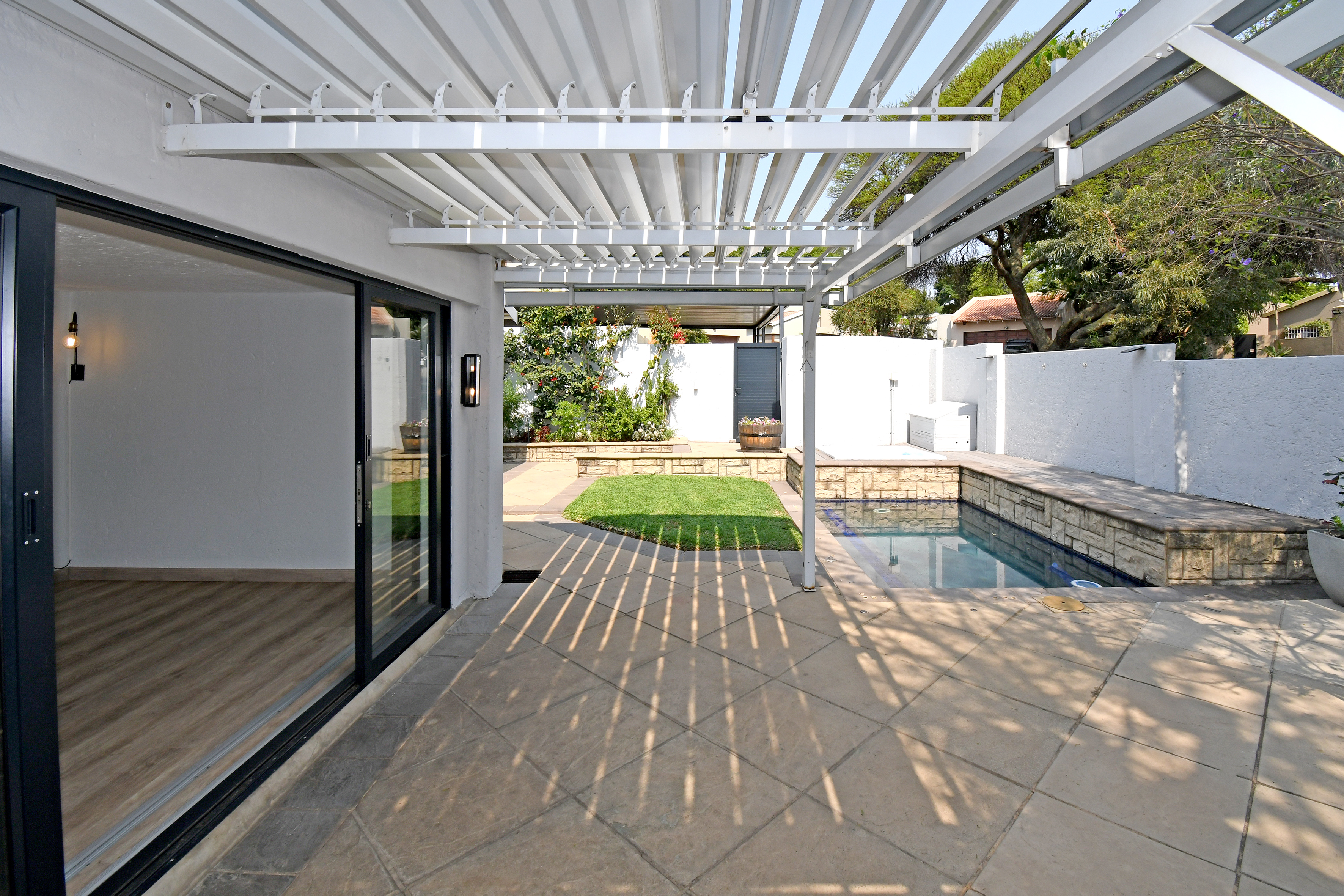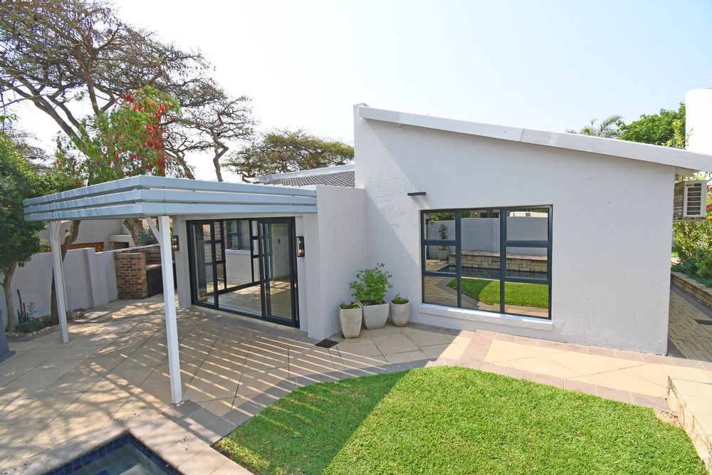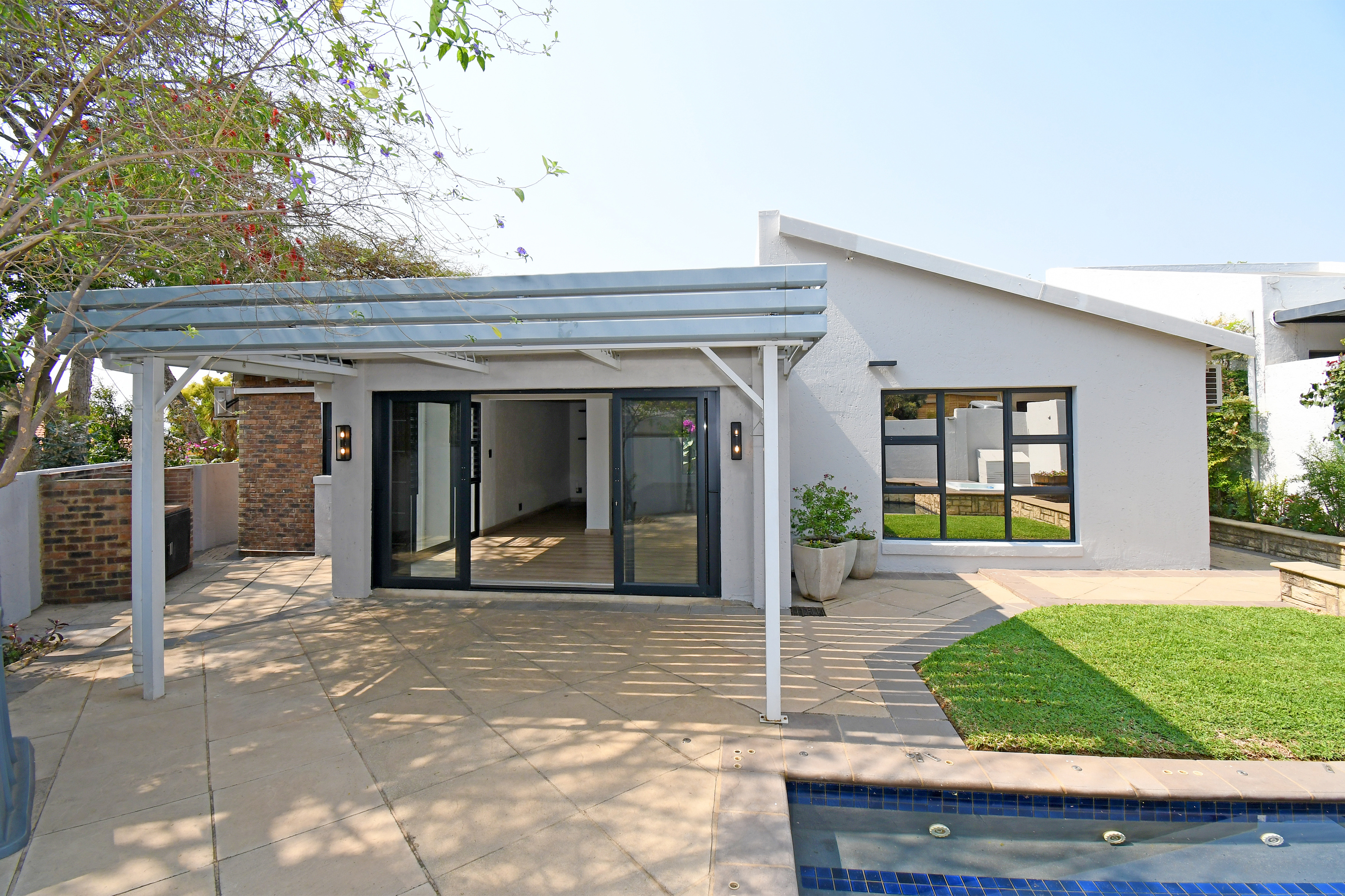 Open-plan lounge and dining areas flow seamlessly onto a covered patio with an adjustable awning, overlooking the sparkling pool, Jacuzzi, and private garden with braai area—creating the ultimate entertainer’s retreat.