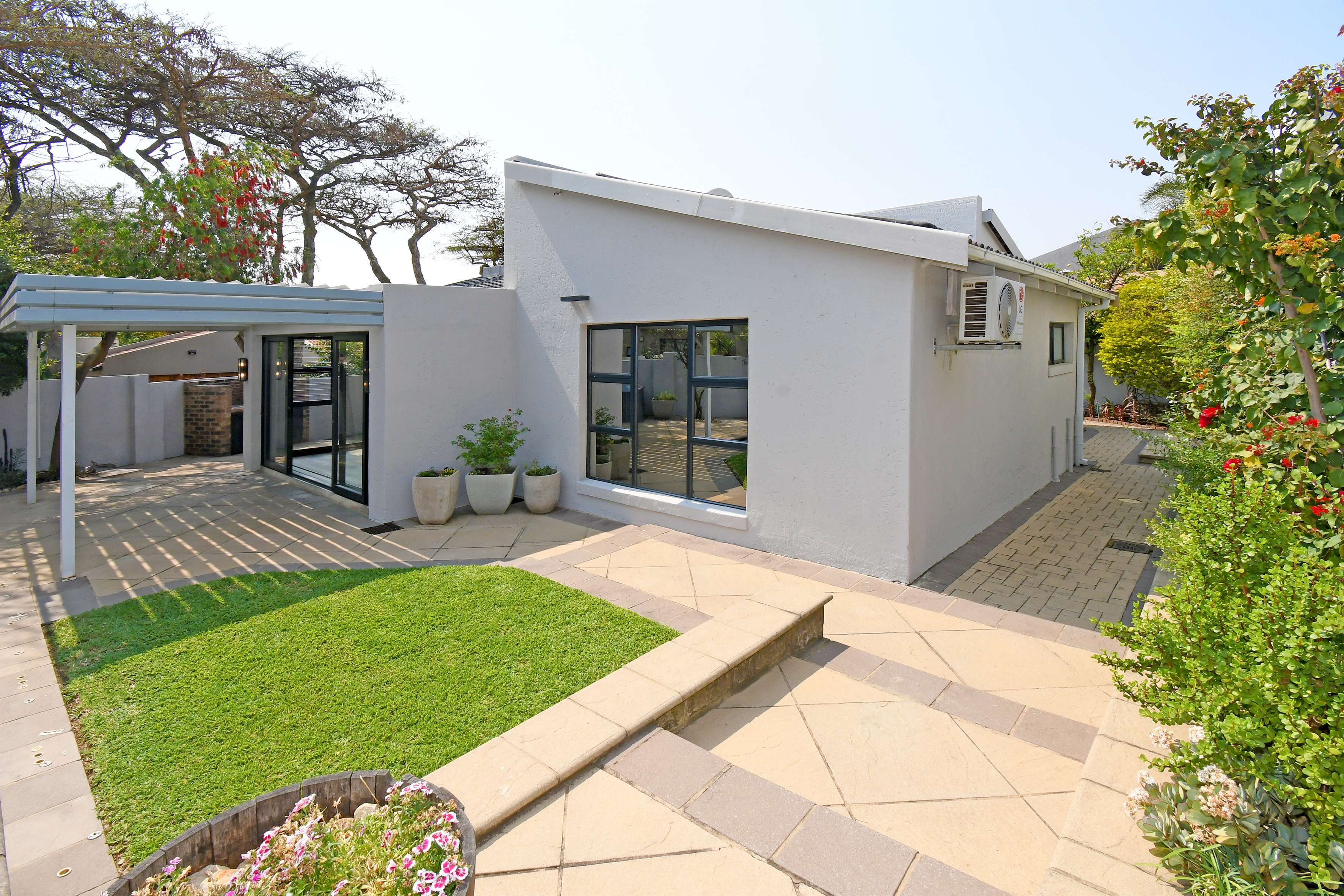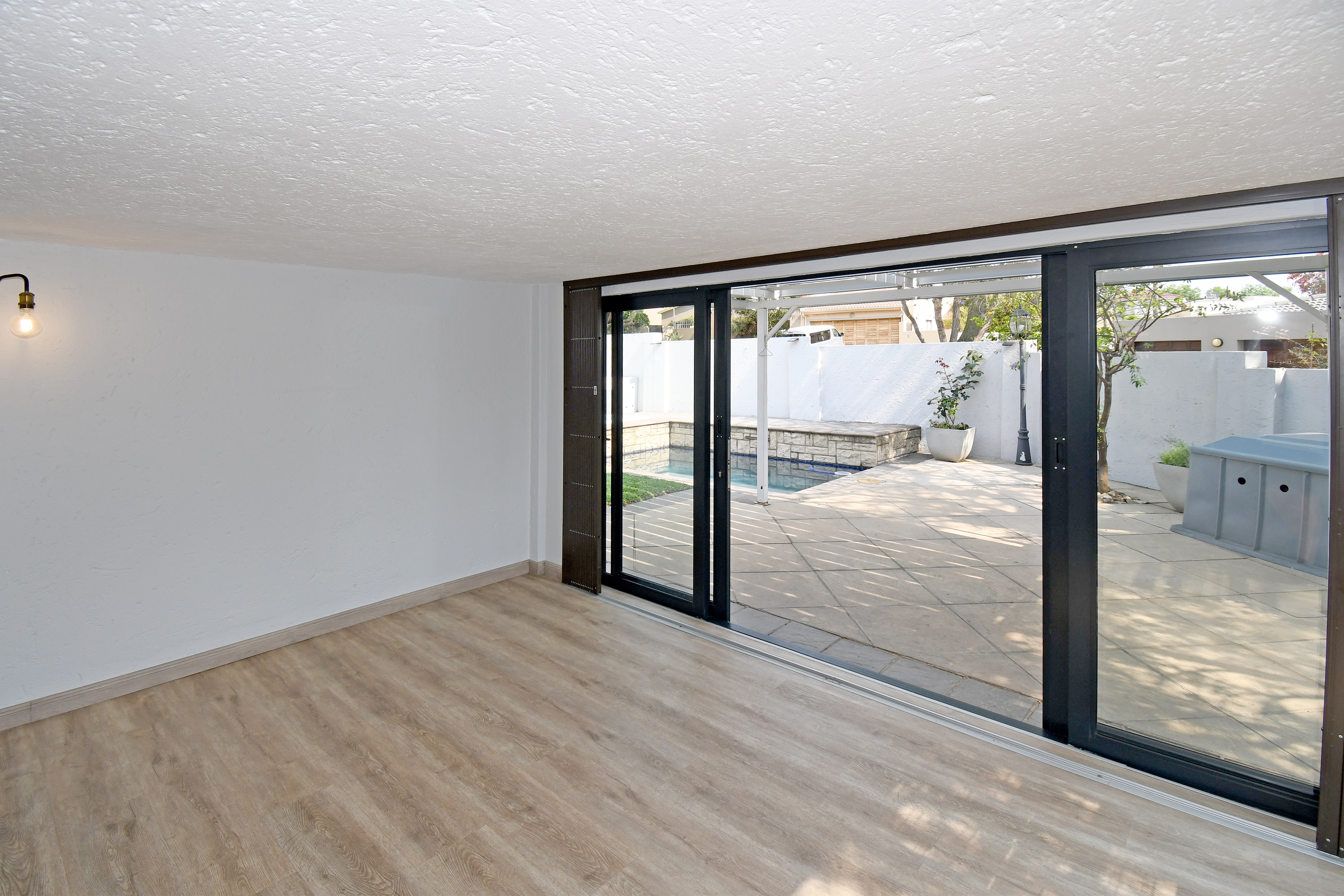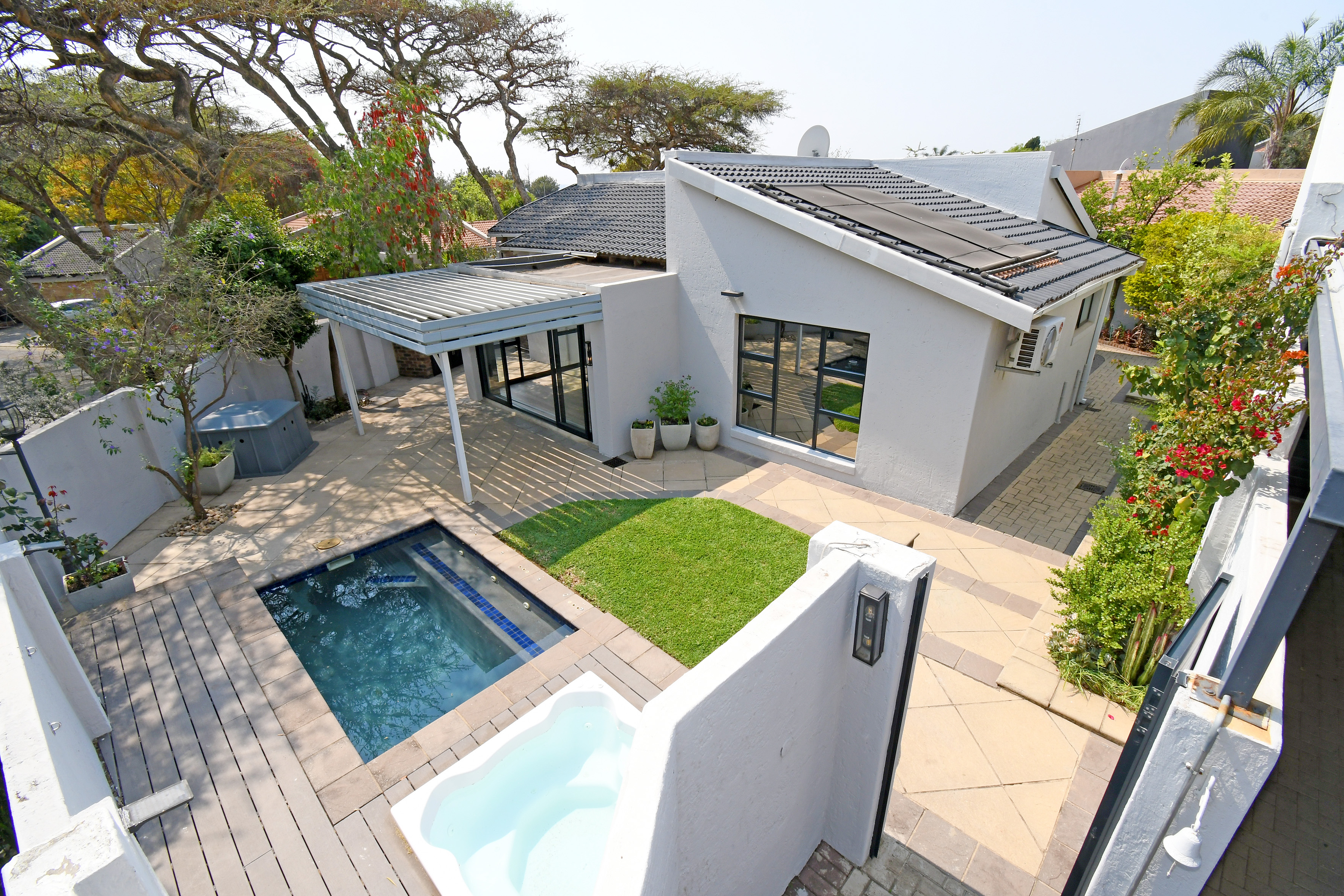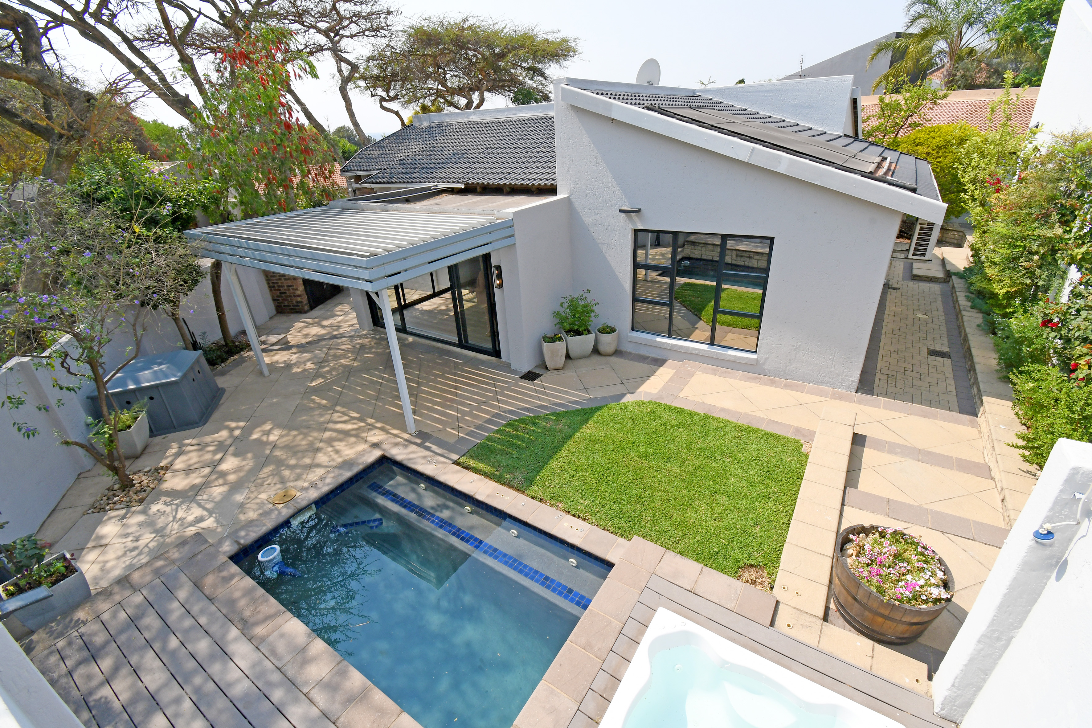 Open-plan lounge and dining areas flow seamlessly onto a covered patio with an adjustable awning, overlooking the sparkling pool, Jacuzzi, and private garden with braai area—creating the ultimate entertainer’s retreat.