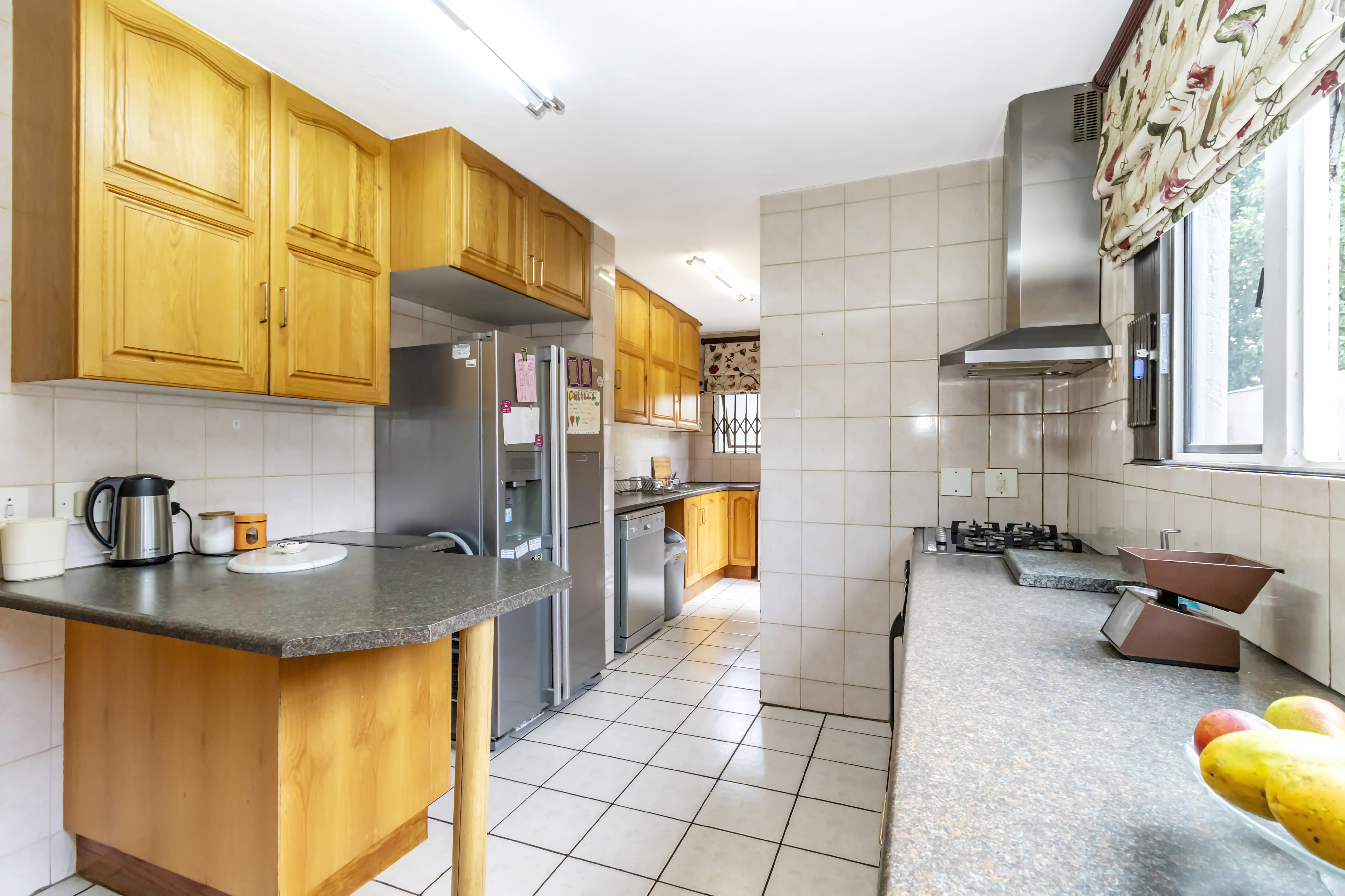 - A large family kitchen with ample cupboard space, a walk-in pantry, gas hob, electric oven, extractor fan, and a separate scullery with space for three under-counter appliances and a double-door fridge