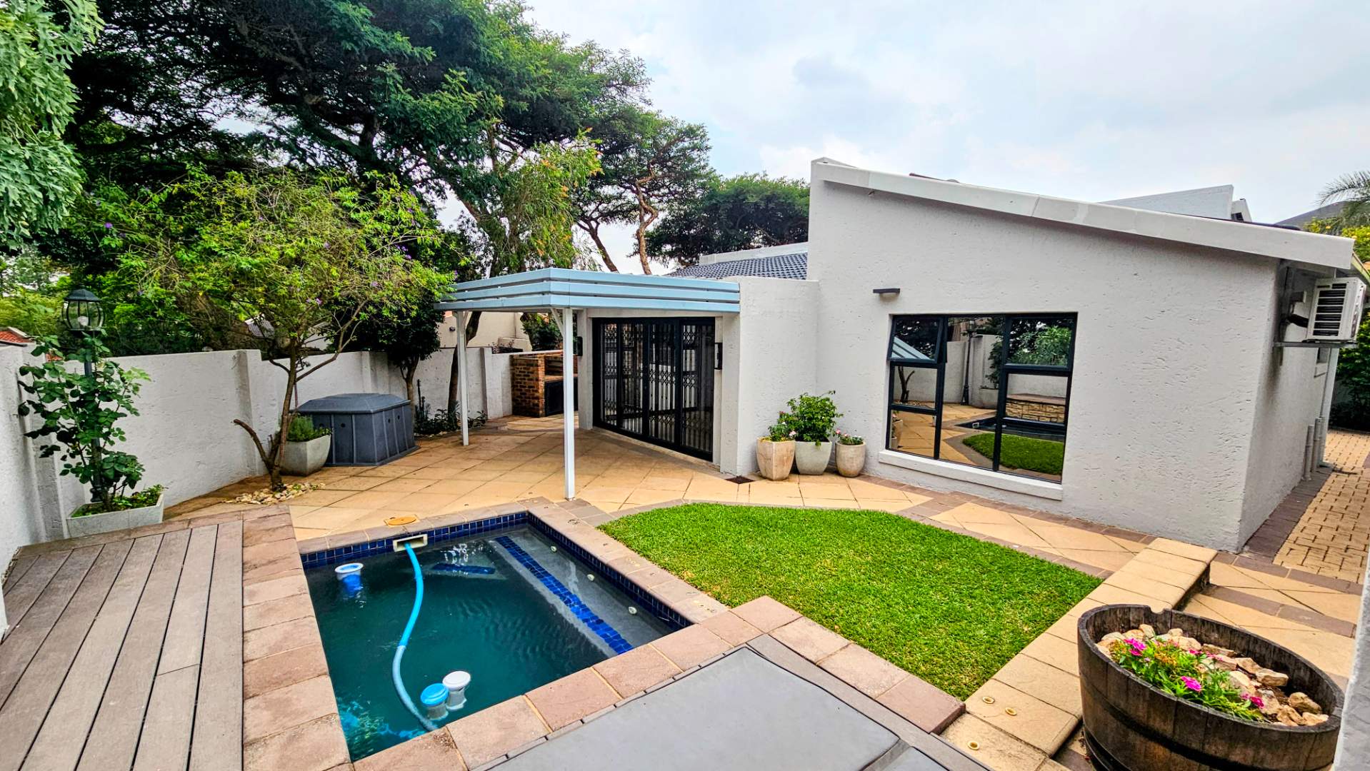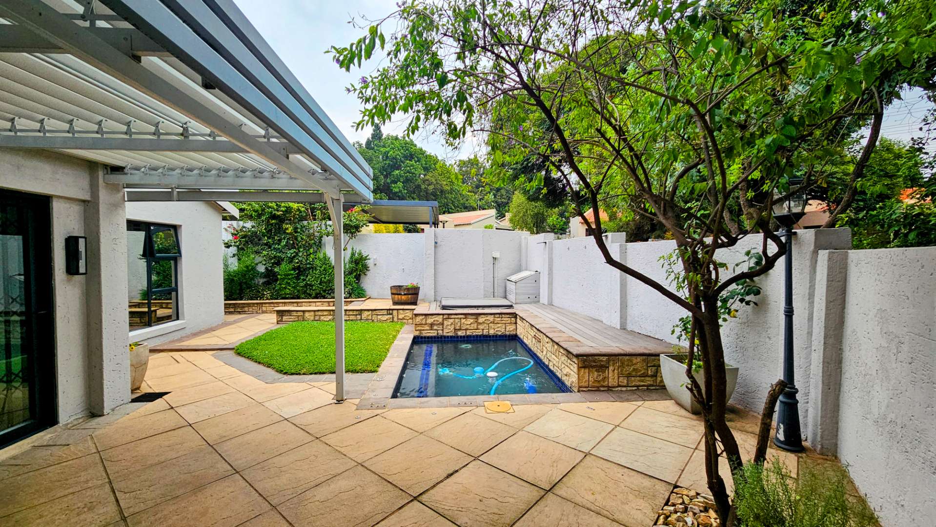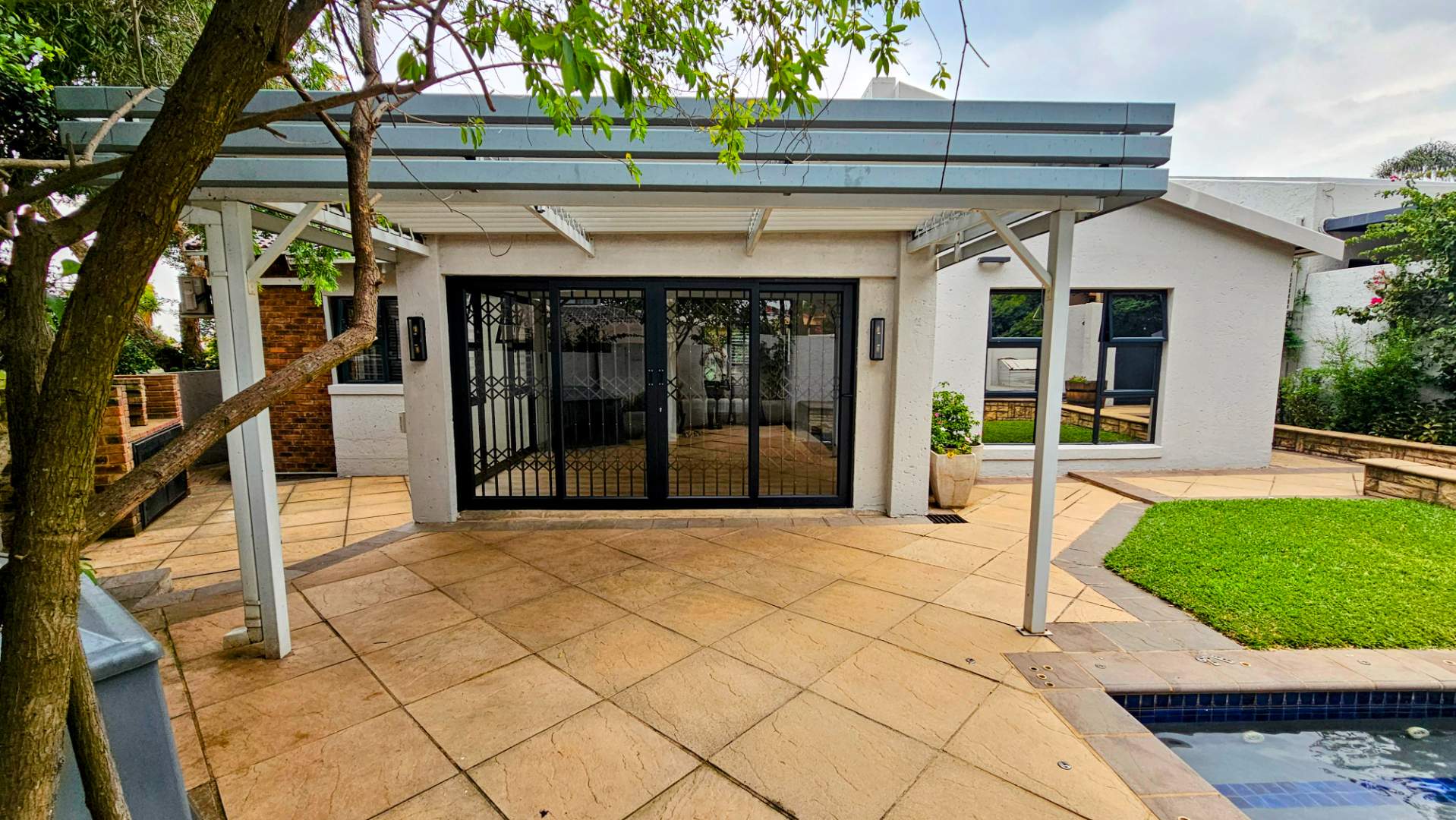 a covered patio overlooking a wrap-around private garden, heated swimming pool,