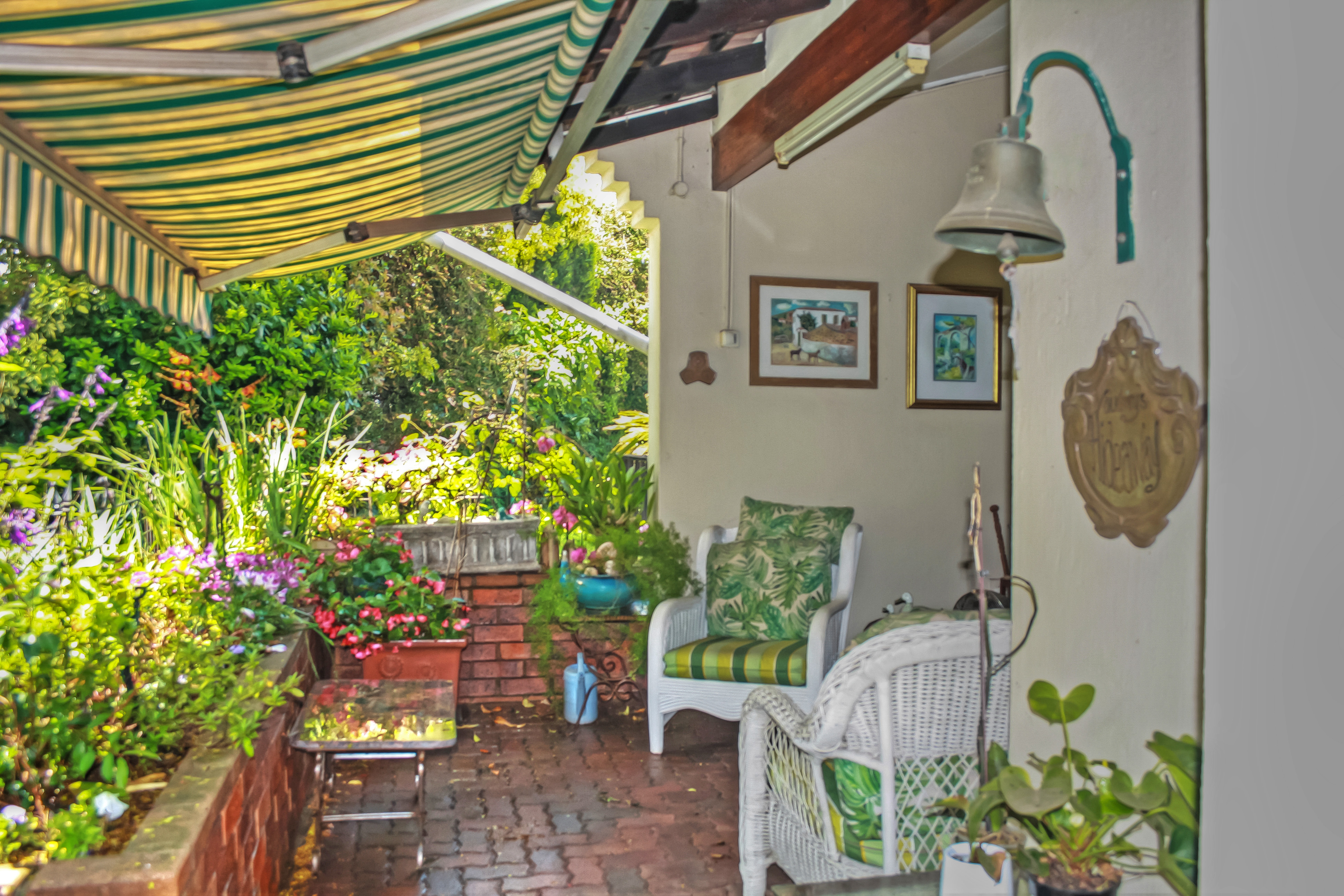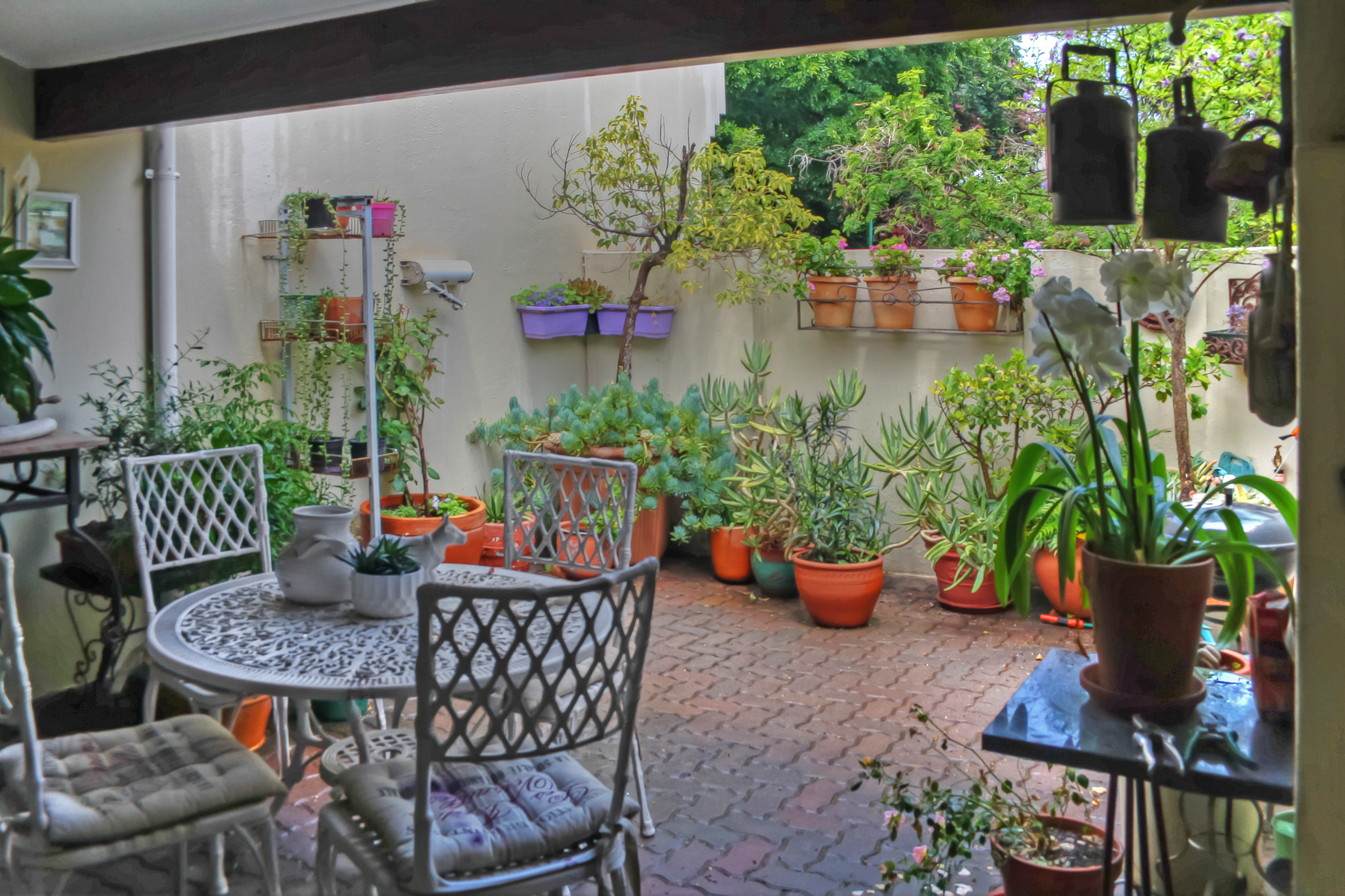 The patio opens onto a lush, established garden, a great spot for morning coffee or relaxed afternoons outdoors.