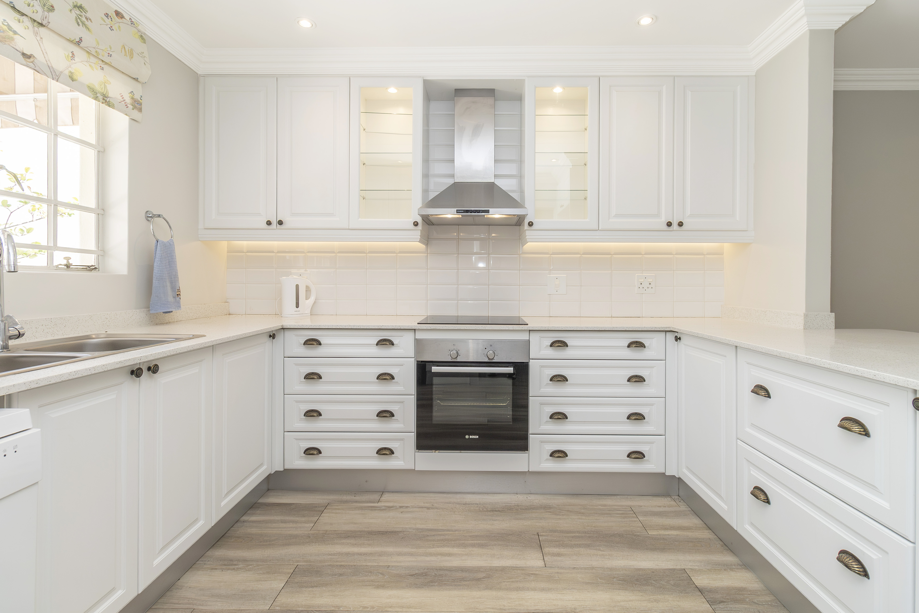 The stylish kitchen, dining room, TV room, and study nook with built in desk flow effortlessly together, adorned with elegant laminate flooring throughout.