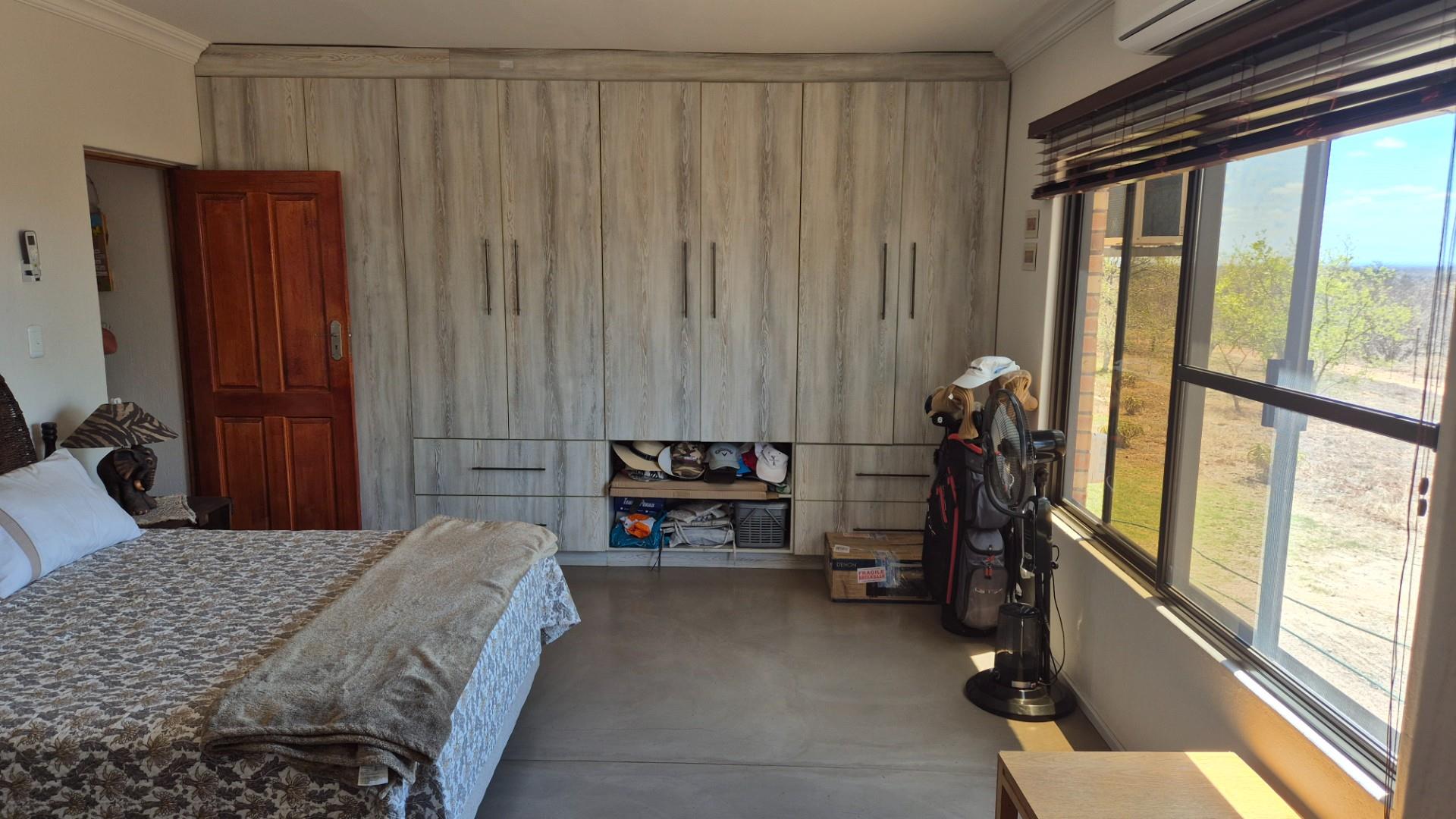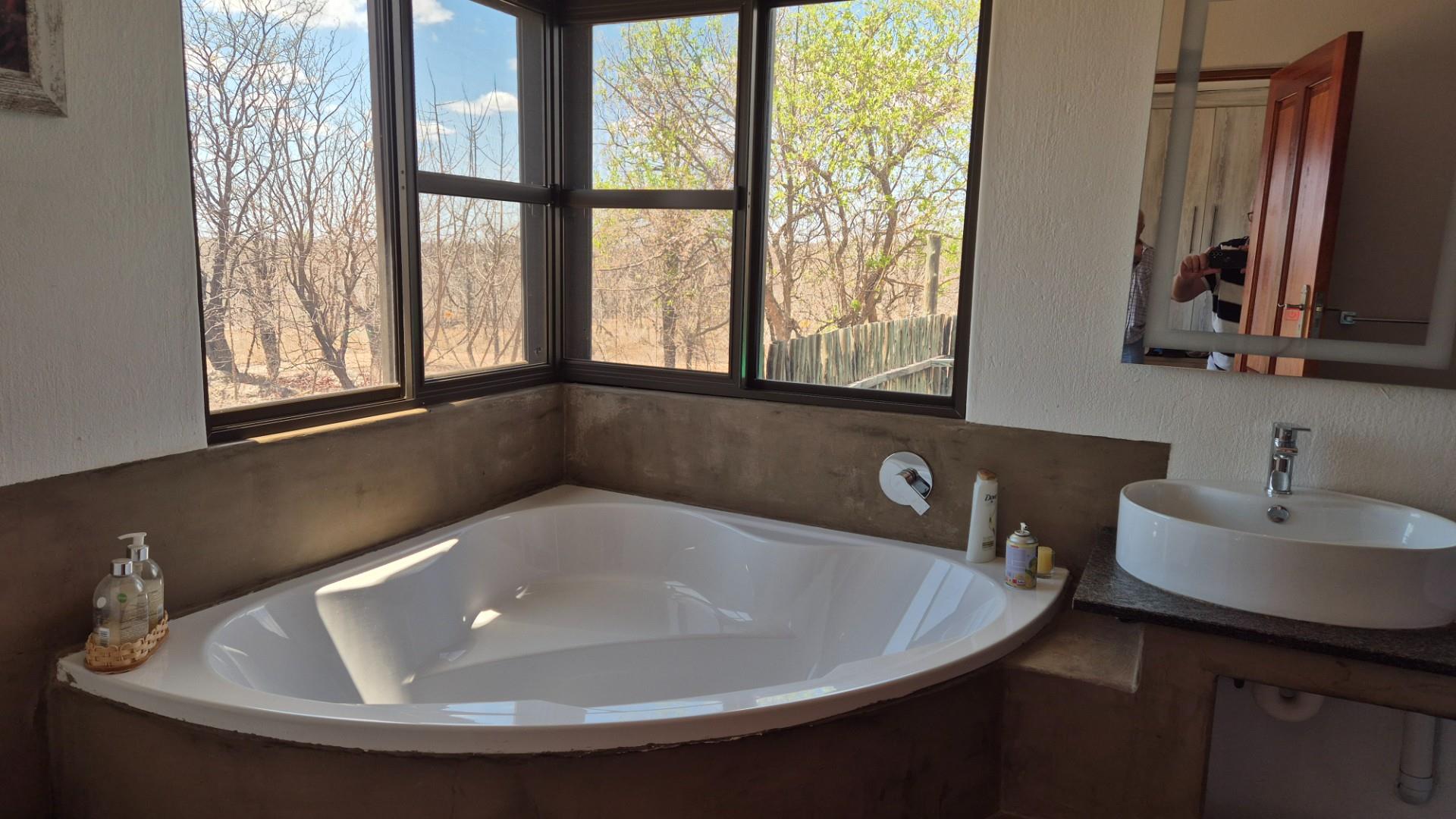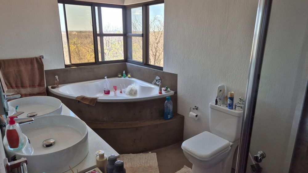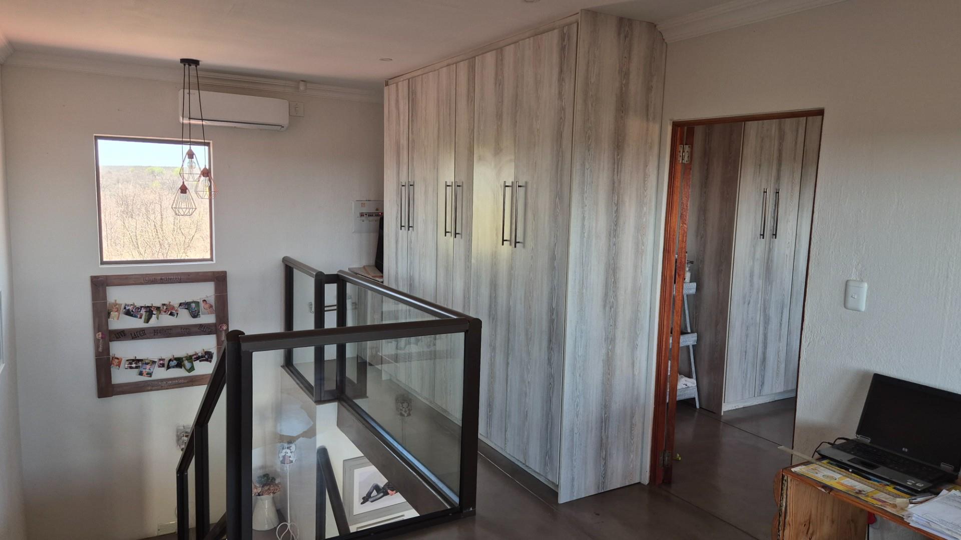 This home has three identical King size bedrooms, all with built-in modern cupboards, air conditioning, full bathroom with bath, shower, toilet and double basin. One on ground floor and the other two on floor above with sliding doors opening onto a veranda with beautiful views into the Kruger National Park. Bathrooms have big windows inviting the African sunlight. A pajama lounge or study splits the upper floor to ensure a play full space, also opening up onto the veranda which is also your view point at sundowner time to watch the Big 5 visiting a waterhole close to the house