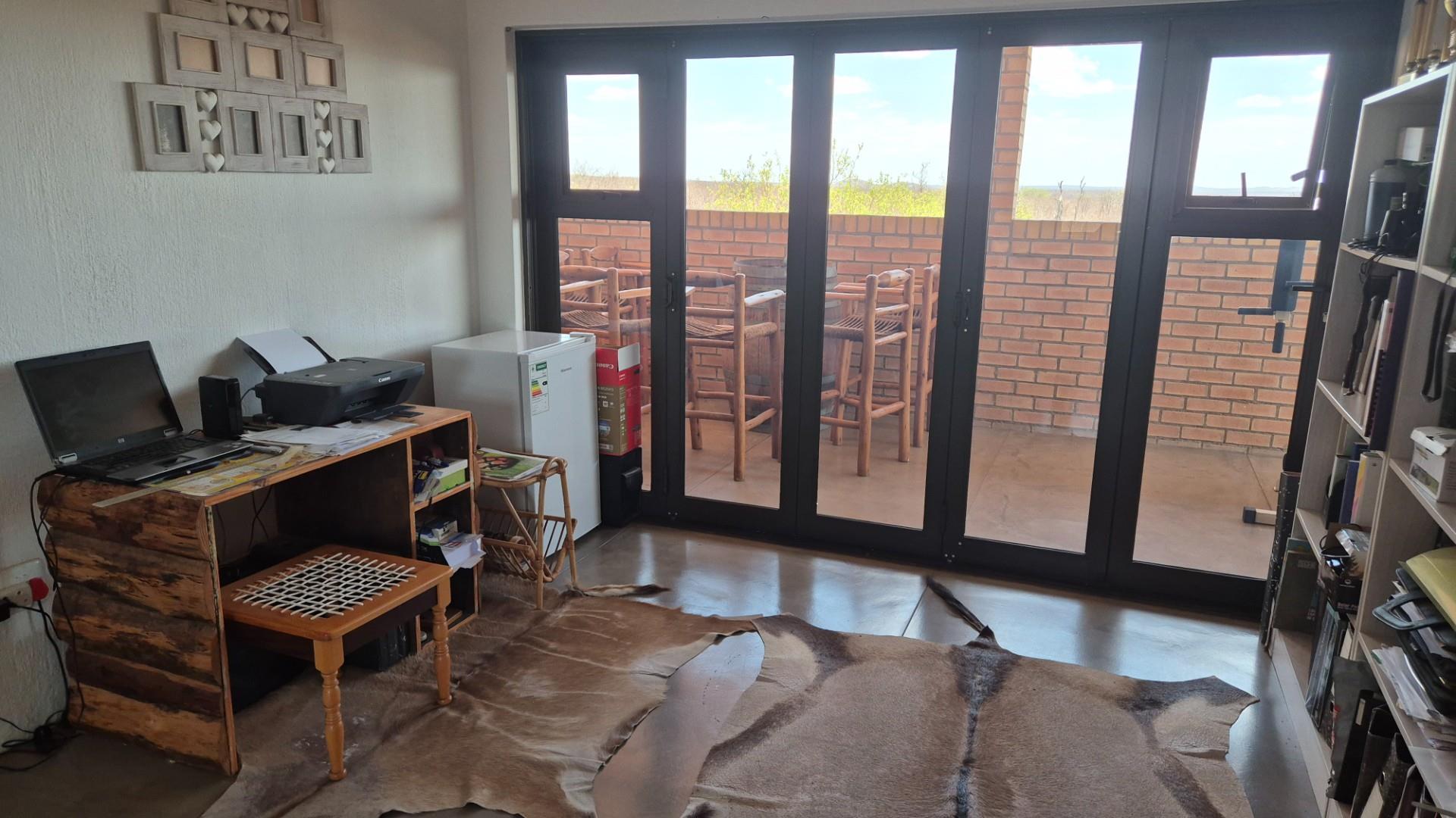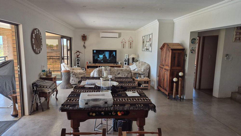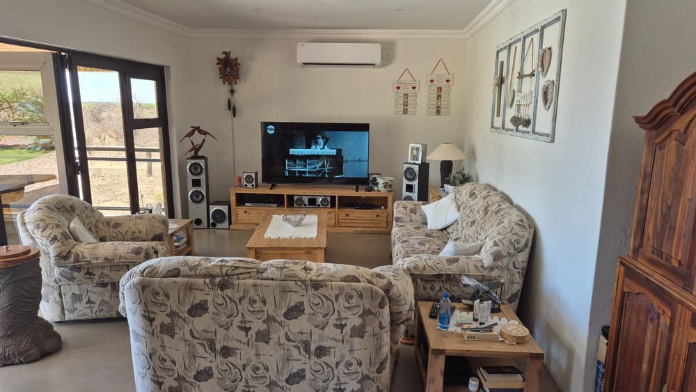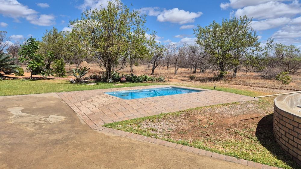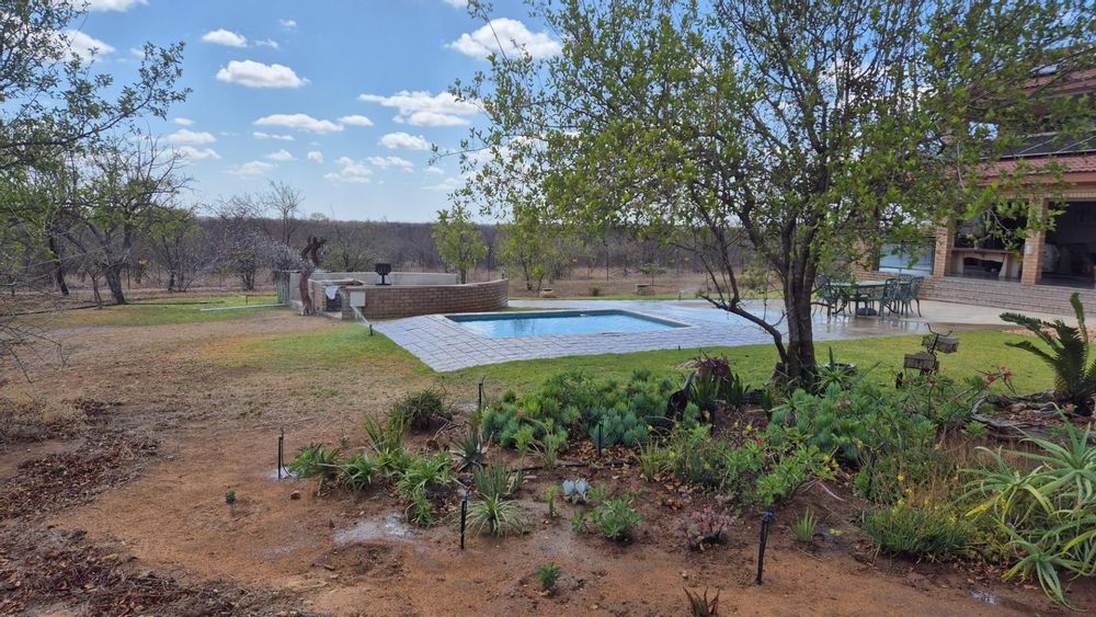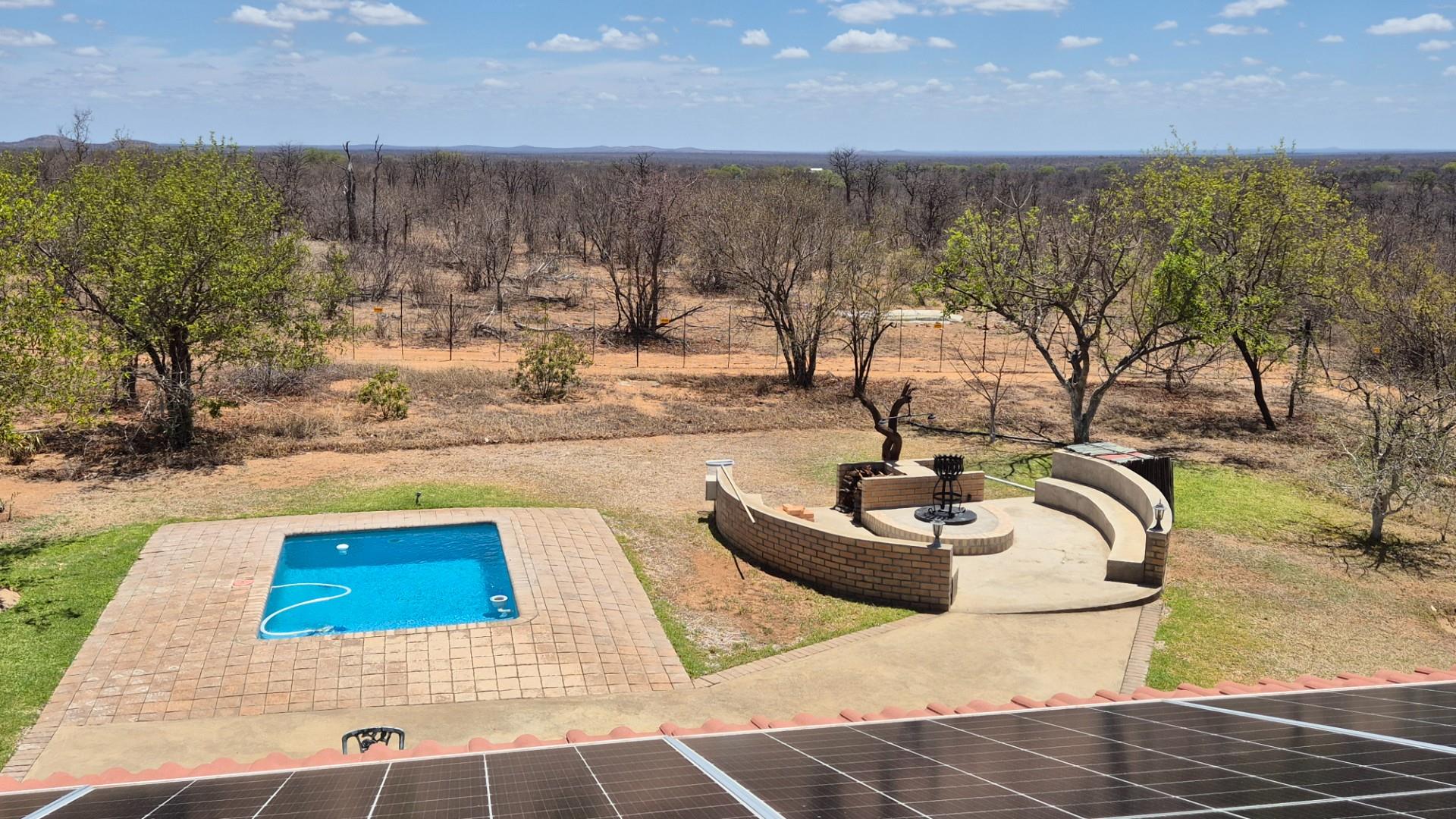 Additional to normal is your own movie theatre and entertainment area, especially for the entire family relaxation time. A spacious veranda for dining and lounging with built in braai ensure your outside family time is just as enjoyable, overlooking a sparkling pool and boma area . All set in a garden designed to accentuate the peaceful environment, fully irrigated with green lawn. Water for garden from a private borehole and a 2500 liter tank ensures you have enough water all year round. Drinking water supplied by the municipality. You are totally off- grid as the solar system has batteries to store 20KW, invertor for 10 KW and enough sun panels for 14 KW. Although you have 21 ha for yourself some 3000m2 is electrical fenced off and surrounds the house and garden area, even snake distracting fencing.