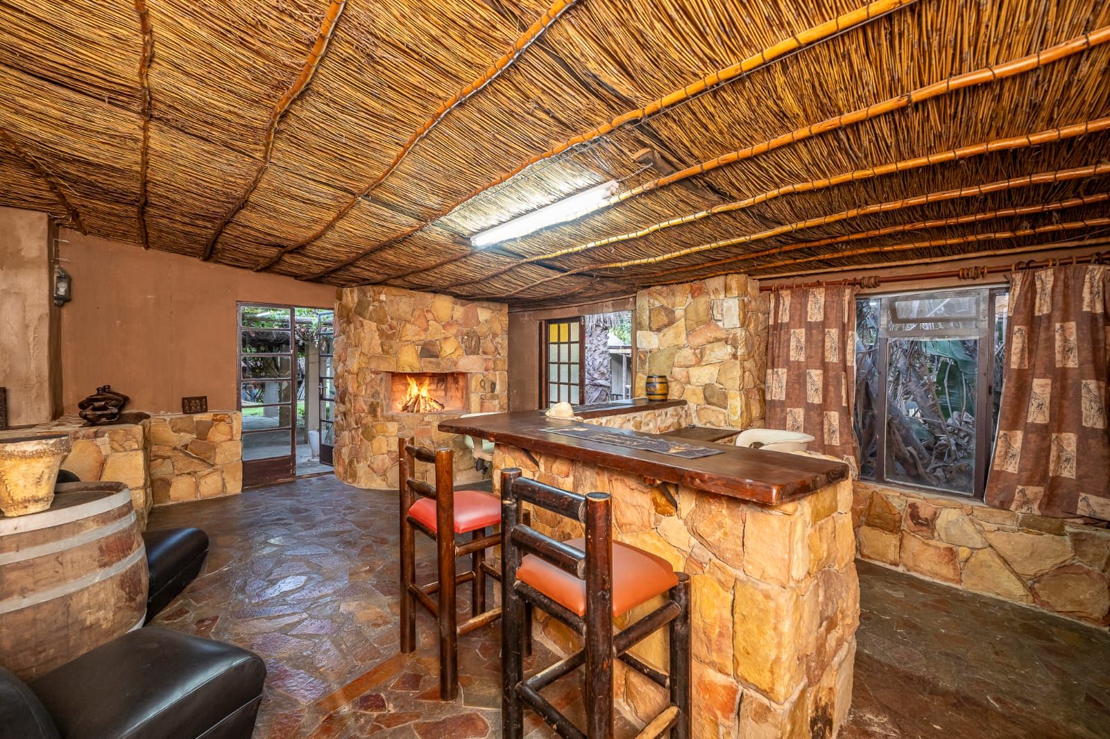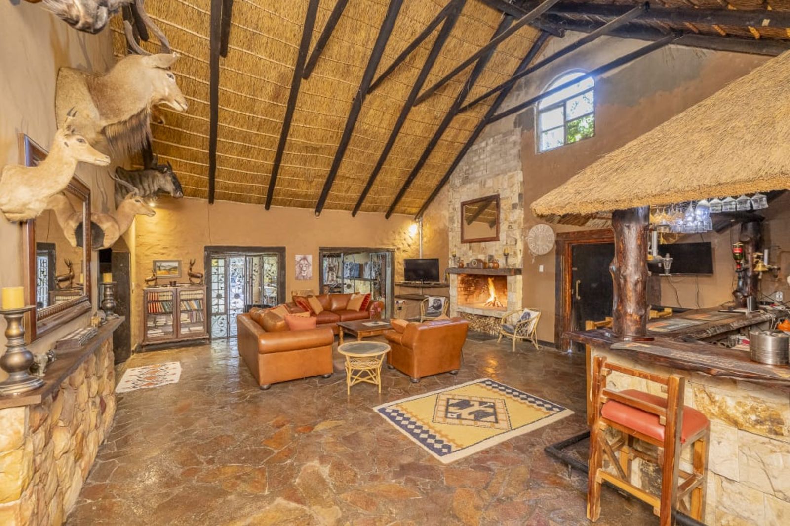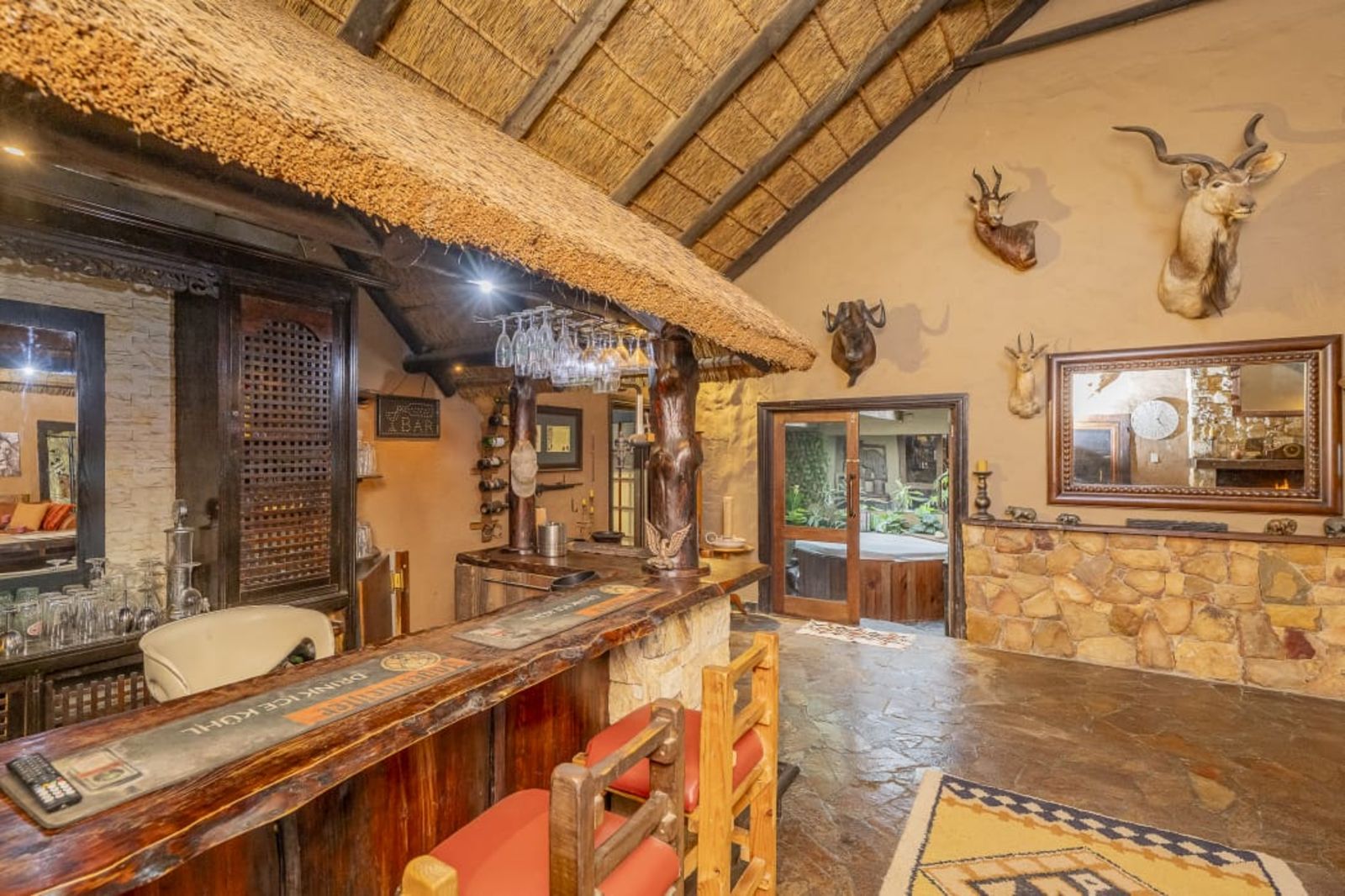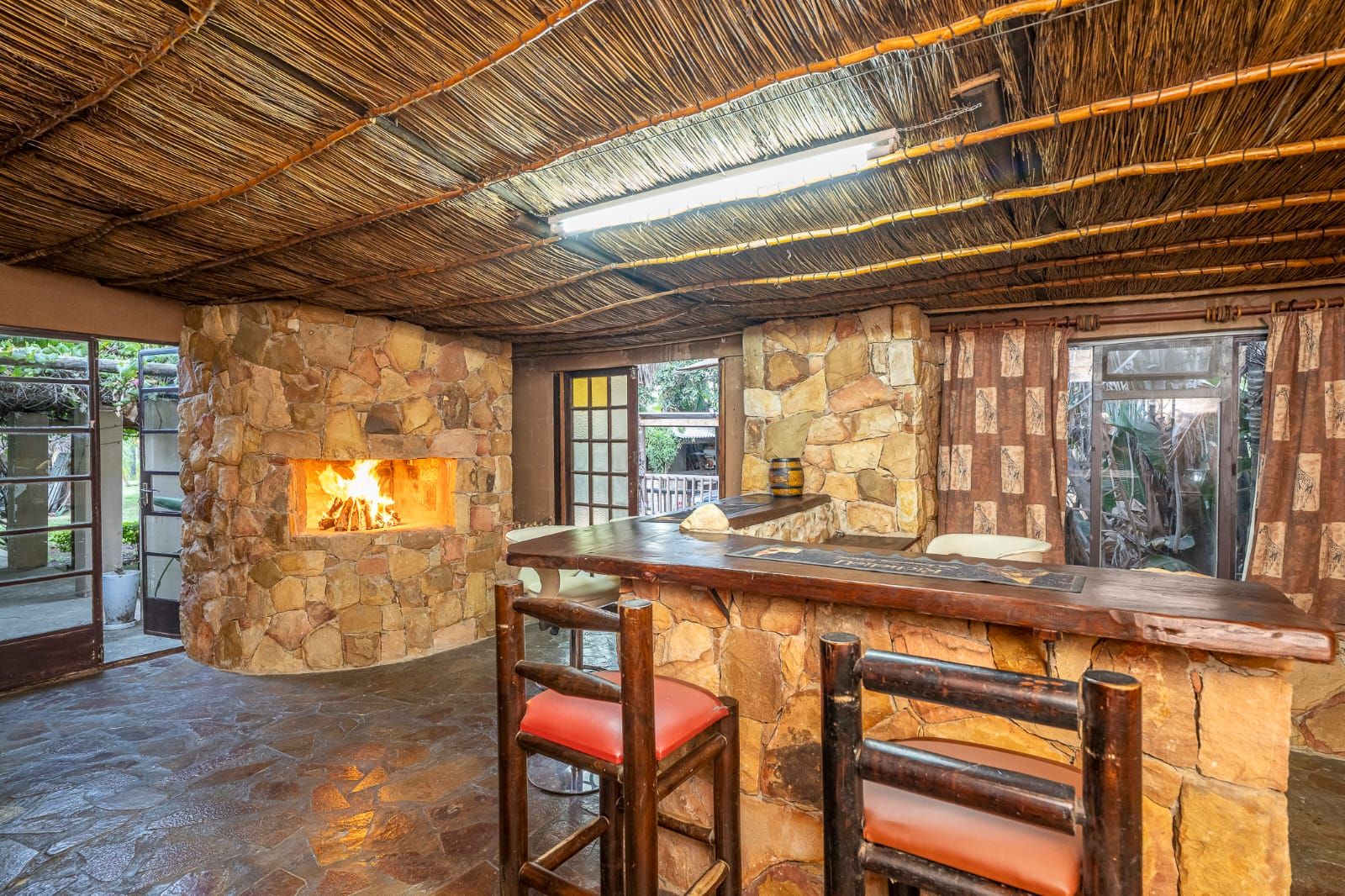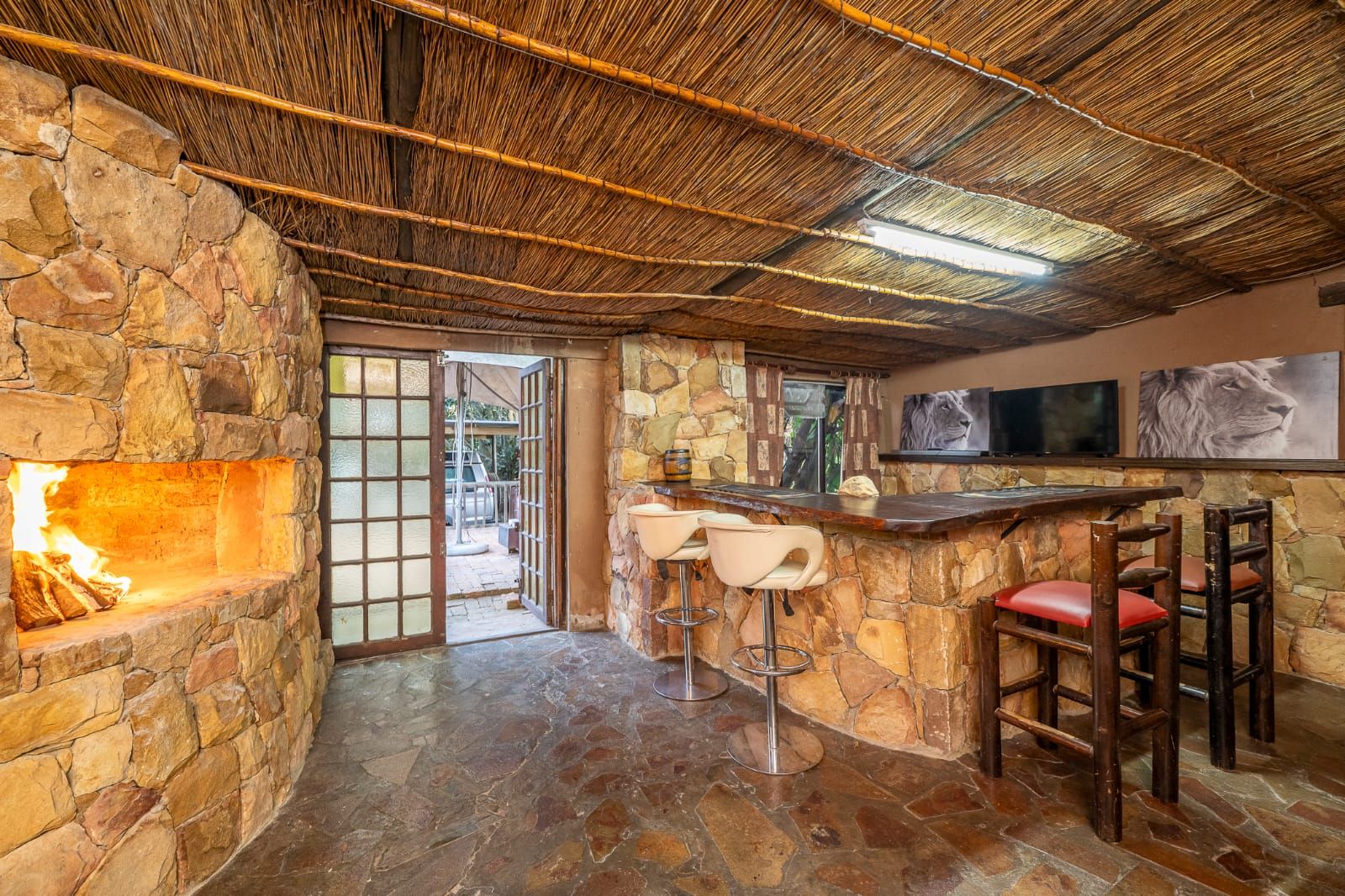 Safari Lodge-Style Retreat: (Main house) This unique home offers an indoor fireplace and braai room, an outdoor Lapa and braai area, a jacuzzi room, bar, wine cellar, beautifully landscaped gardens, a duck pond, and an impressive double entrance.