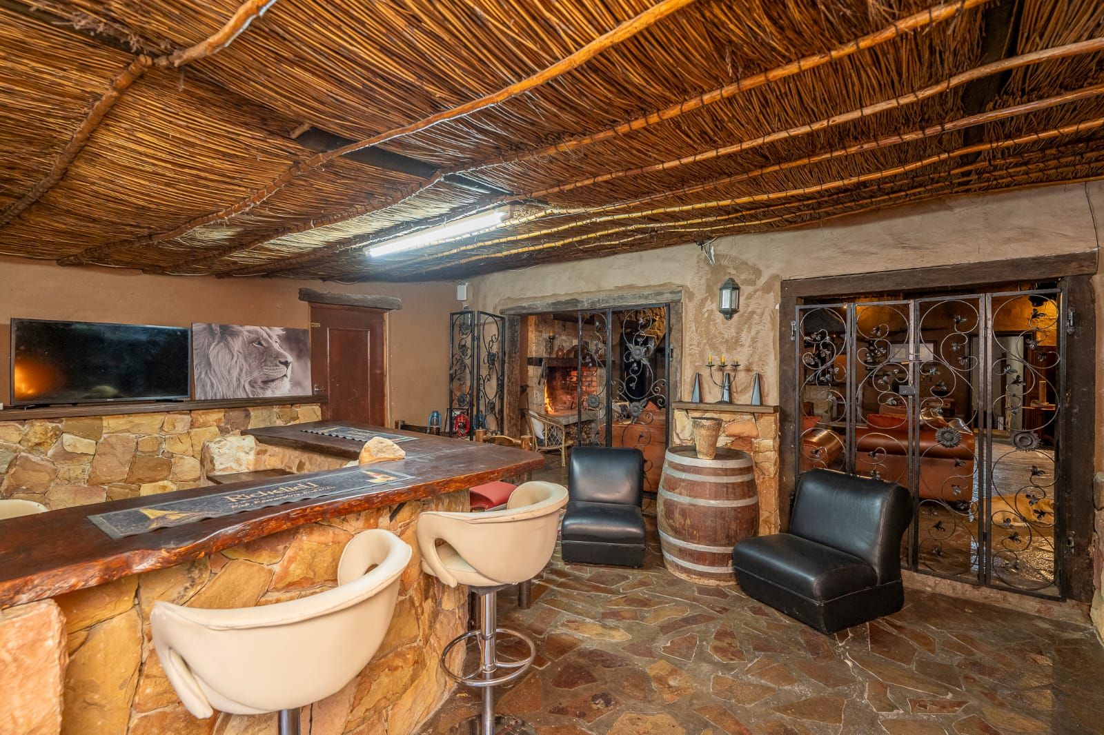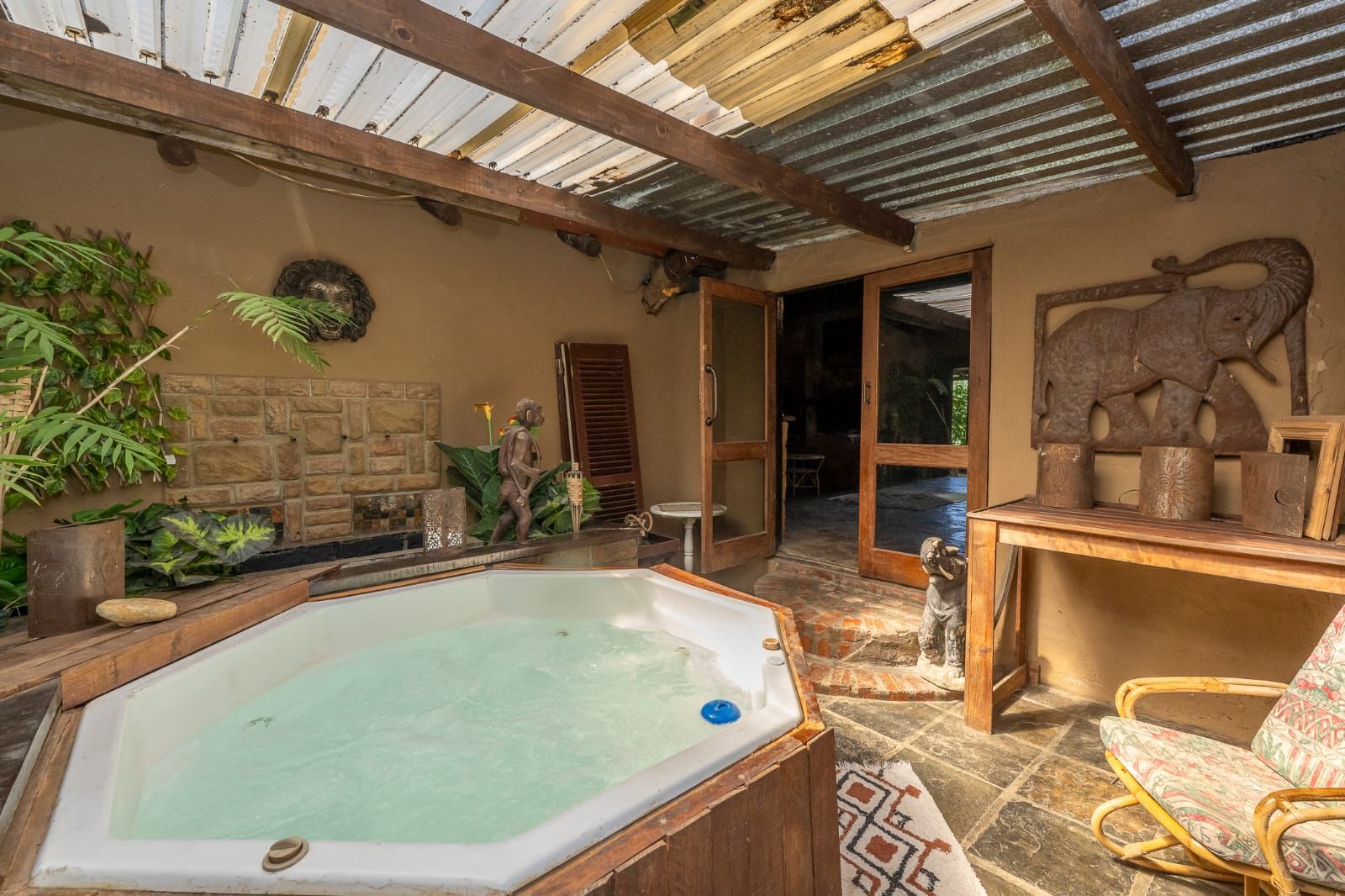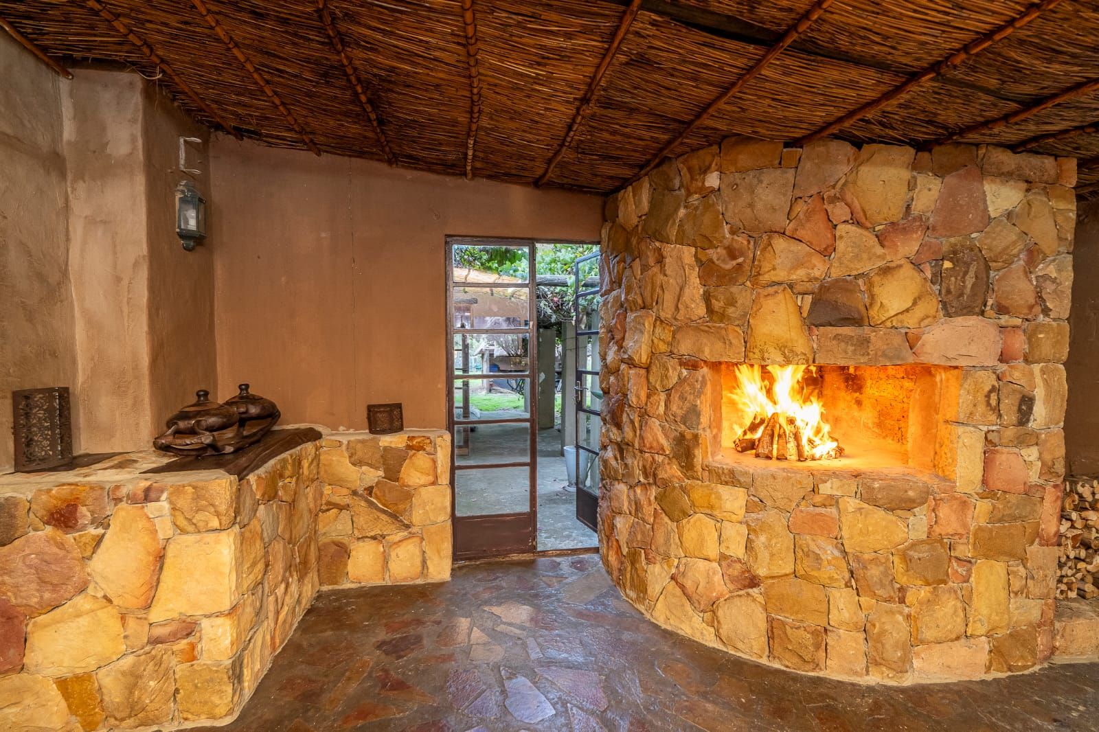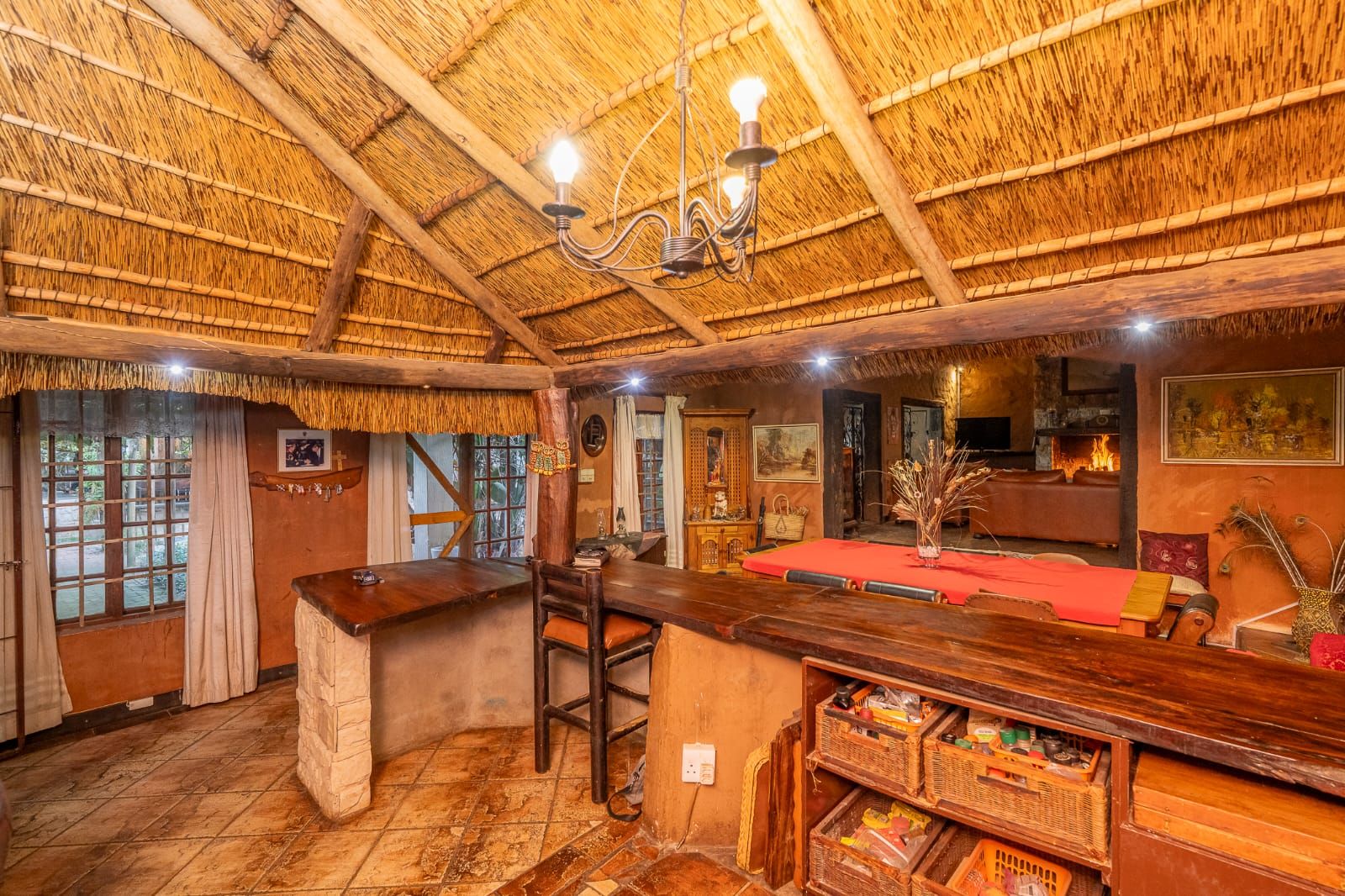 Safari Lodge-Style Retreat: (Main house) This unique home offers an indoor fireplace and braai room, an outdoor Lapa and braai area, a jacuzzi room, bar, wine cellar, beautifully landscaped gardens, a duck pond, and an impressive double entrance.