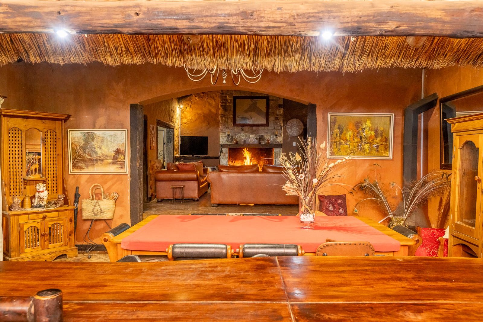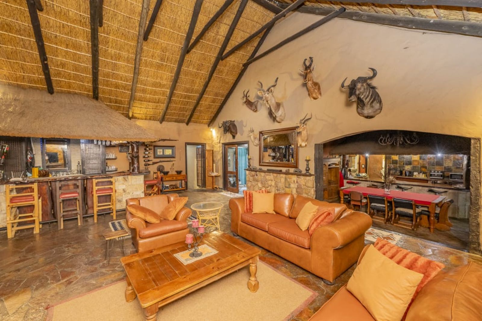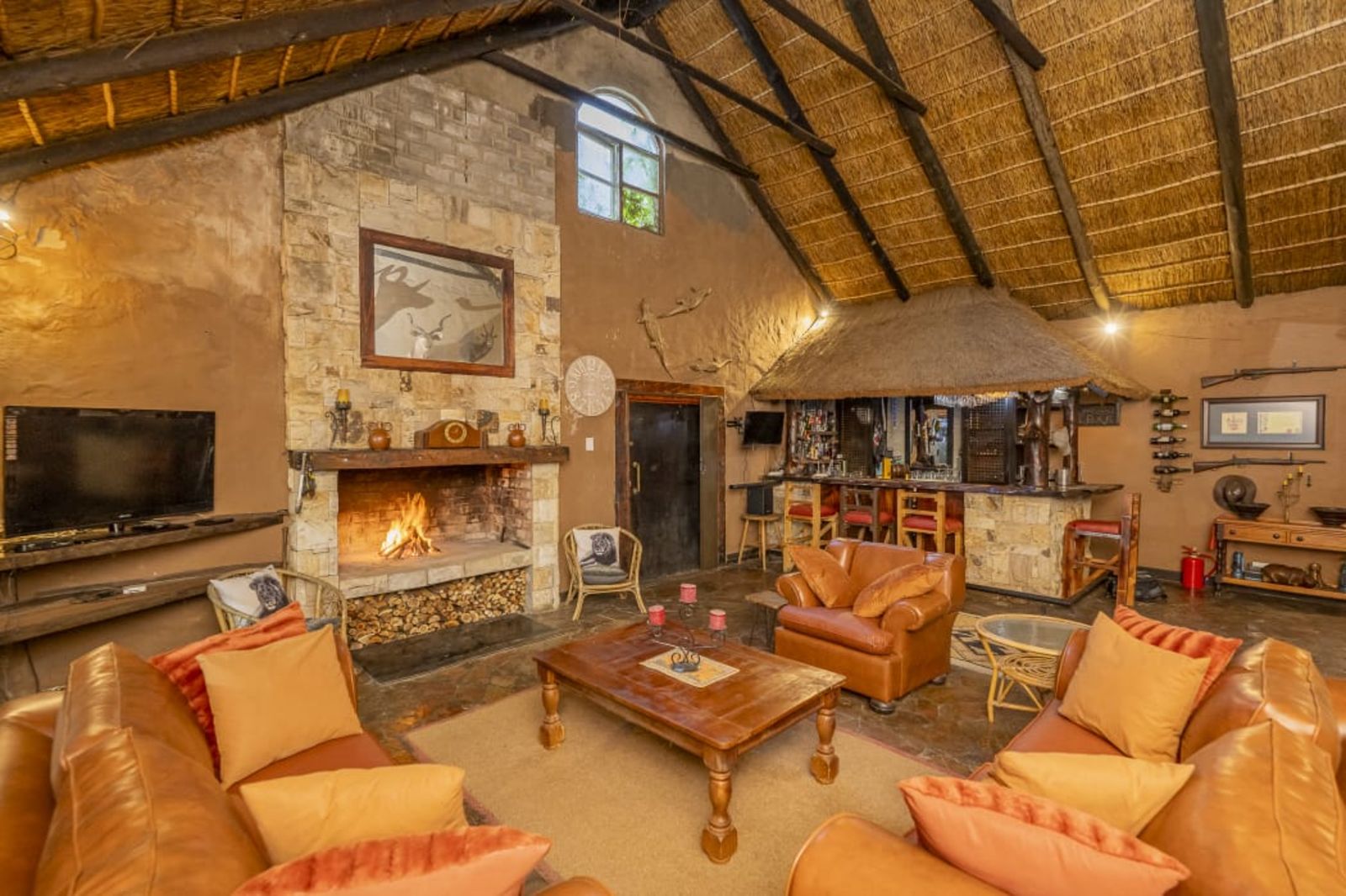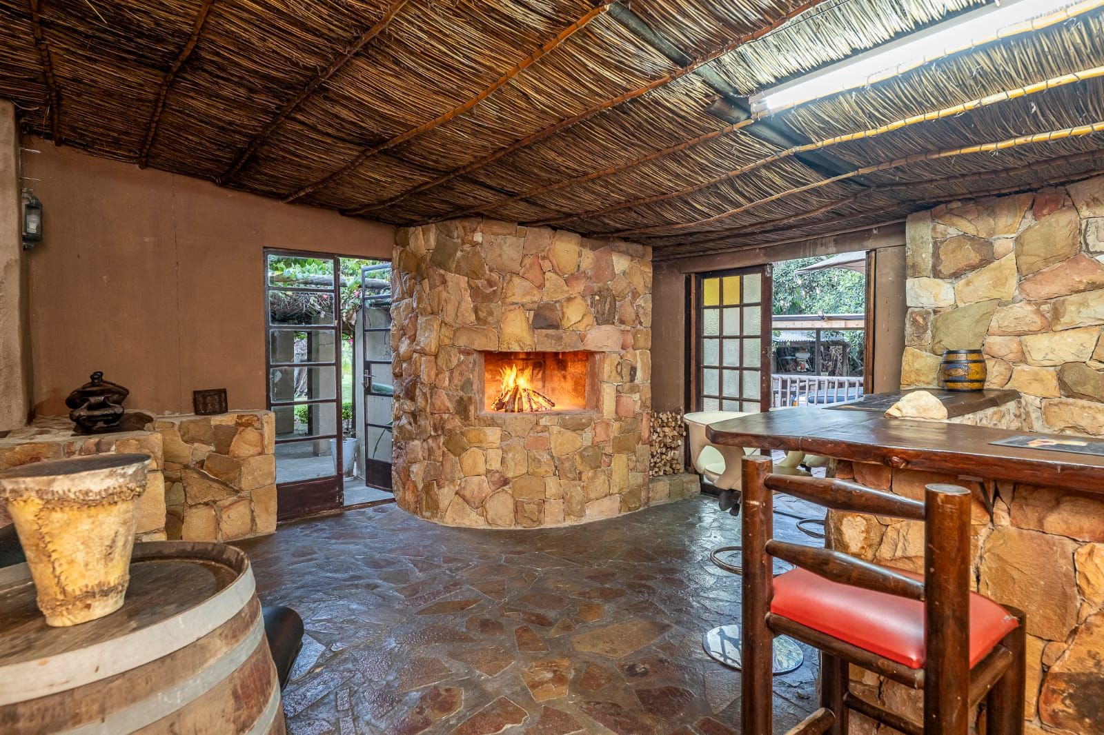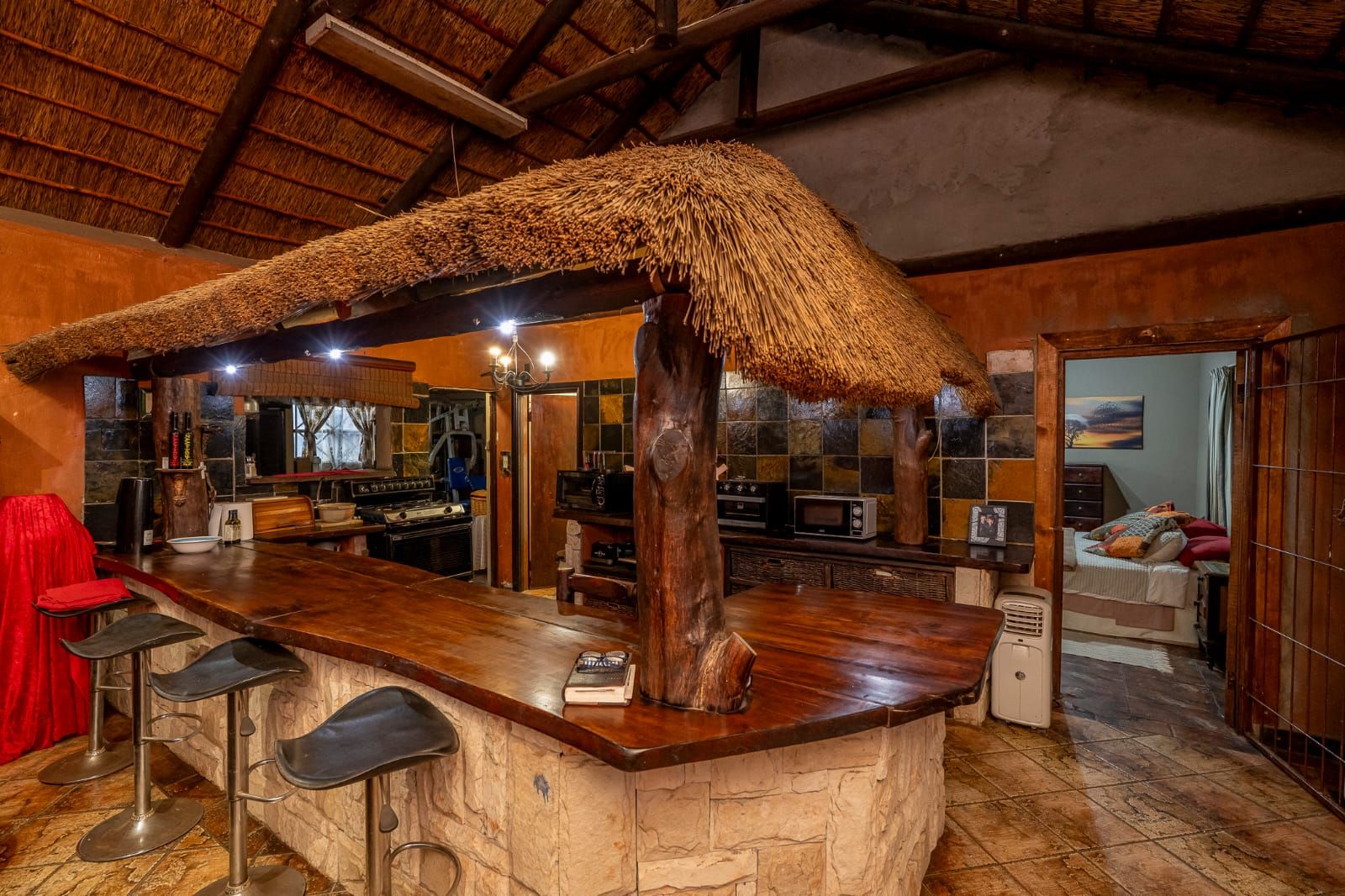 Safari Lodge-Style Retreat: (Main house) This unique home offers an indoor fireplace and braai room, an outdoor Lapa and braai area, a jacuzzi room, bar, wine cellar, beautifully landscaped gardens, a duck pond, and an impressive double entrance.
