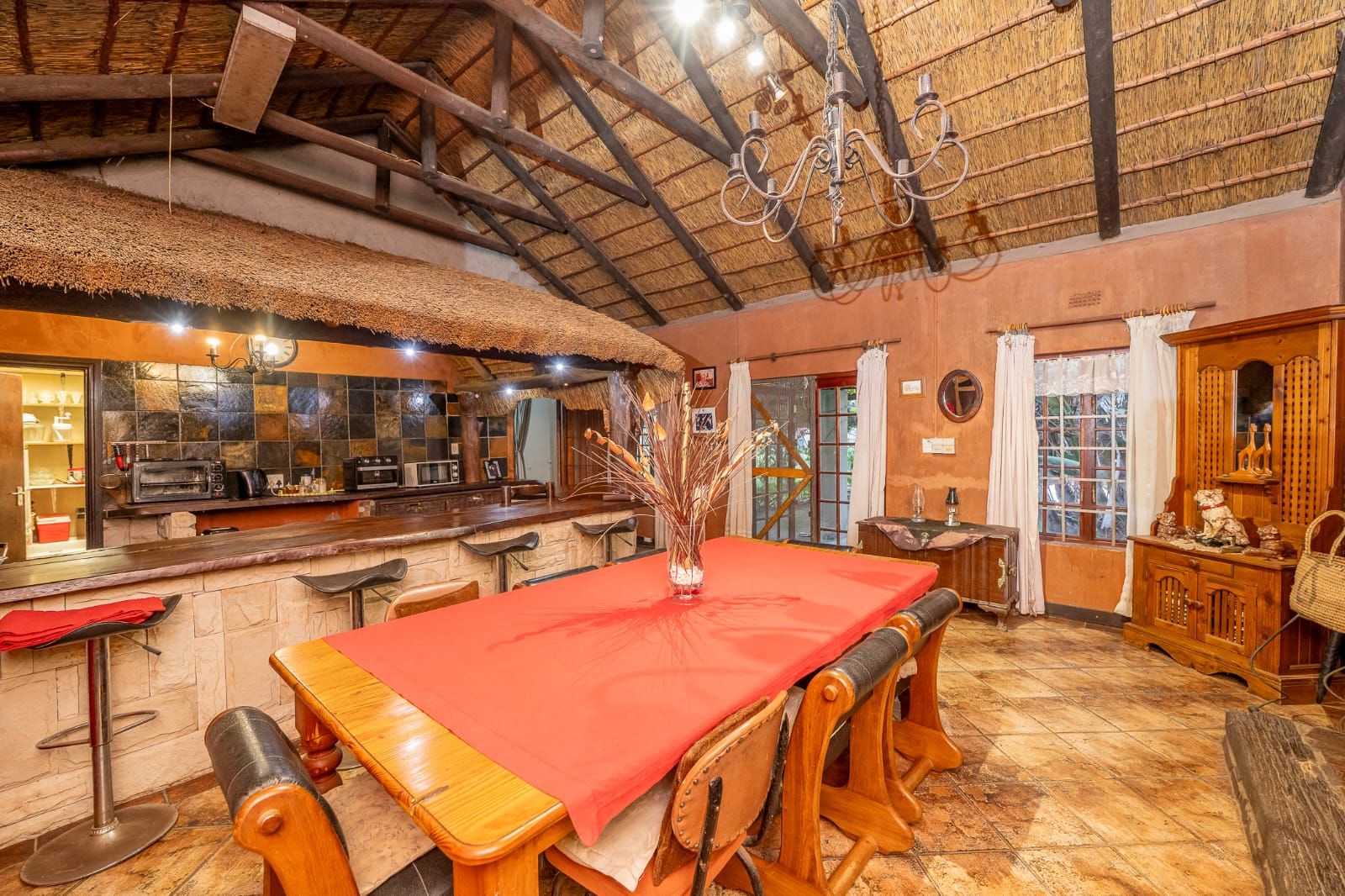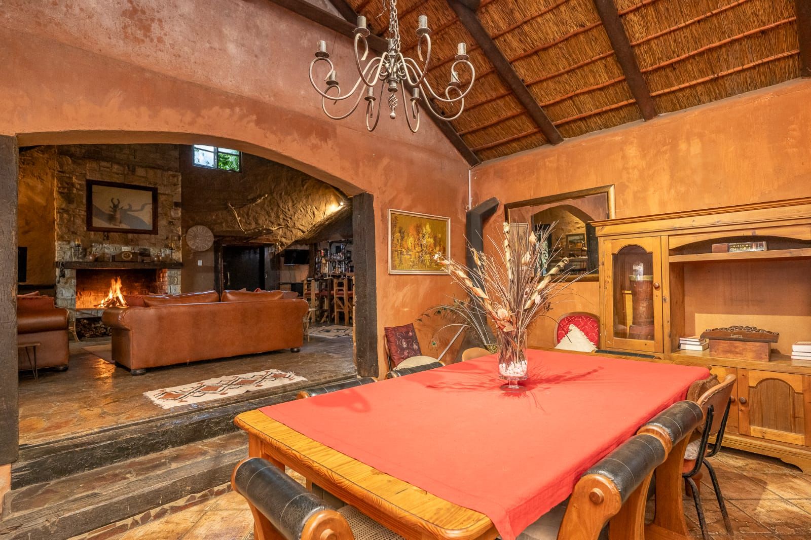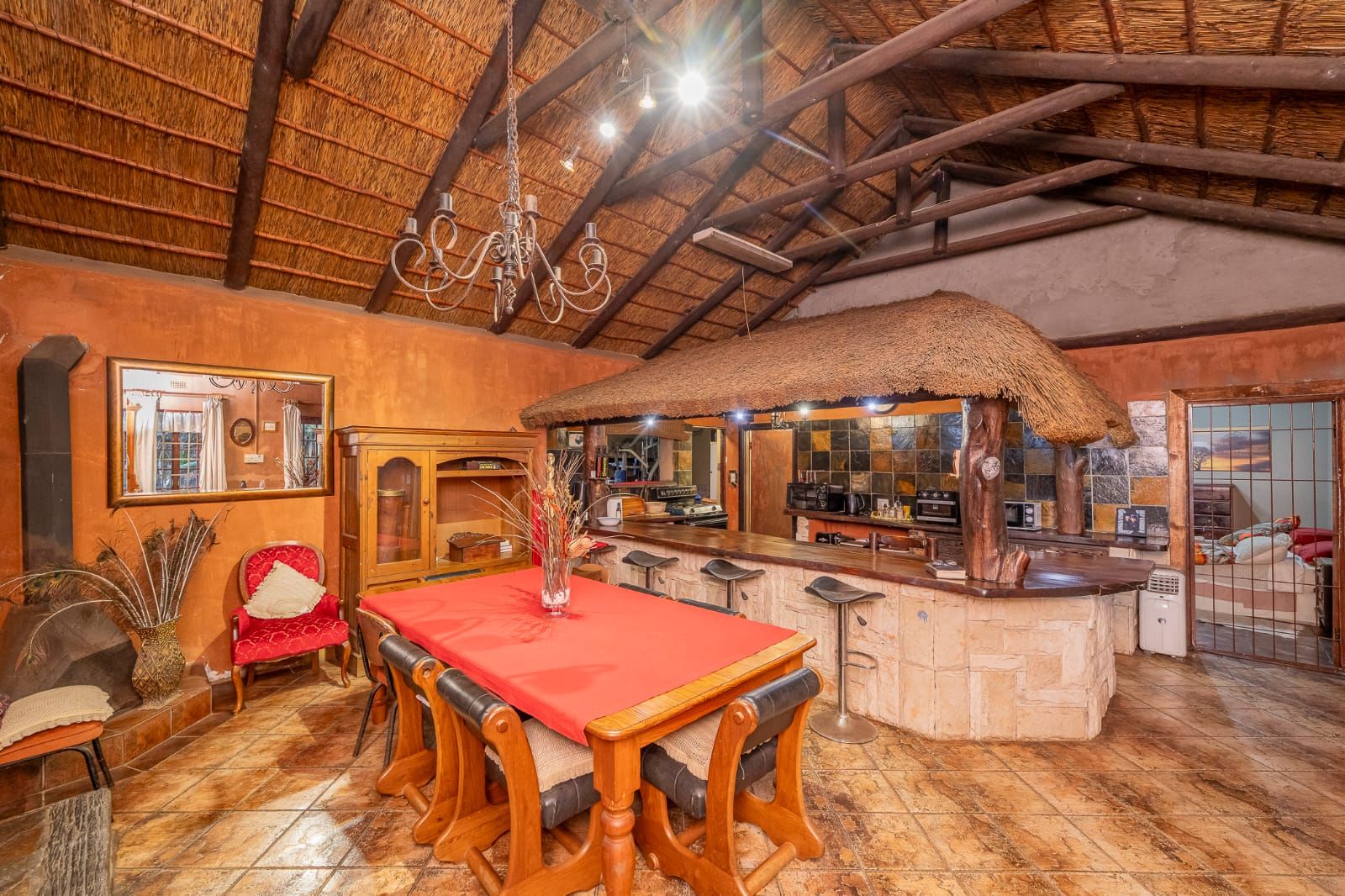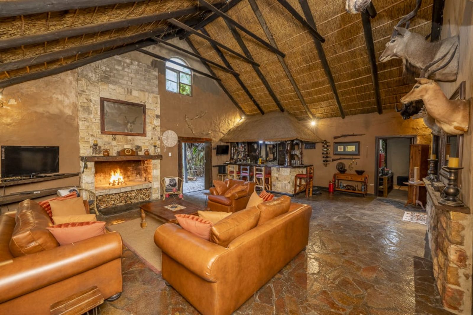 Safari Lodge-Style Retreat: (Main house) This unique home offers an indoor fireplace and braai room, an outdoor Lapa and braai area, a jacuzzi room, bar, wine cellar, beautifully landscaped gardens, a duck pond, and an impressive double entrance.