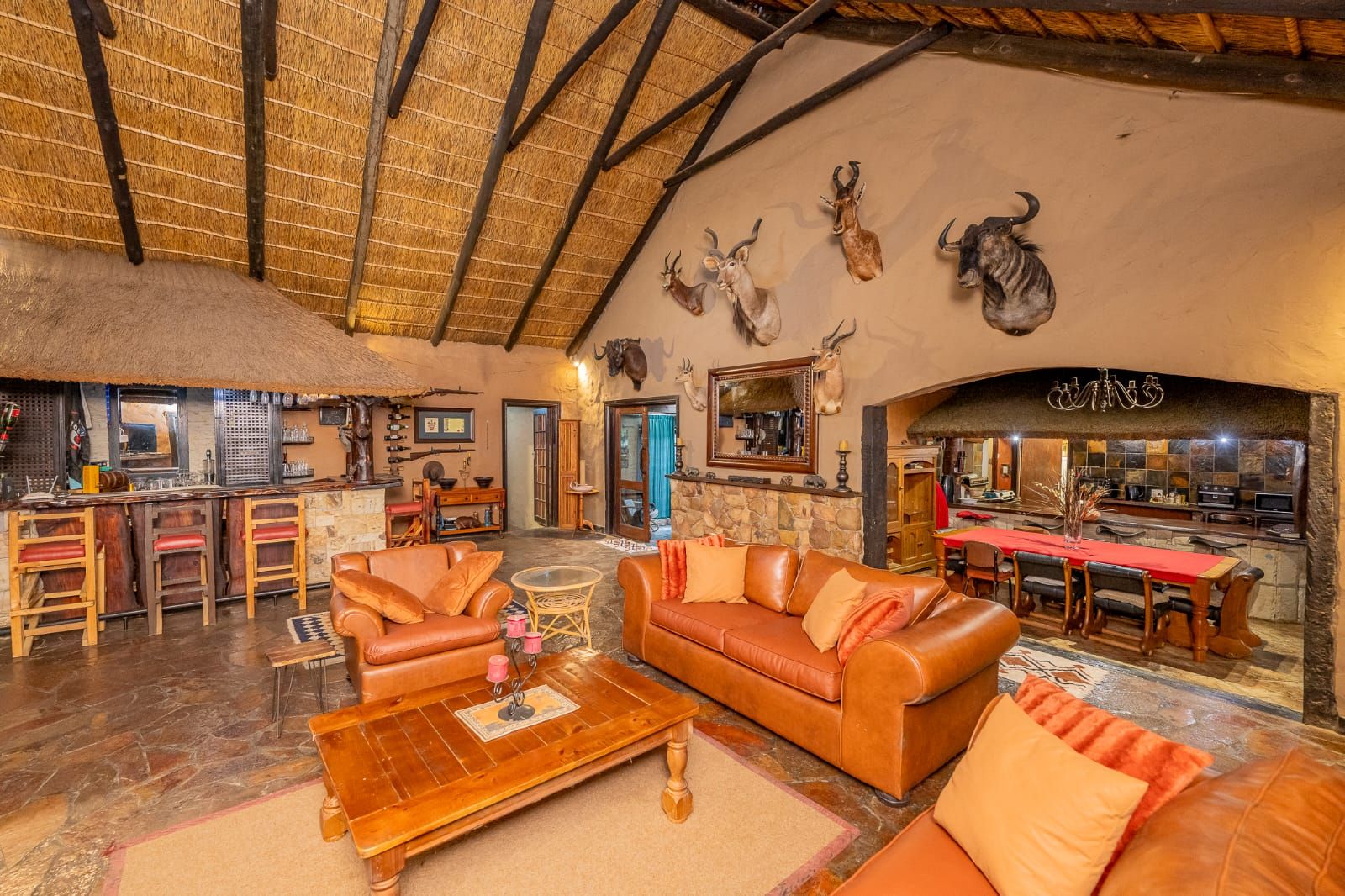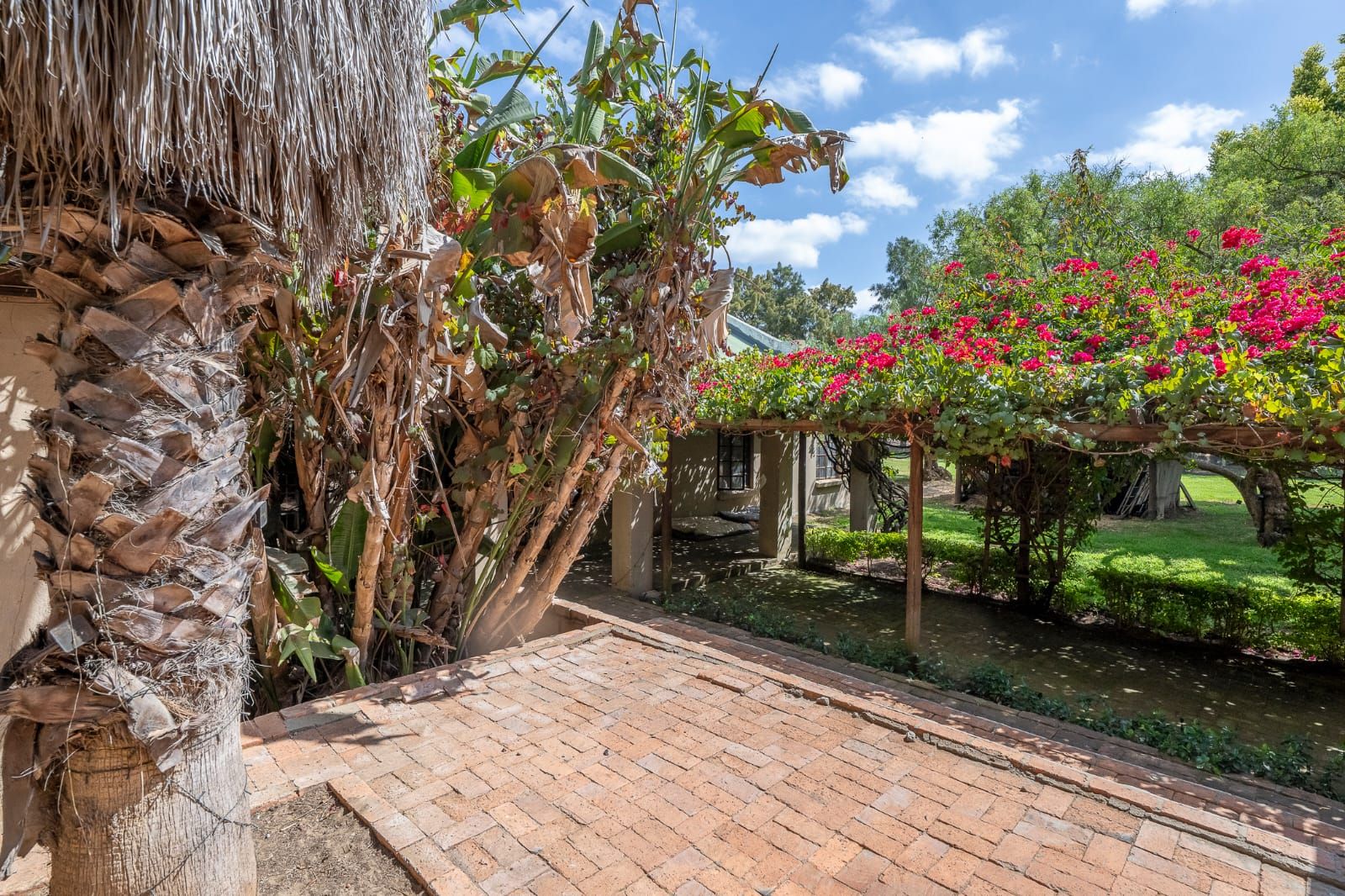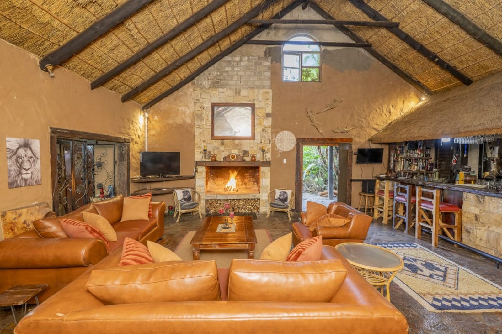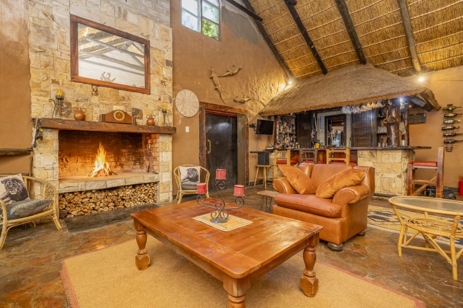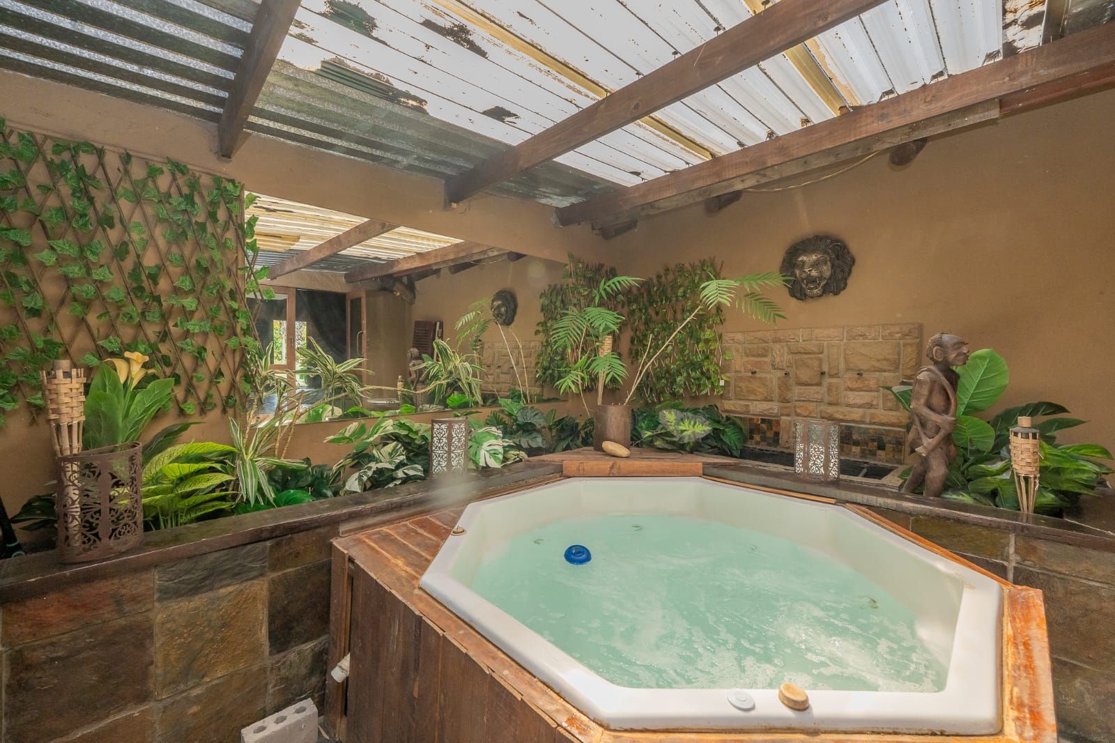 Safari Lodge-Style Retreat: (Main house) This unique home offers an indoor fireplace and braai room, an outdoor Lapa and braai area, a jacuzzi room, bar, wine cellar, beautifully landscaped gardens, a duck pond, and an impressive double entrance.