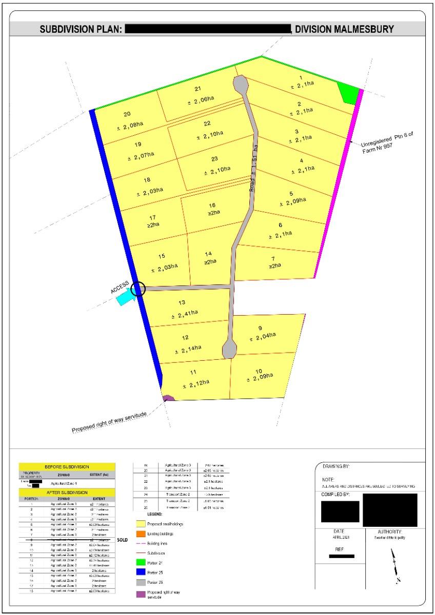 The development framework provides for 22 rural lifestyle portions of approximately 2 hectares each, excluding the existing separately registered 2.3-hectare subdivision.