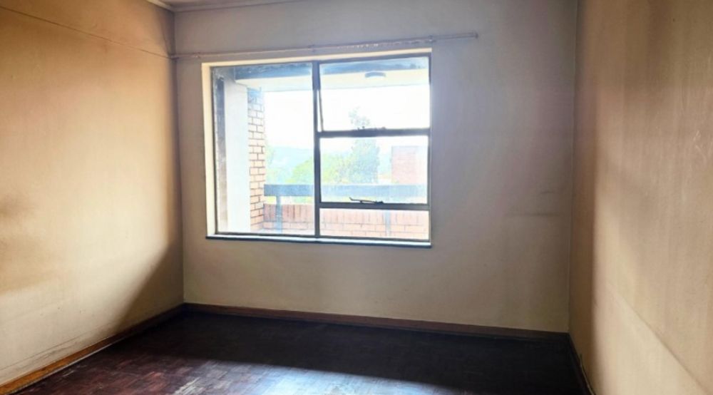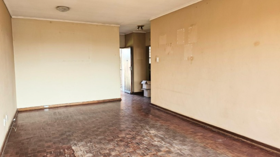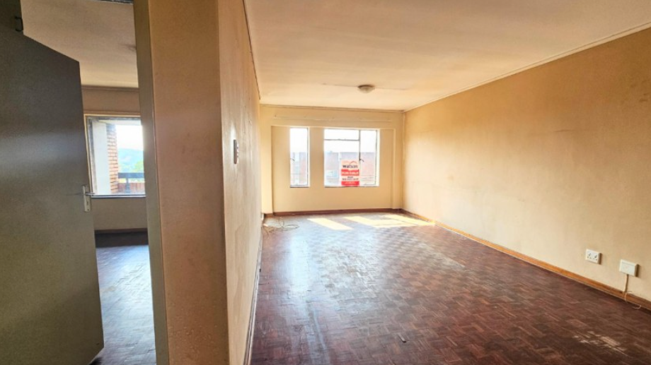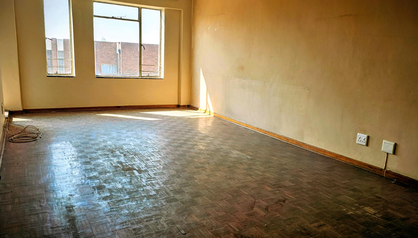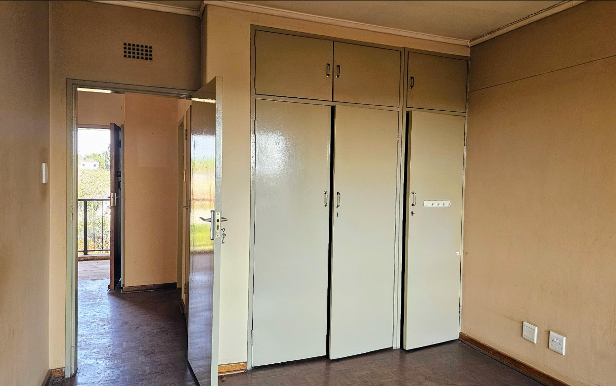 One spacious bedroom with parquet flooring, built-in cupboards, need some TLC.
