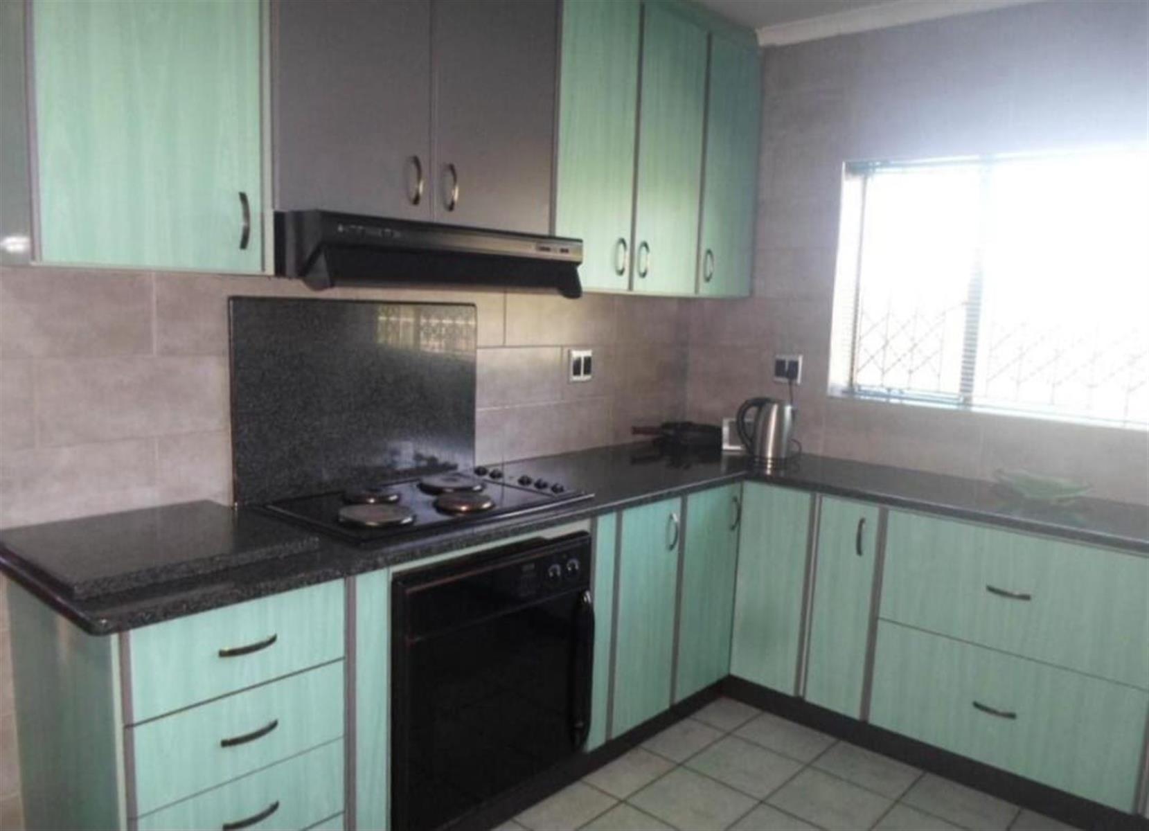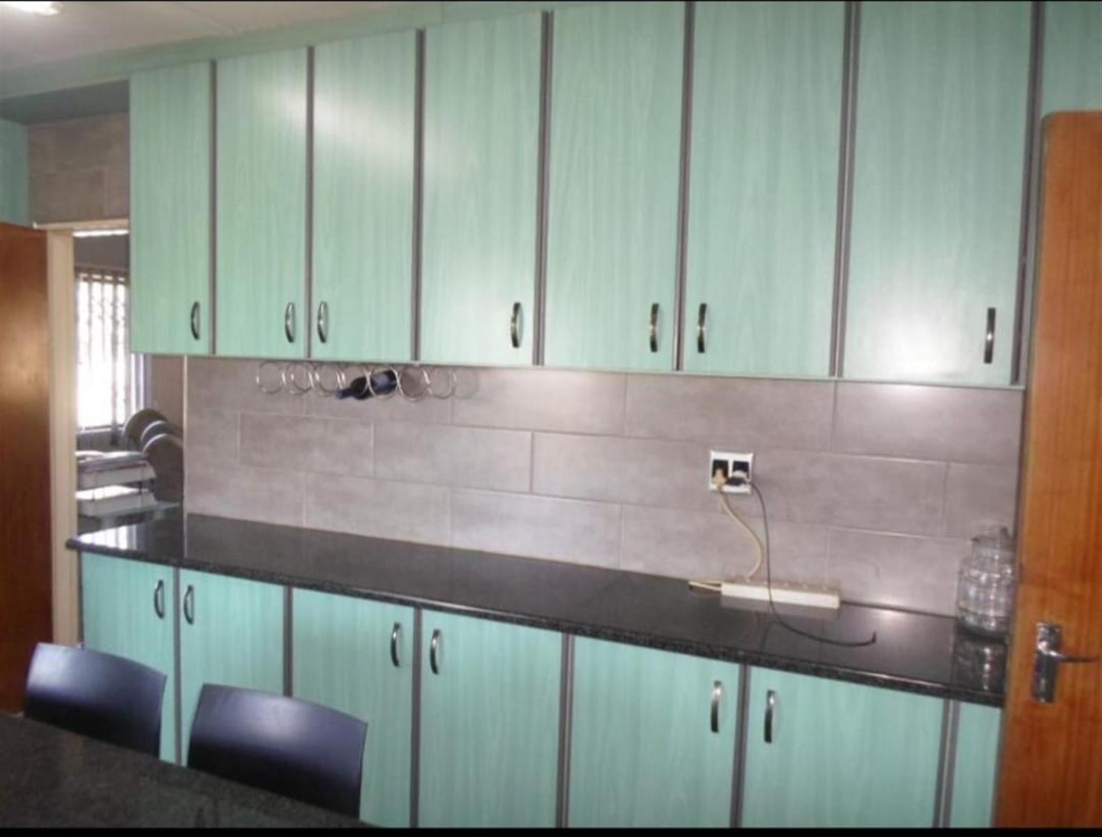 The home includes a lounge and dining room, ideal for family living and entertaining. The large kitchen is a standout feature, fitted with granite countertops, ample built-in cupboards, and tiled floors. A scullery as large as the kitchen, also fully fitted with cupboards, offers exceptional storage and workspace.