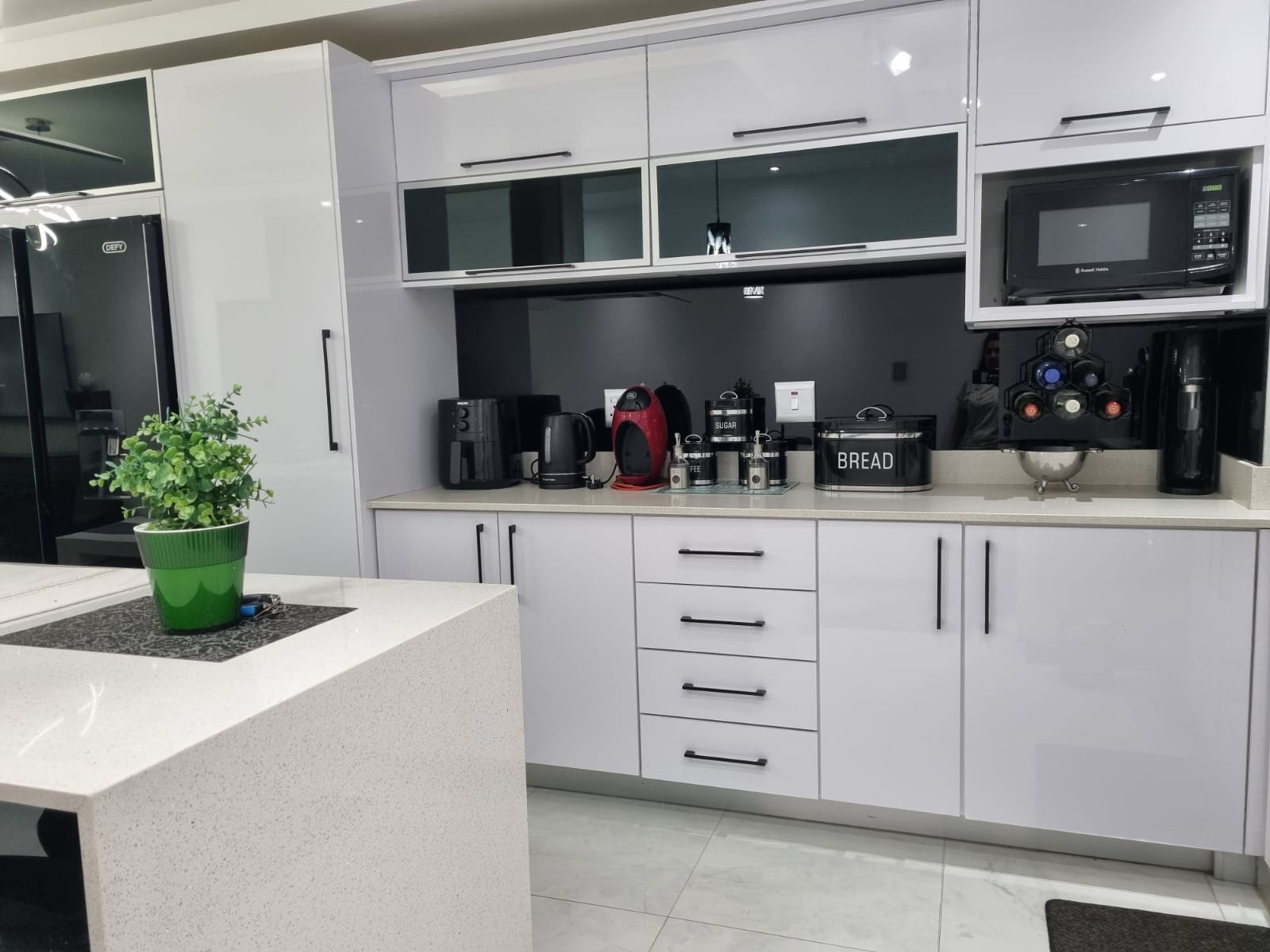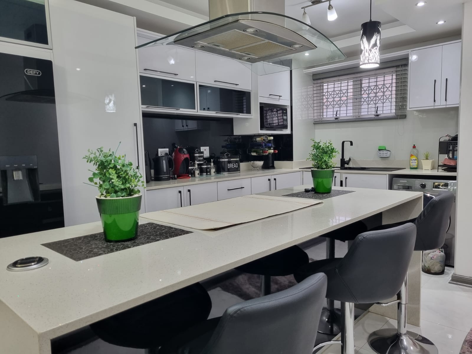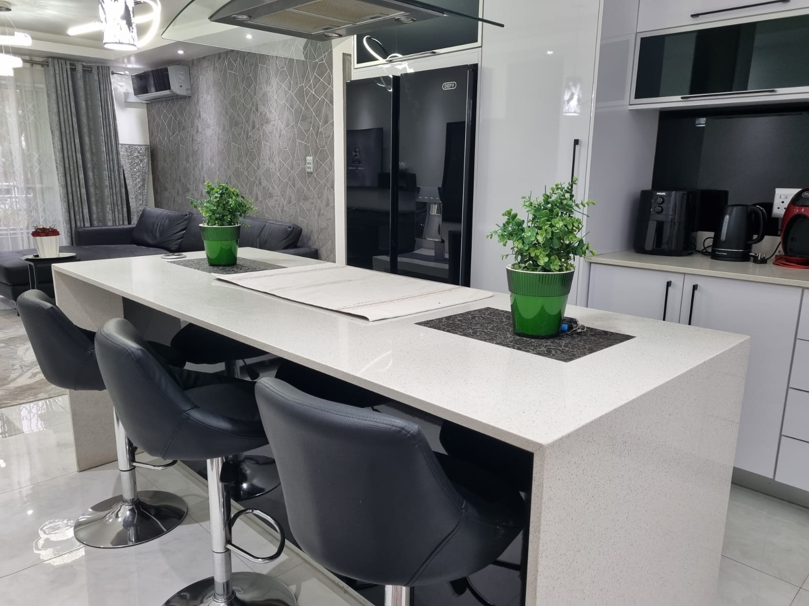 Culinary enthusiast's will delight in the kitchen, which is fully fitted with high gloss cupboard's, a center island equipped with a glass stop stove, extractor, and quartz stone counter tops, tastefully completed with sleek porcelain tiles. It is also conveniently plumbed for a washing machine and boast's a double bowel kitchen sink, complete with blinds for privacy.