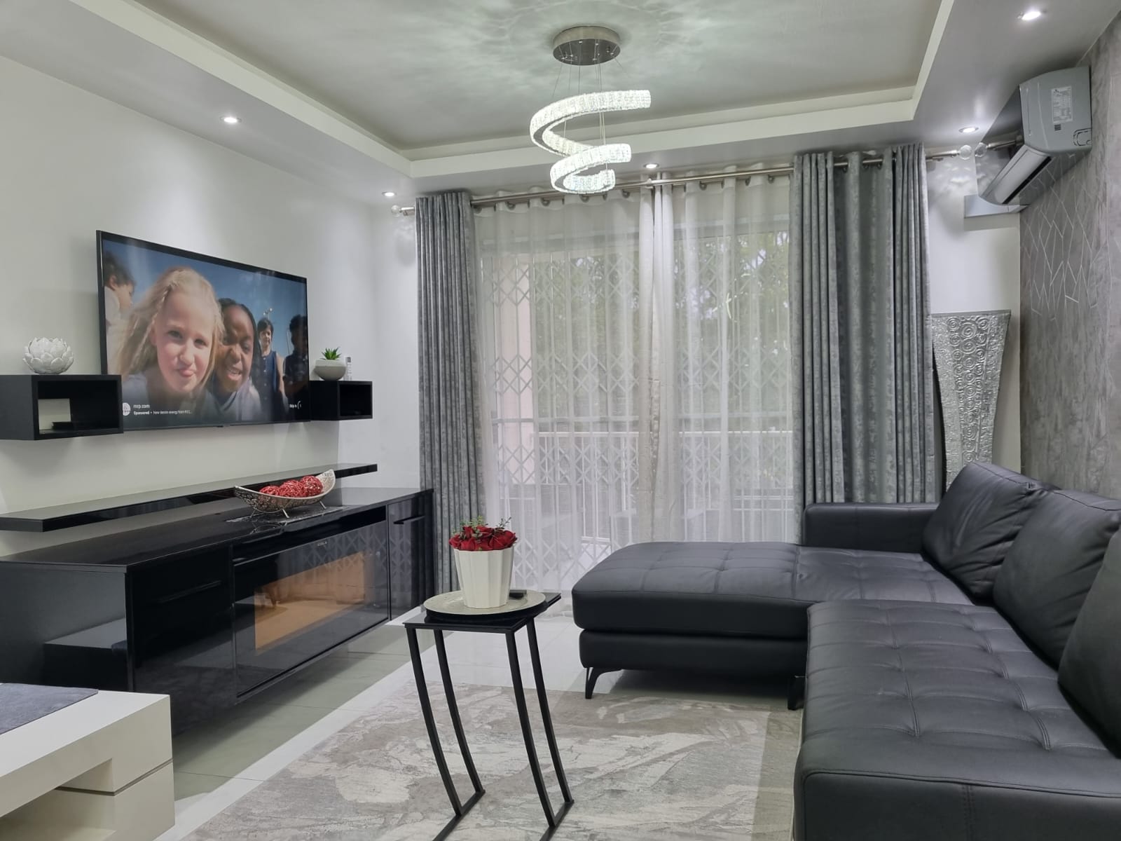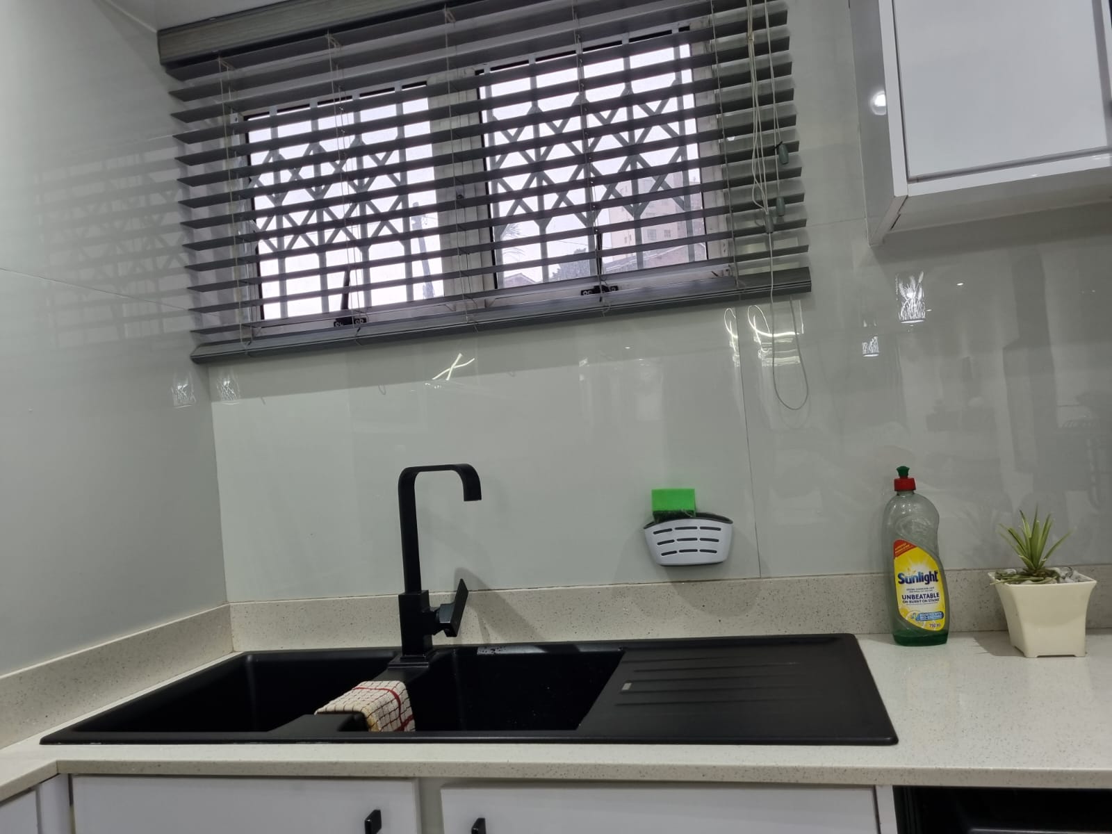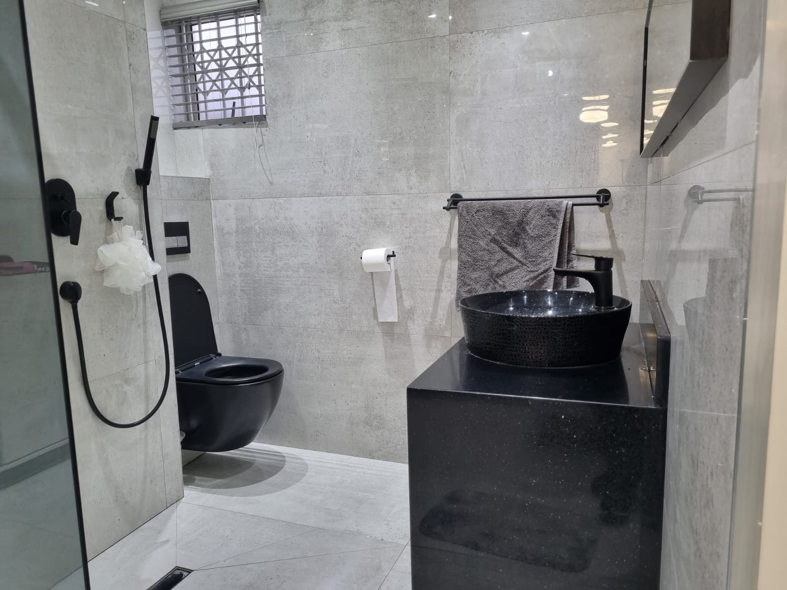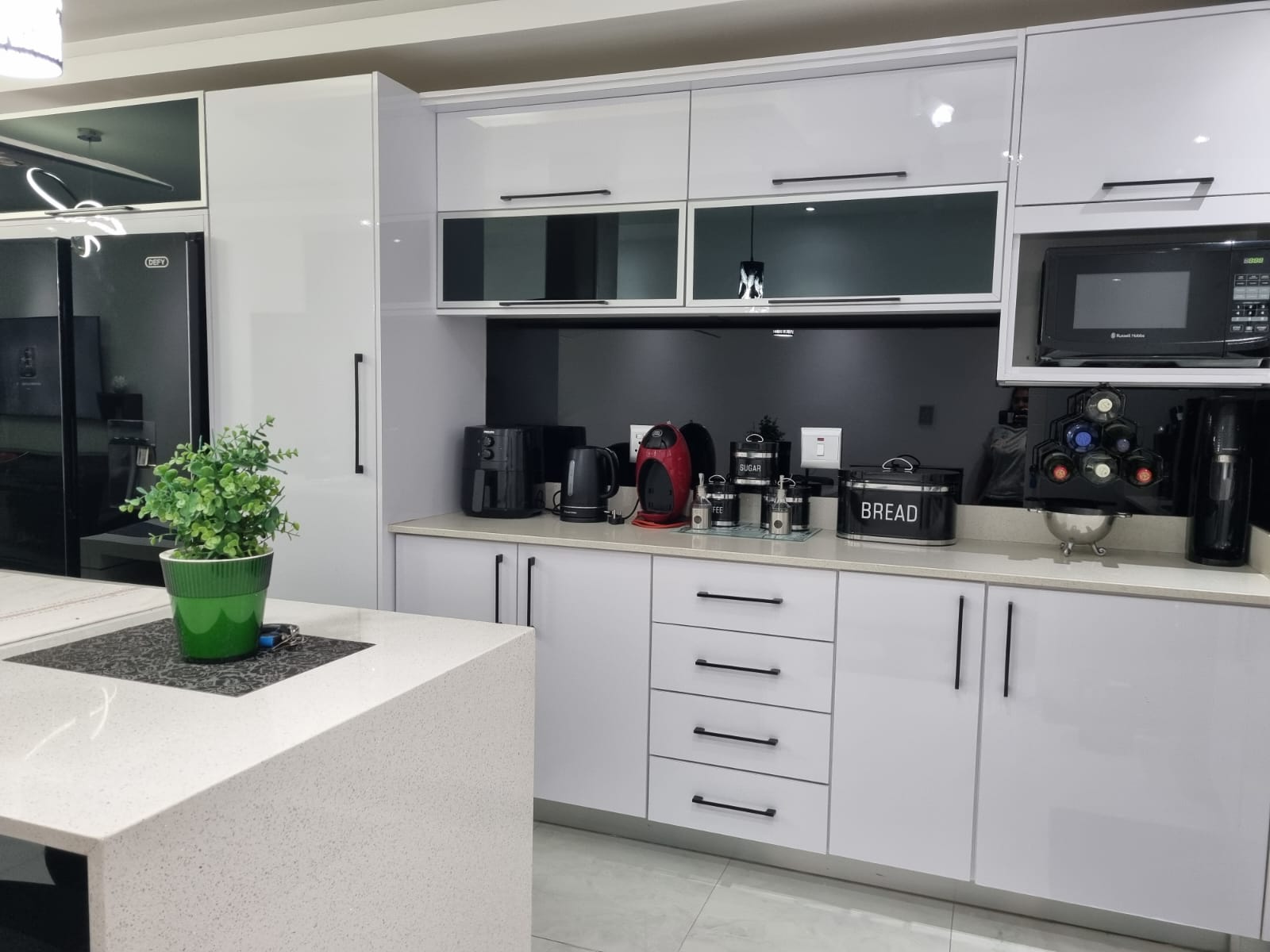 Culinary enthusiast's will delight in the kitchen, which is fully fitted with high gloss cupboard's, a center island equipped with a glass stop stove, extractor, and quartz stone counter tops, tastefully completed with sleek porcelain tiles. It is also conveniently plumbed for a washing machine and boast's a double bowel kitchen sink, complete with blinds for privacy.