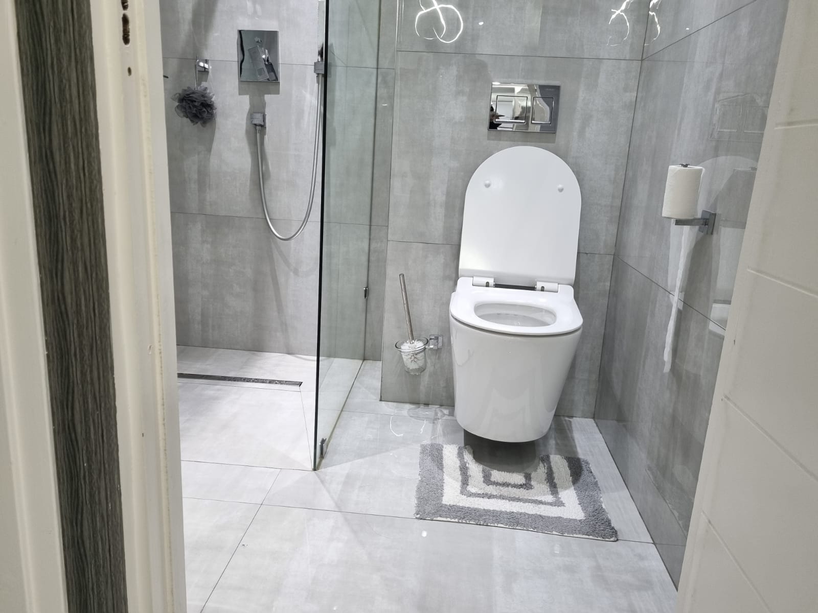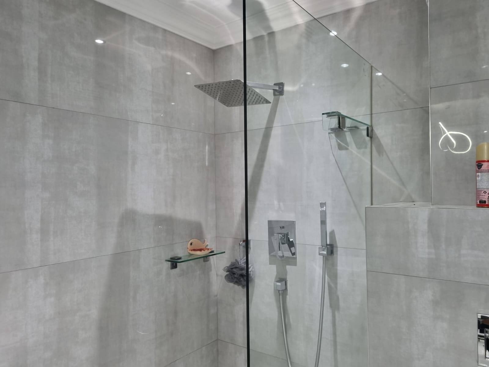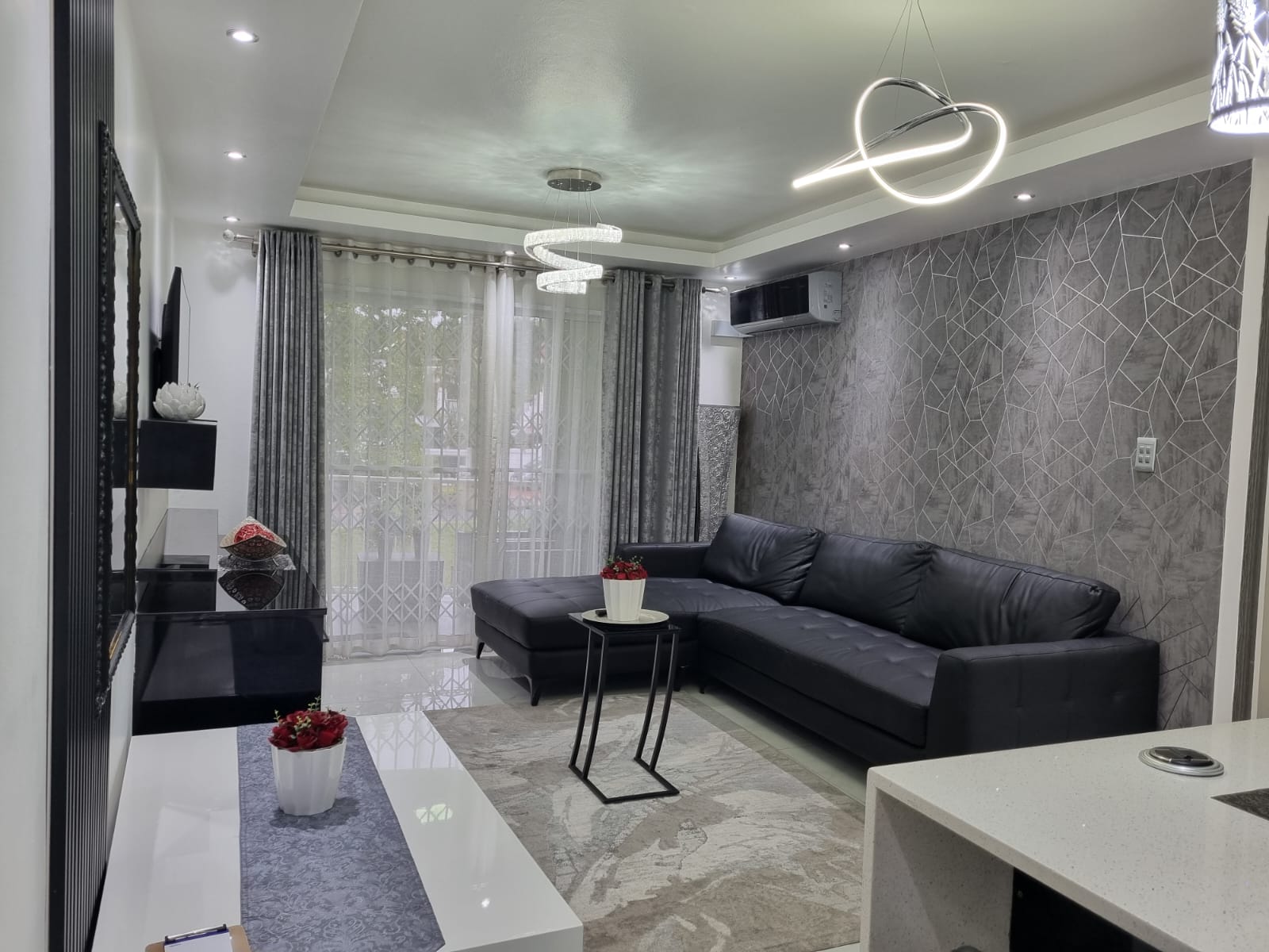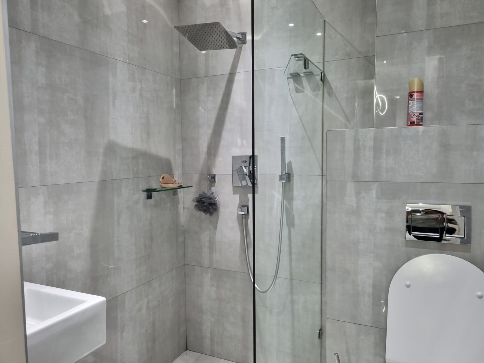The open-plan lounge and kitchen area beckon's for gathering's and relaxation. The lounge, a marvel of modernity, features a floating t.v stand with built in fire place, air conditioning for sweltering summer days, and a sliding door that usher's you to the 1st balcony. Luxury isn't spared , with curtain rails and a stylish drop-down ceiling accented by downlight's, creating an ambiance of warmth and sophistication.