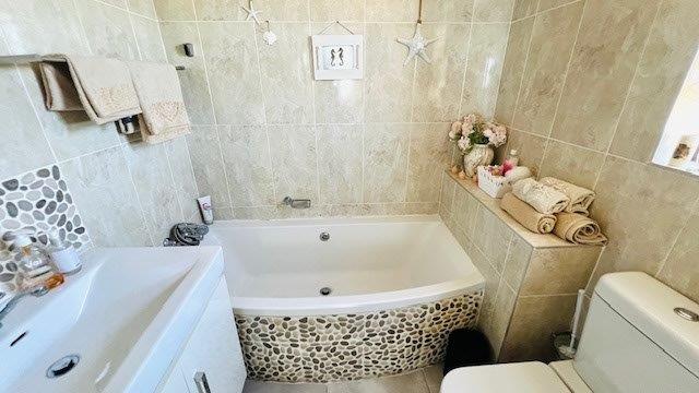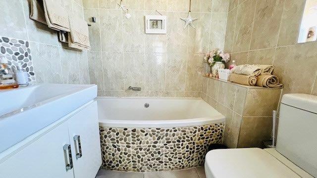 The main bedroom is charming and spacious, featuring an en-suite bathroom with a bath, basin, and toilet. A hallway from the main bedroom leads to a guest bathroom with a shower, basin, and toilet, as well as a separate guest toilet for convenience. The 2 additional bedrooms are both comfortable and well-appointed, all bedrooms are equipped with ceiling fans.