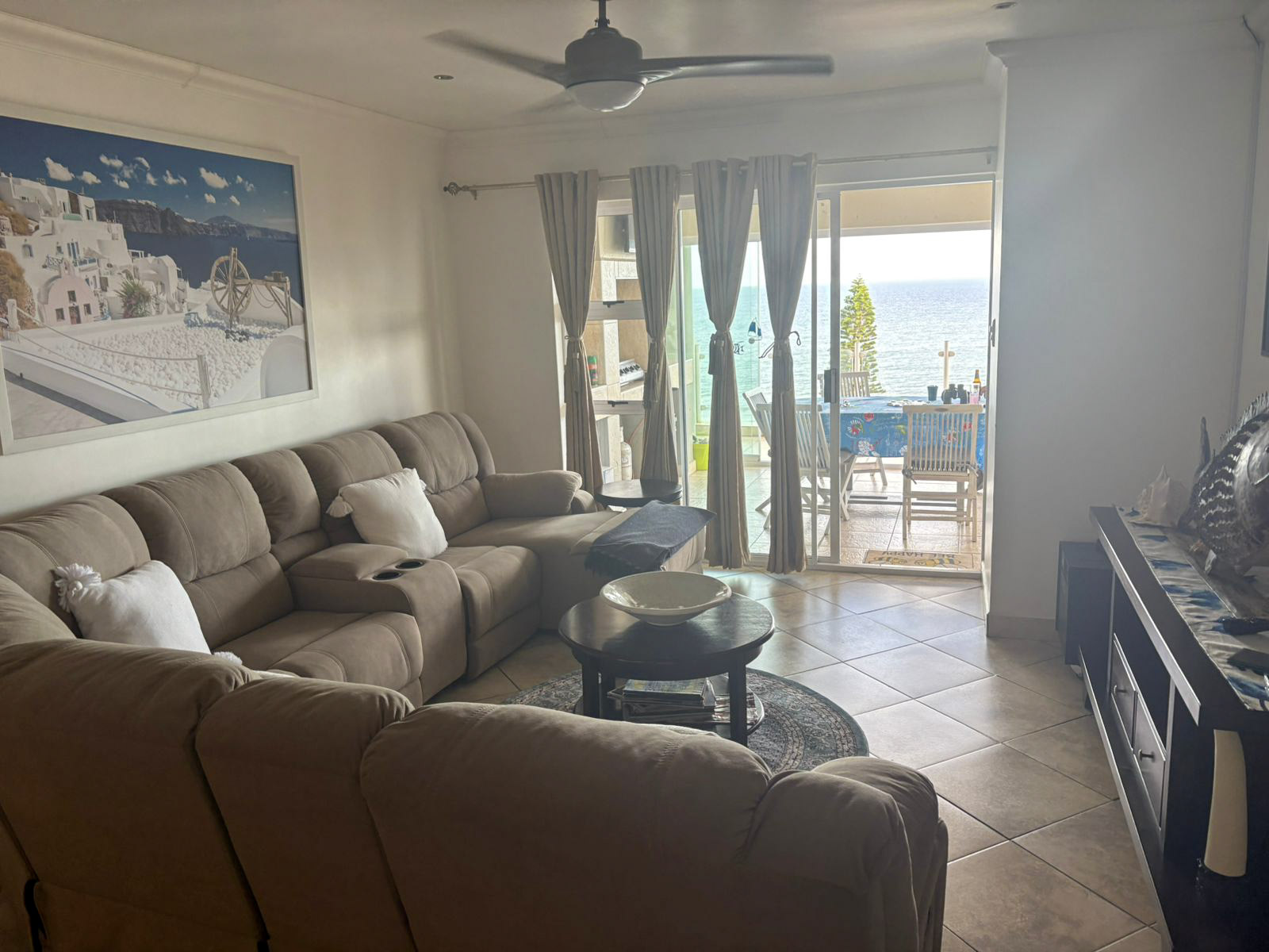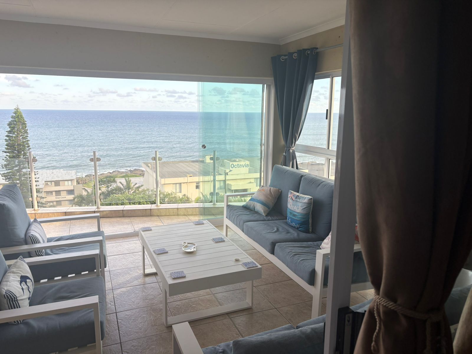 Welcome to Aqua Pearl, an exclusive top-floor seafront apartment perfectly positioned on the golden shores of Manaba Beach, close to the Blue Flag Lucien Beach. This stylish three-bedroom, sea-facing home offers 180-degree, uninterrupted ocean views and the ultimate coastal lifestyle. Designed for comfort and easy living, the main bedroom features a full ensuite bathroom, while a second bathroom with a shower and toilet services the remaining bedrooms. The modern kitchen is fitted with granite countertops and ample cupboard space and flows seamlessly into the open-plan living and dining areas, creating a warm and inviting atmosphere. The apartment boasts two lounges or formal sitting areas, offering generous space for relaxing or entertaining. Chic, contemporary finishes and clean lines enhance the elegant interior. Open-plan living areas lead onto a recently enclosed patio with stacking doors, perfect for enjoying a braai or potjie kos even on rainy days, and extend further onto an open balcony where you can soak in the sea air and breathtaking views. Additional features include a lock-up garage, a second covered carport, and extra open parking. The complex is secured with an electric fence and offers a communal swimming pool and braai area, ideal for holiday enjoyment. Water tanks assist with water management. The apartment sleeps six and is currently rented out for approximately R3,000 per night, making it an excellent investment opportunity. Furniture is available for purchase at an additional cost, which can be discussed with the owner, and if you already have your own furniture, the price can be renegotiated. Whether you’re enjoying morning coffee to the sound of the waves or hosting sunset gatherings overlooking the ocean, every day here feels like a holiday. 📞 If you’d like to view this stunning coastal home, give me a call today.