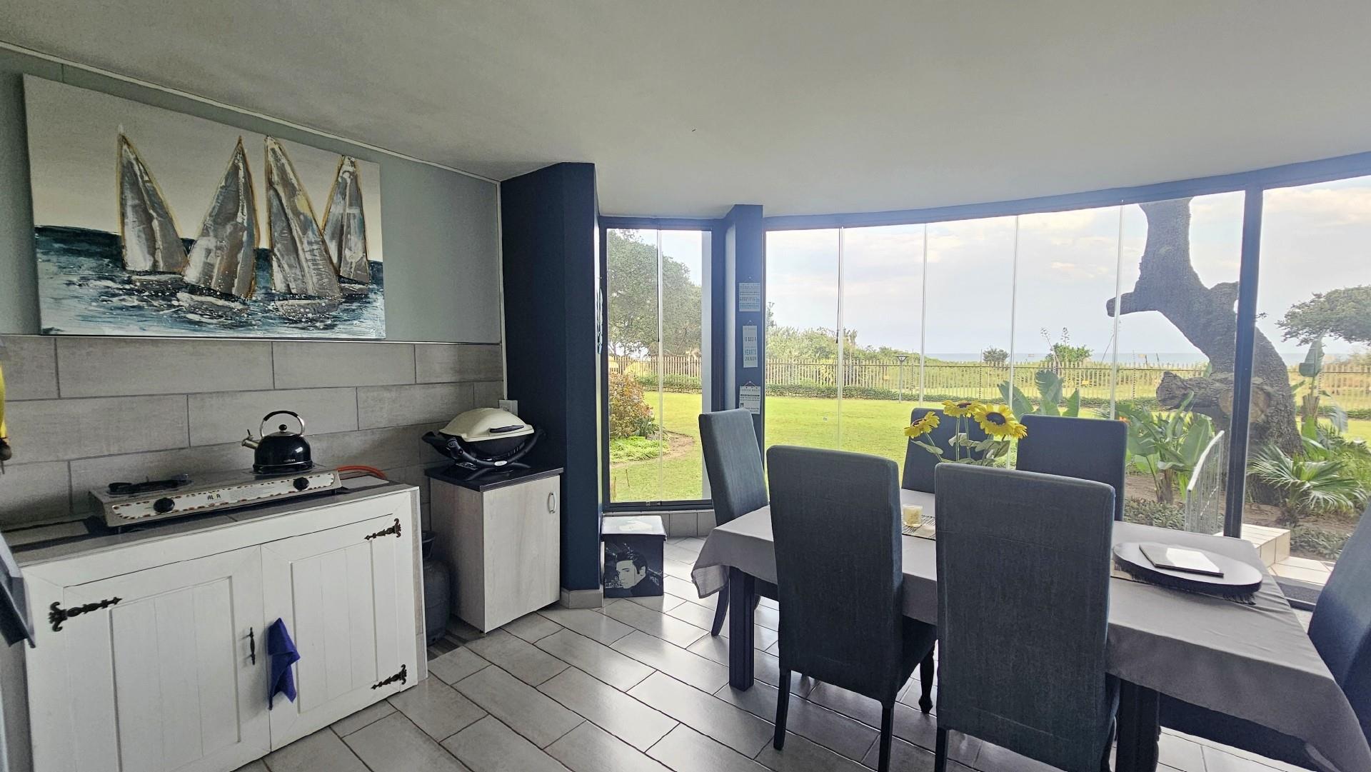 Step into this beachfront gem of coastal luxury with this truly breath-taking 4 bedroom, 2 bathroom home nestled in Manaba. Picturesque barely does it justice- every inch of this property exudes charm, comfort and elevated style. On entering the home you are greeted by a guest bedroom on either side fitted with stylish blinds and ample built in cupboards. As you continue into the unit you are greeted by a chefs kitchen, with beautiful granite tops, an under counter oven, extractor fan and modern finishes. The kitchen has ample cupboard and surface space, and is neatly fitted with a dishwasher, tumble dryer and washing machine. Alongside the kitchen is a roomy dining room and lounge area which leads onto a beautifully glass enclosed patio which provides an expansive entertainment area currently fitted with a gas braai, a second dining room space and second lounge area with the most beautiful garden and ocean views.