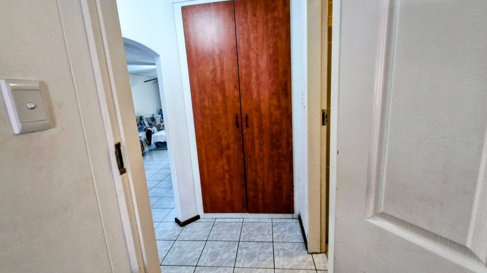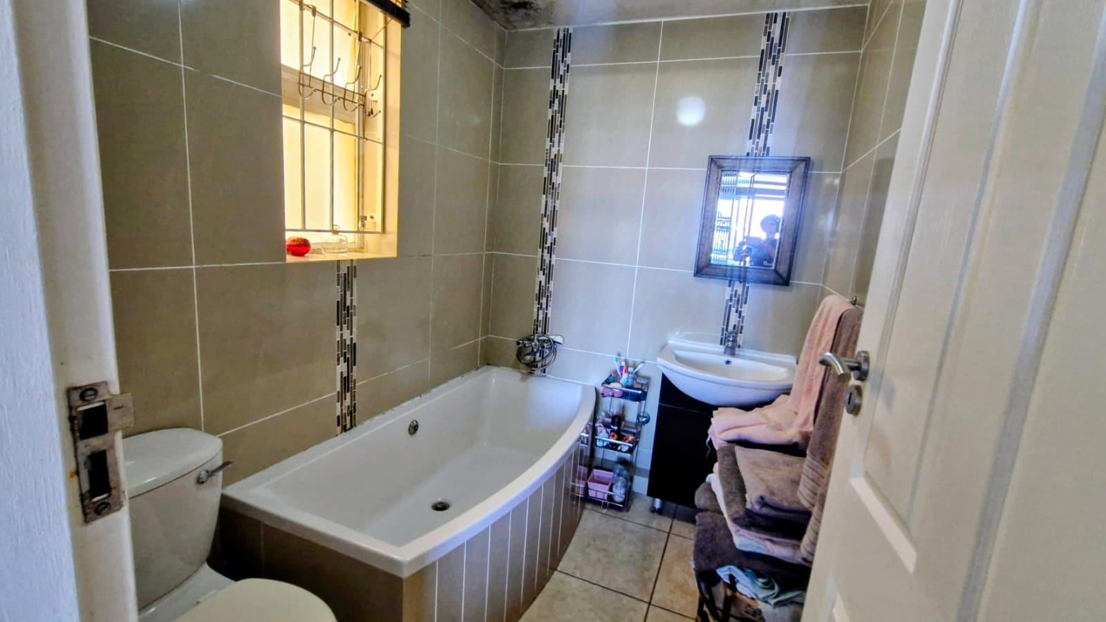 Main Bedroom – spacious and elegant with built-in cupboards and a private en-suite bathroom featuring a bath, basin, and toilet. The main bedroom opens onto the balcony, showcasing beautiful sea views.