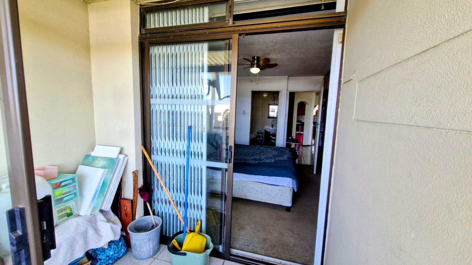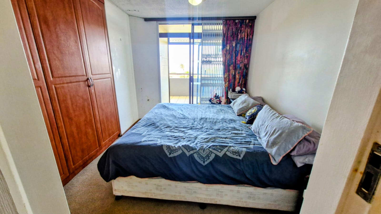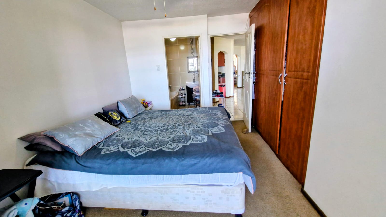 Main Bedroom – spacious and elegant with built-in cupboards and a private en-suite bathroom featuring a bath, basin, and toilet. The main bedroom opens onto the balcony, showcasing beautiful sea views.