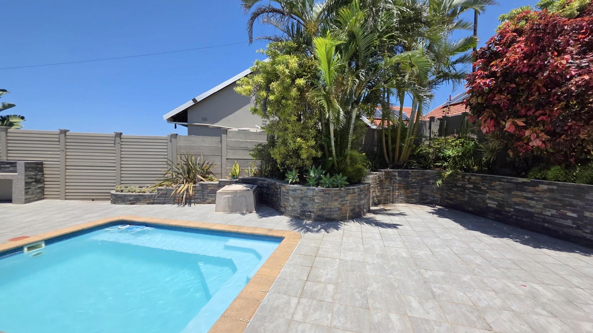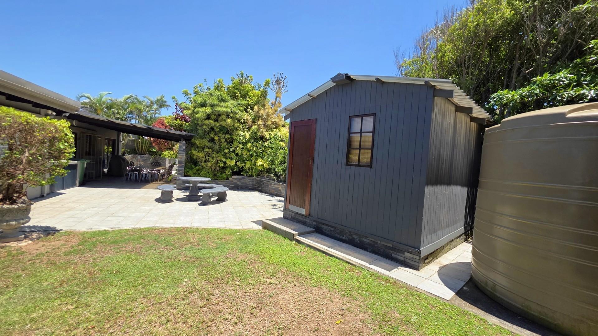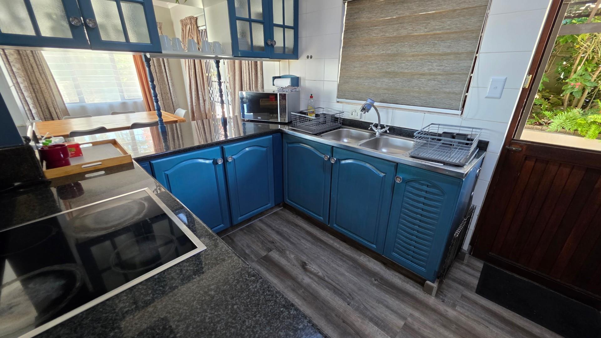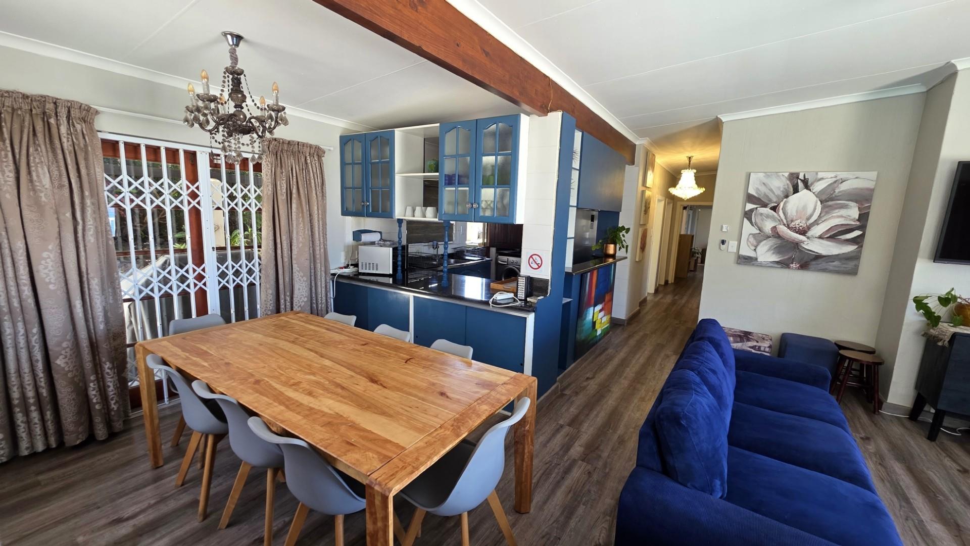 Designed with entertaining in mind, the property features multiple outdoor living spaces, both open-air and covered, all beautifully tiled. The front of the home offers an expansive patio extension which is a wonderful use of space, for entertaining, hosting of guests and showcasing 180 degree panoramic ocean views, while the back of the home offers and undercover patio and outdoor dining setup for the less sunny days. A custom-built Wendy House provides convenient garden storage, while two 5,000-litre plumbed water tanks ensure uninterrupted supply regardless of municipal outages. Security has been thoughtfully addressed with a comprehensive system that includes CCTV cameras, wireless beams, an alarm, and an electric gate. Parking is ample, with a double automated garage and additional open-air spaces available. The garden is a picture of careful maintenance, immaculately laid out, enhancing the property’s appeal and creating a tranquil setting. Currently, the home operates successfully as a short-term holiday rental, generating consistent income with confirmed bookings well into the peak season. For those seeking convenience, the option exists to purchase the property fully furnished at an additional cost.