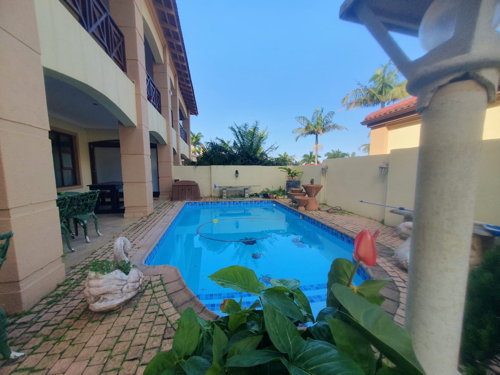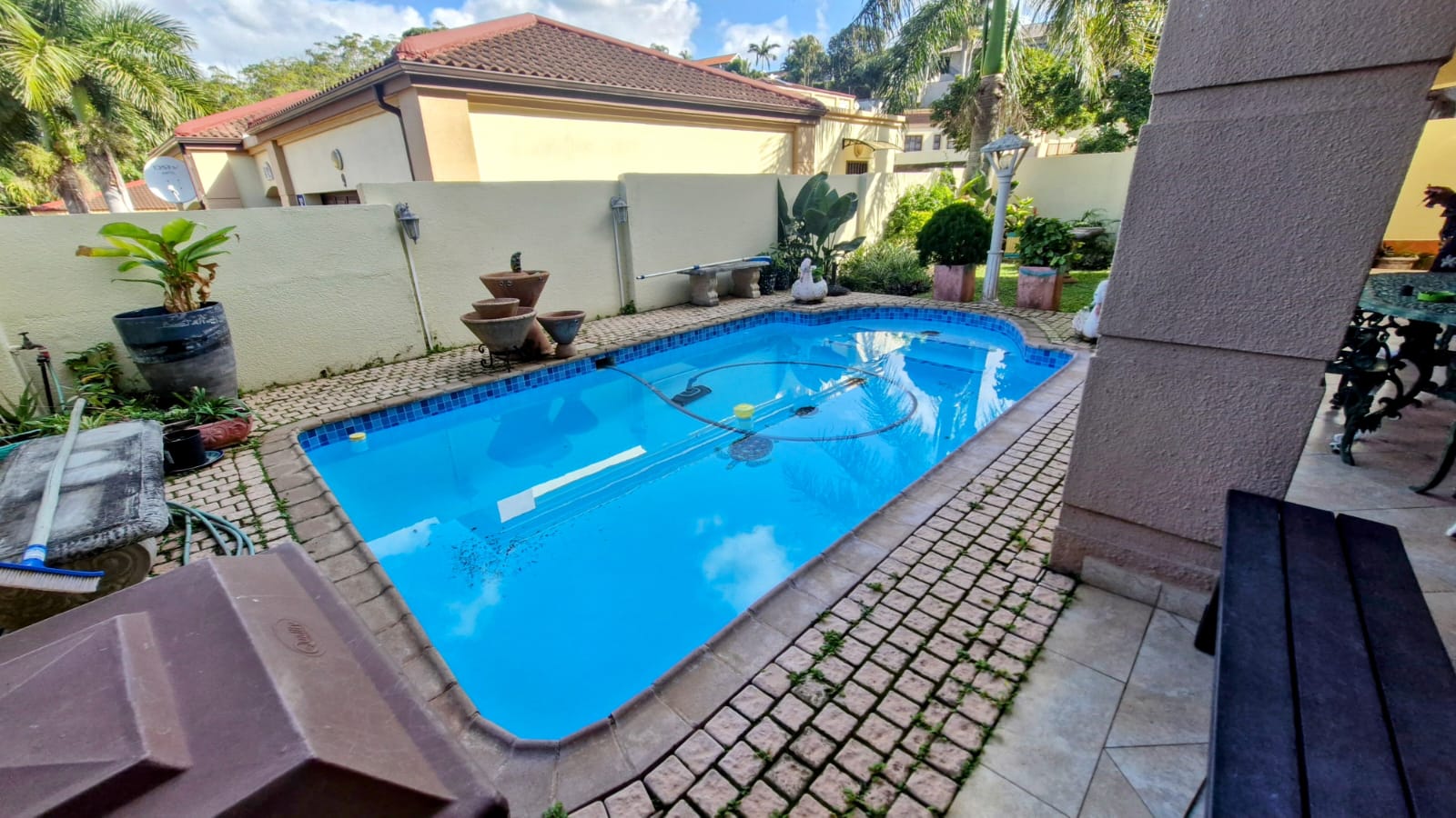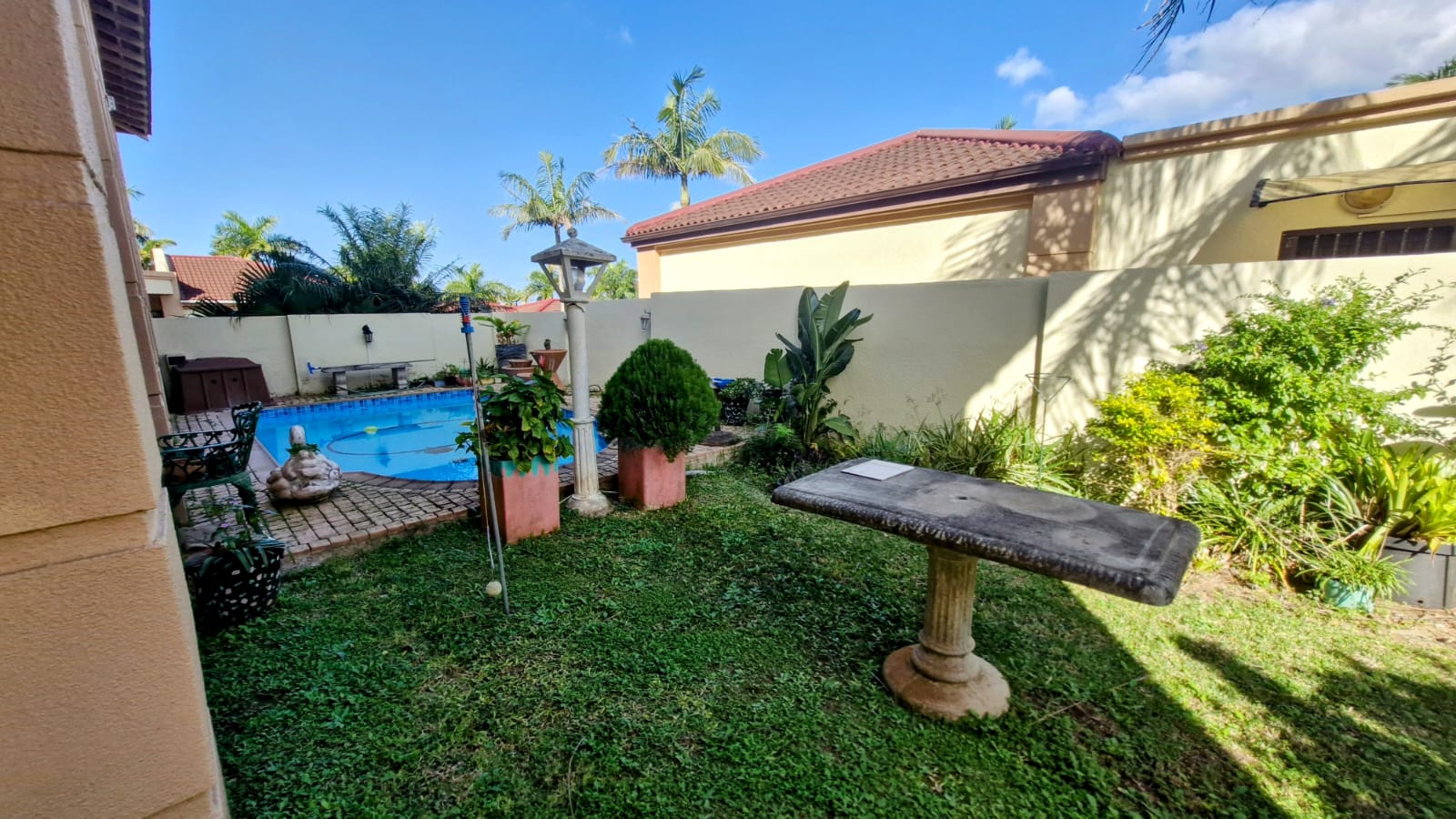 Pool area walled for privacy and security.