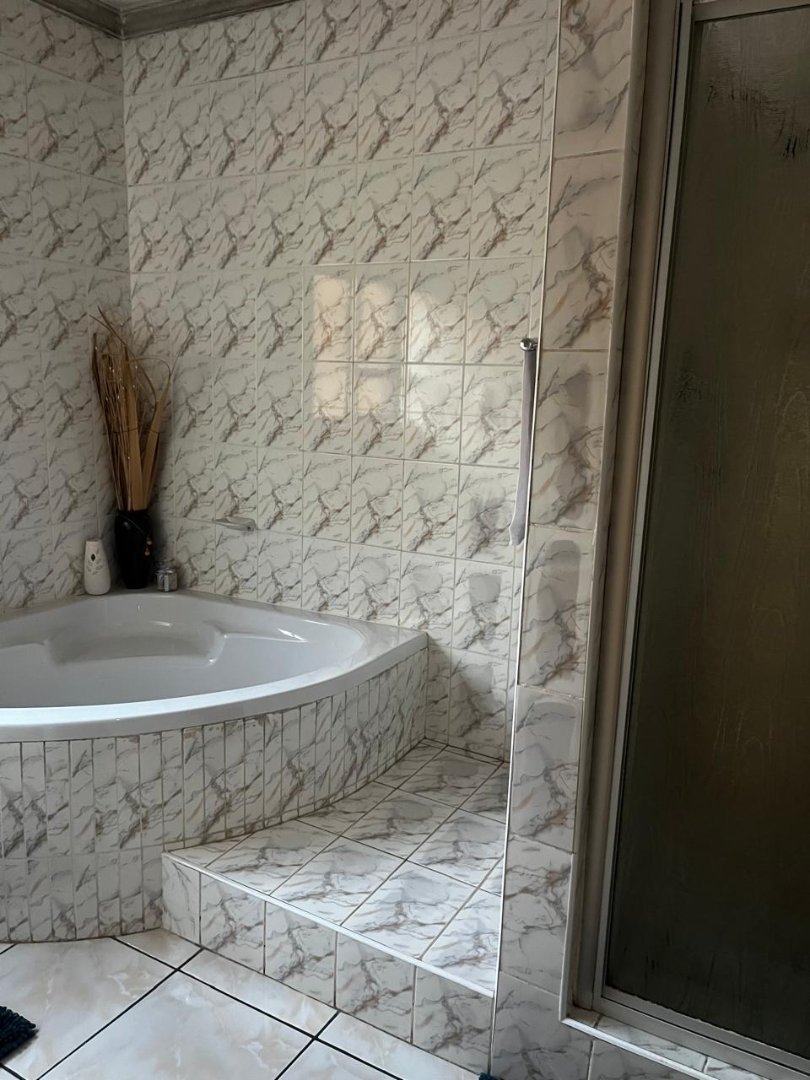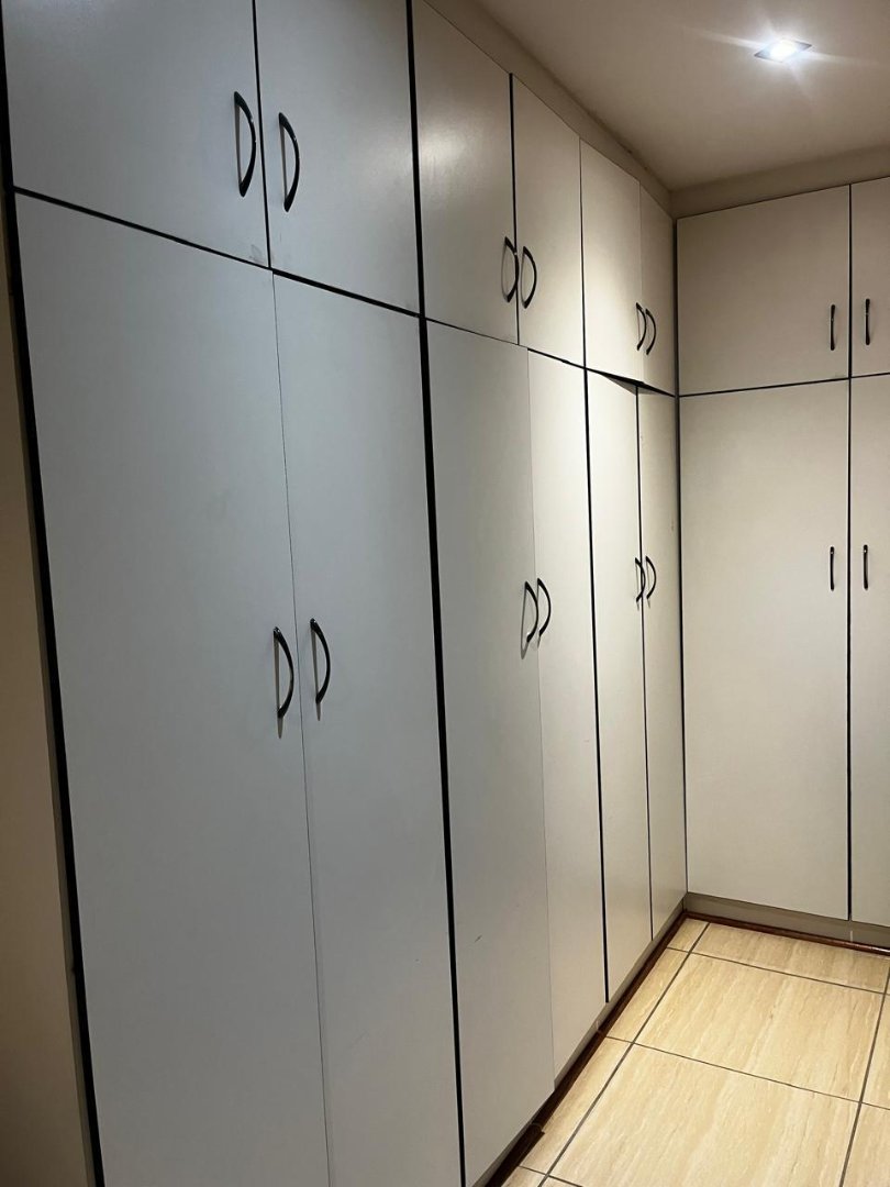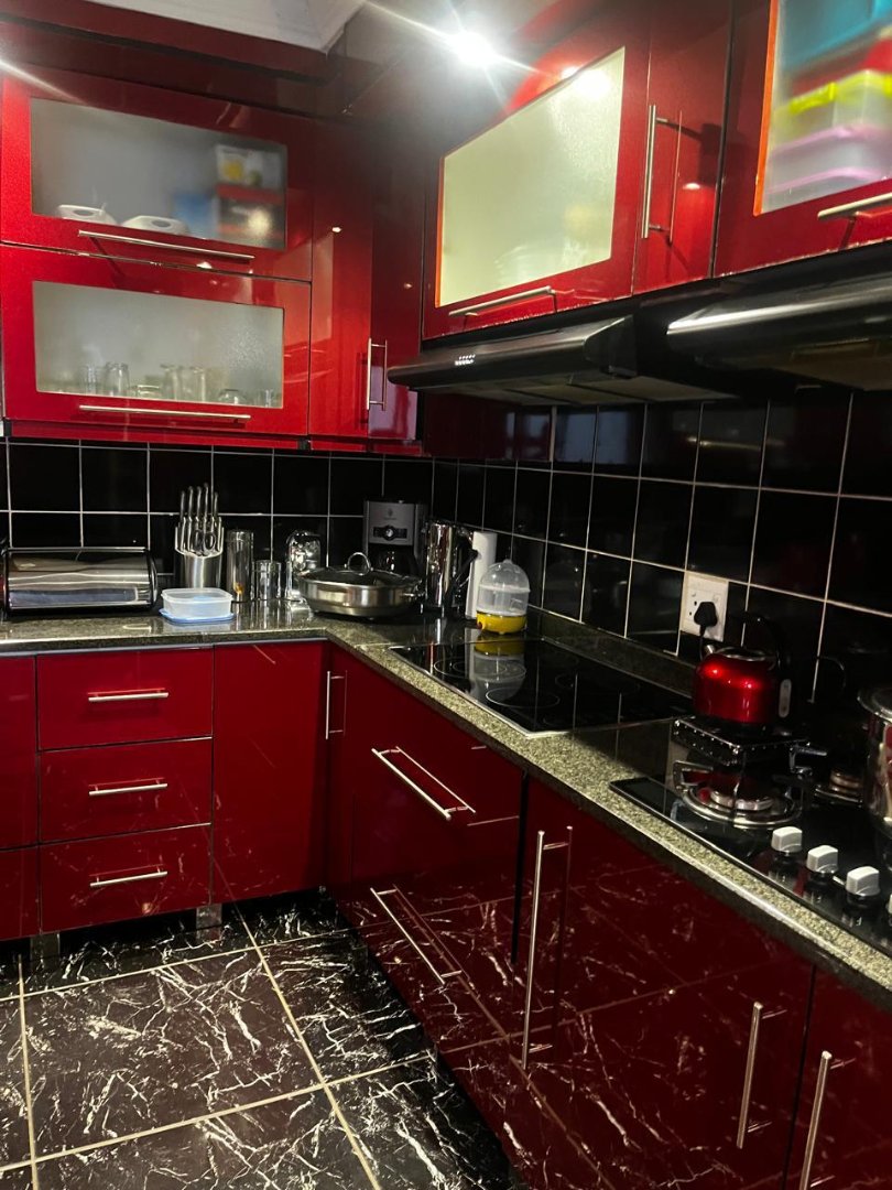 The open-plan kitchen is well designed with ample built-in cupboards, an eye-level oven, gas and electric hob, and a charming breakfast nook—perfect for everyday meals or entertaining. The kitchen flows seamlessly into the open-plan lounge and dining area, creating a warm and inviting living space.