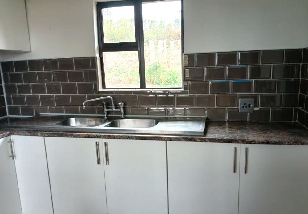 Kitchen has ample cupboard space, double sink and Gas Stove and Electric Hob and Fitting for a washing machine