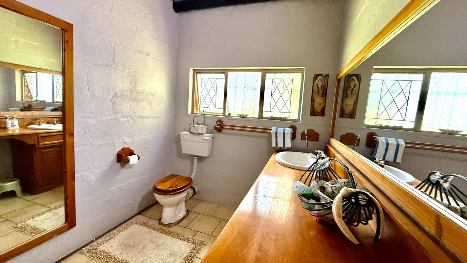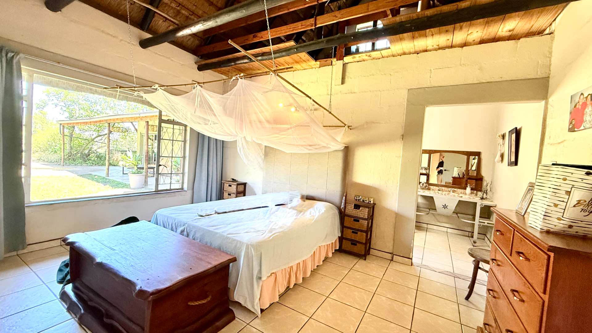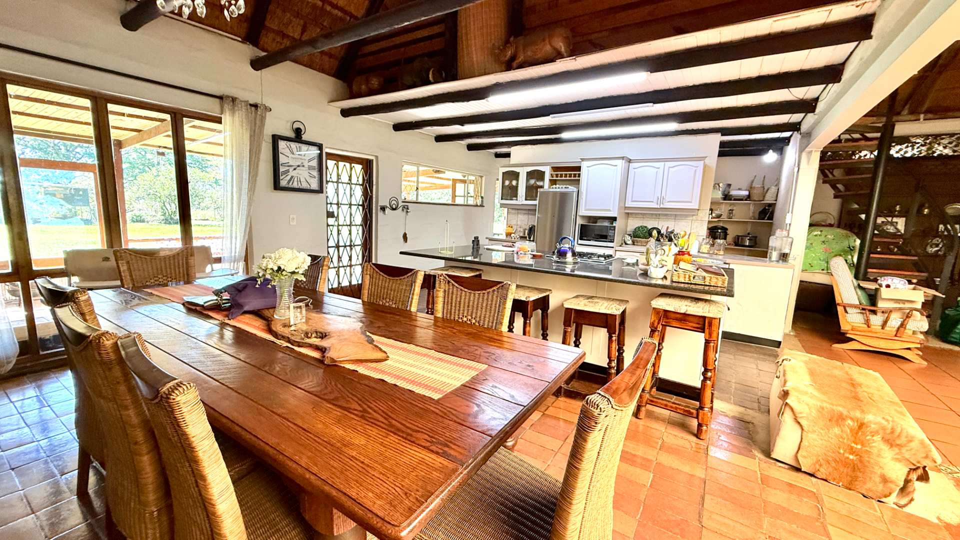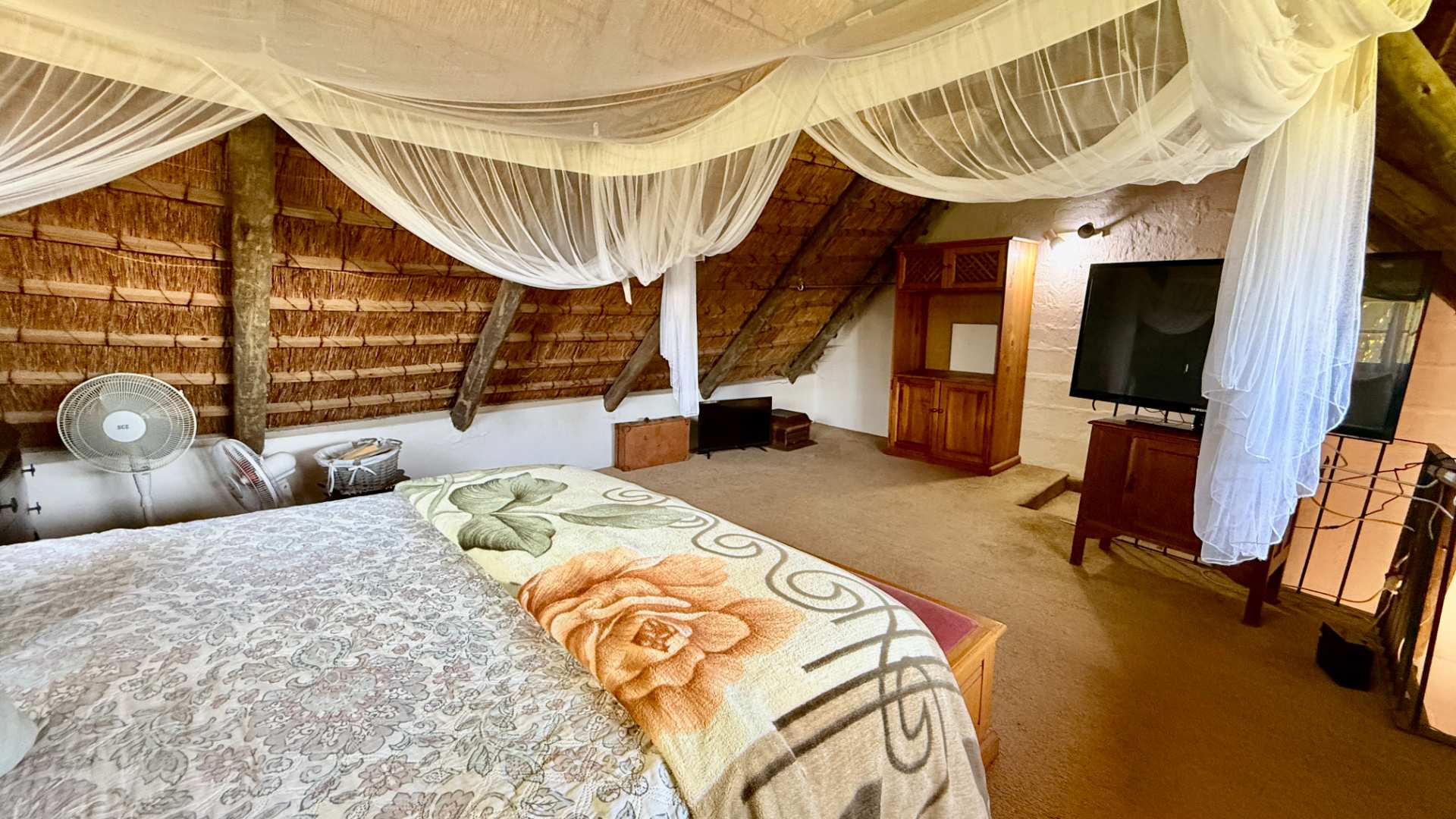 The main house is a spacious double-storey thatched home featuring four bedrooms, a large open-plan living and dining area with high ceilings, and a loft that can serve as a study, games room, or additional bedroom.