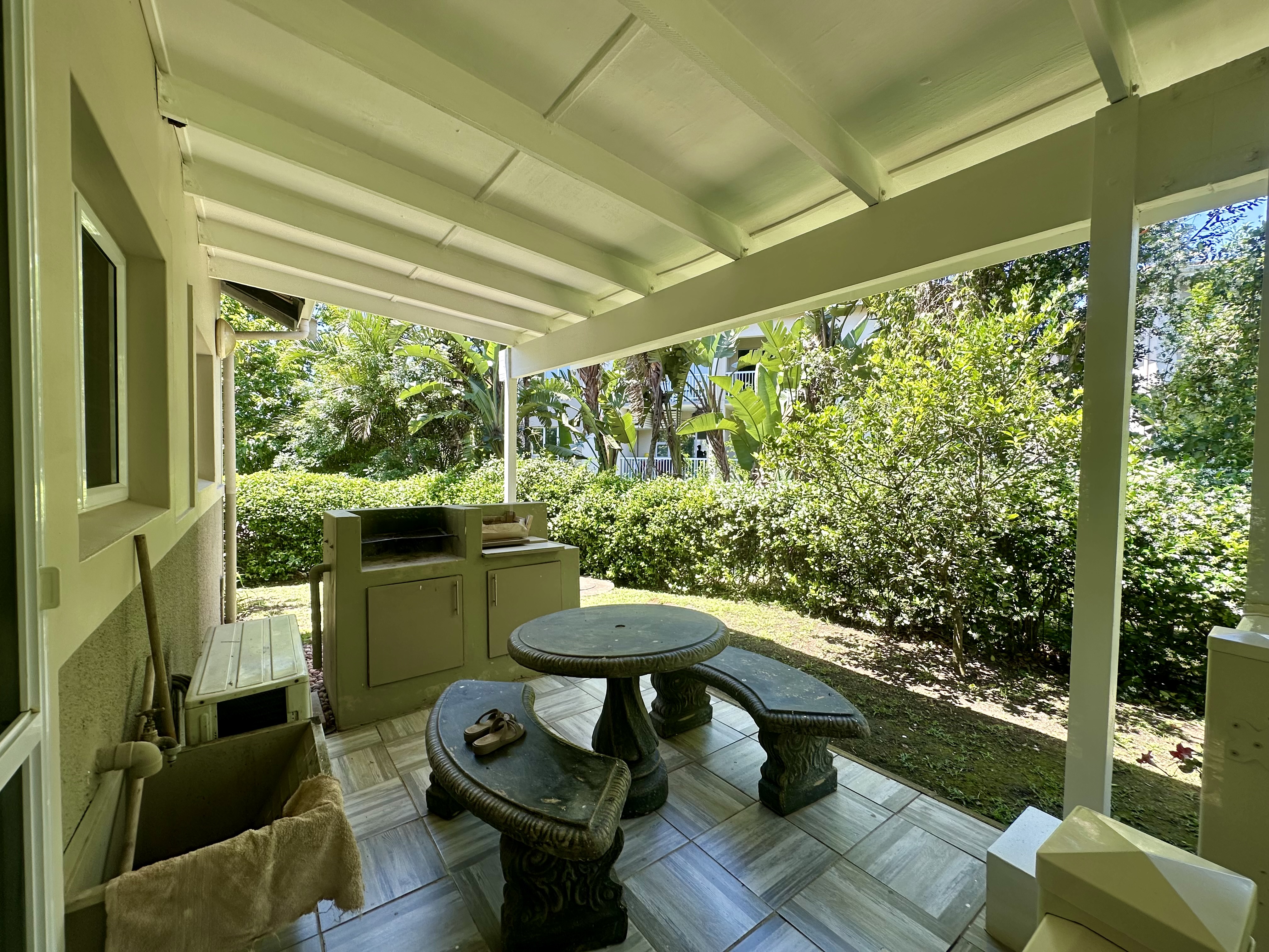 The air-conditioned living area opens onto a covered patio with a built-in braai, overlooking a private pet-friendly garden, perfect for chilling out or enjoying a weekend braai.