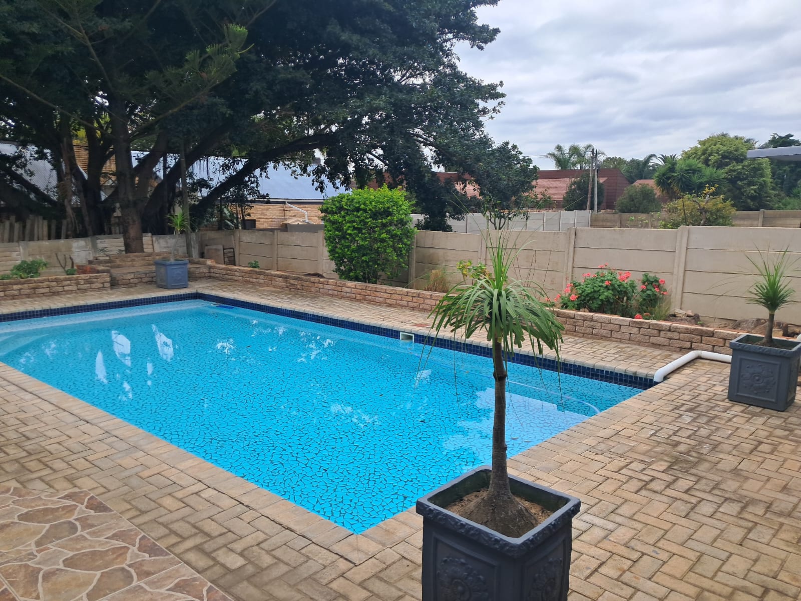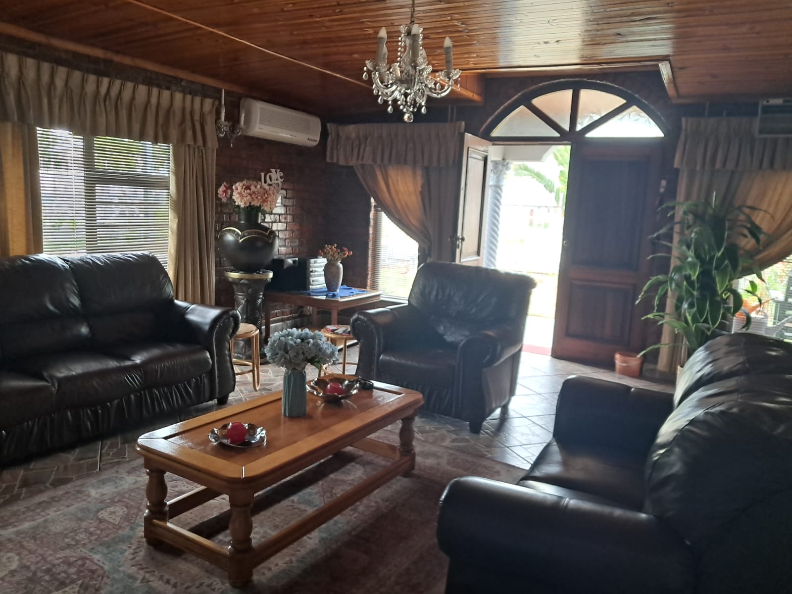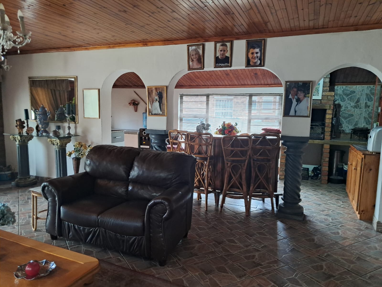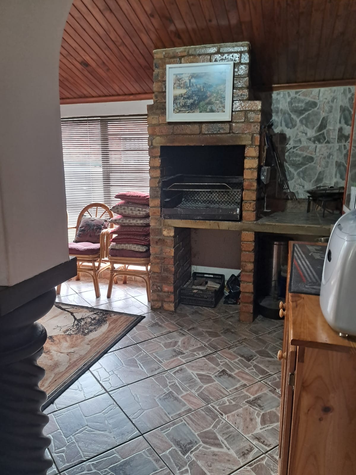 The inviting lounge area flows seamlessly into an indoor braai space, perfect for entertaining guests, while the dining area opens into a modern, well-equipped kitchen.