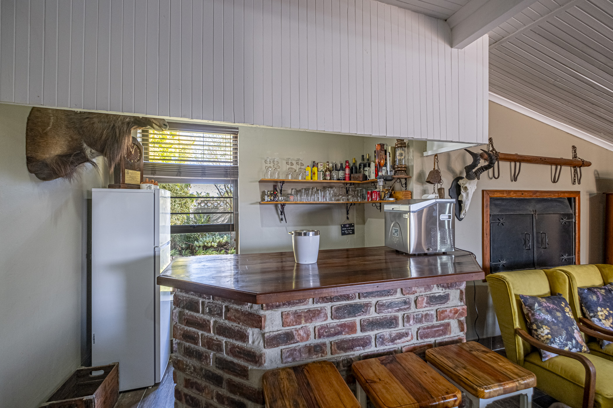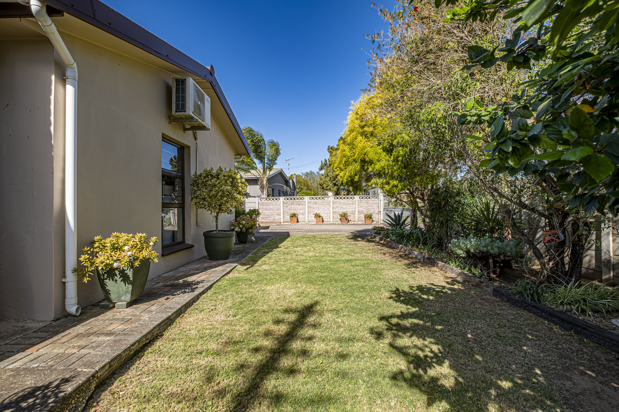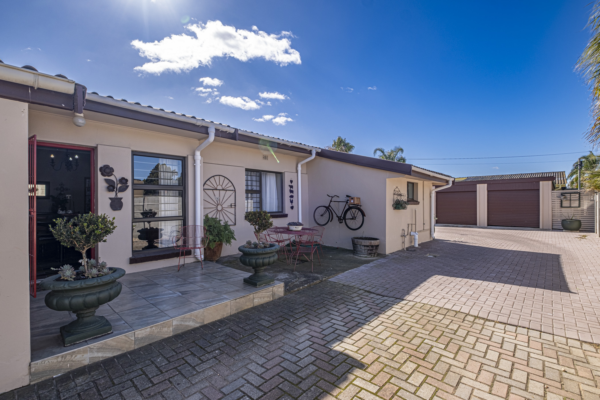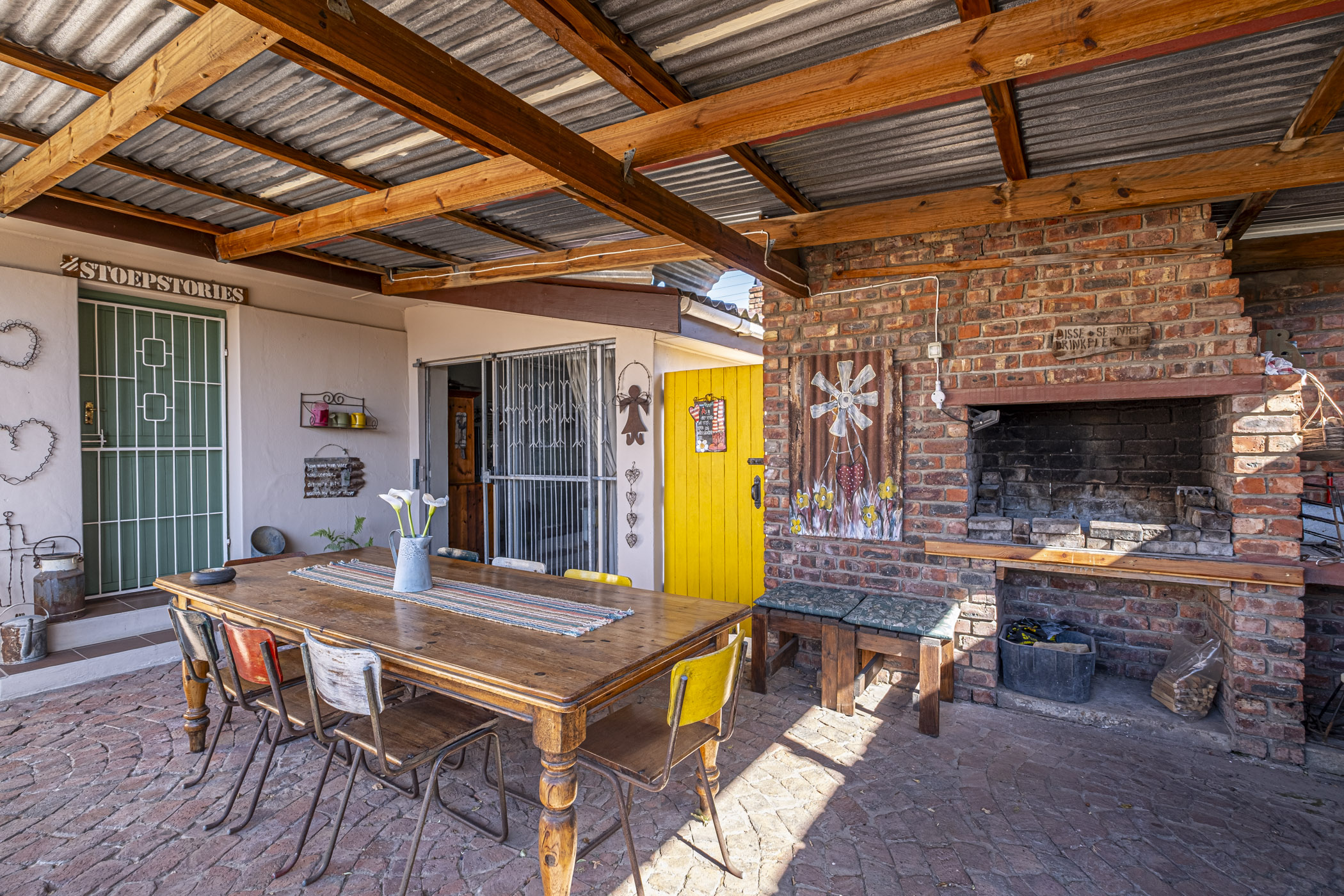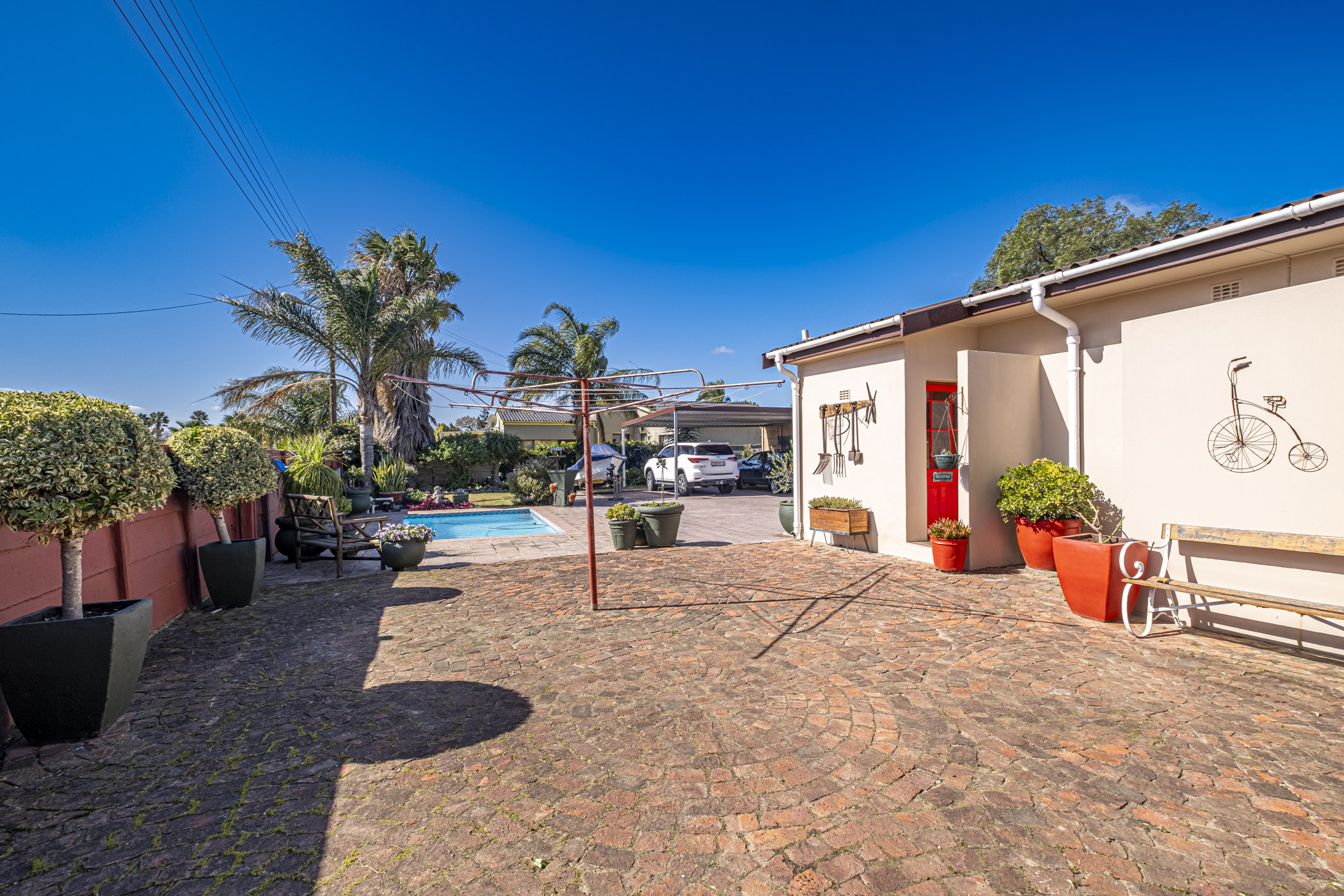 Enjoy outdoor living with an under-roof braai area, perfect for entertaining by the pool. A charming red door adds character to the outside toilet, while a partitioned corner of the garden provides a practical space for tool storage.