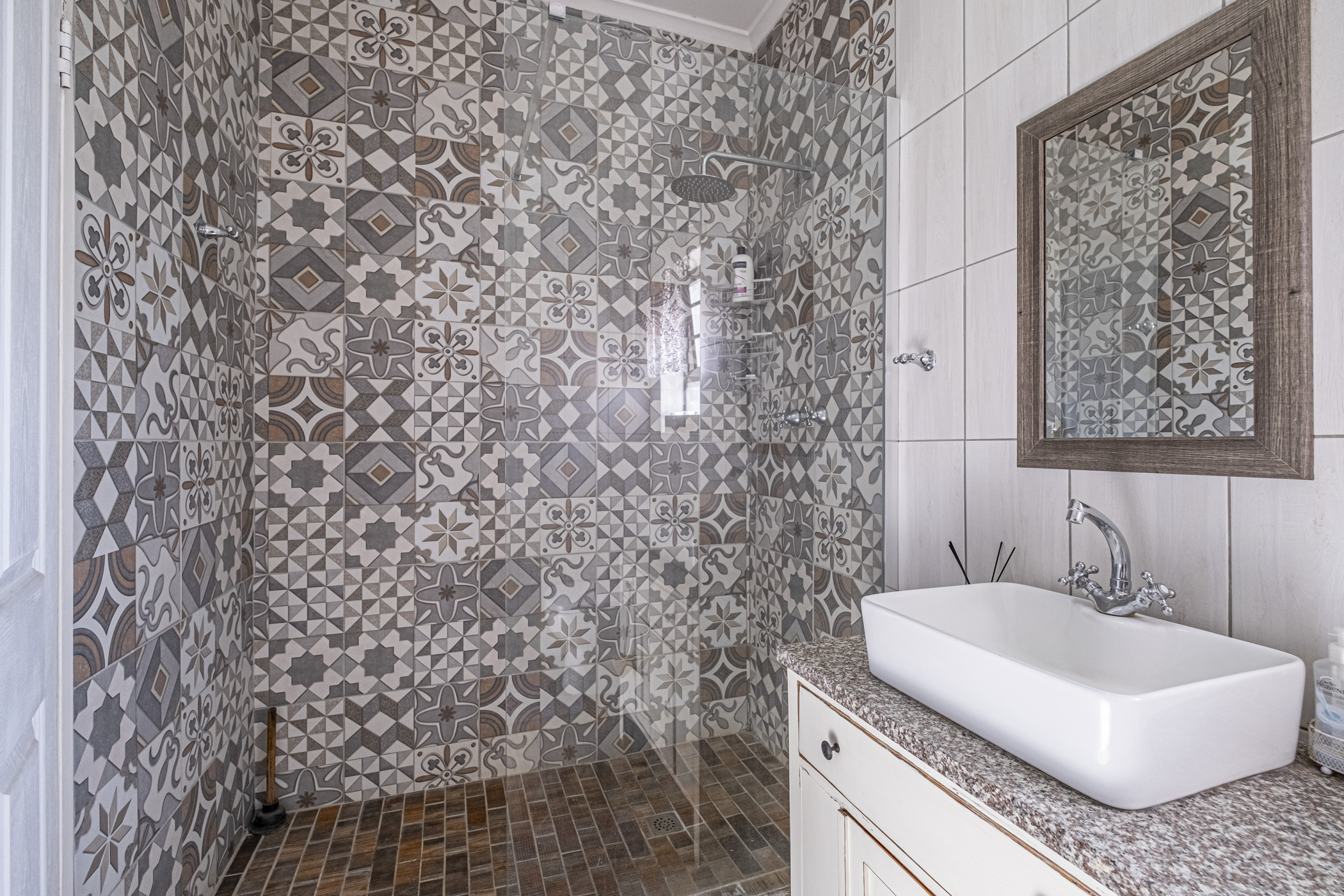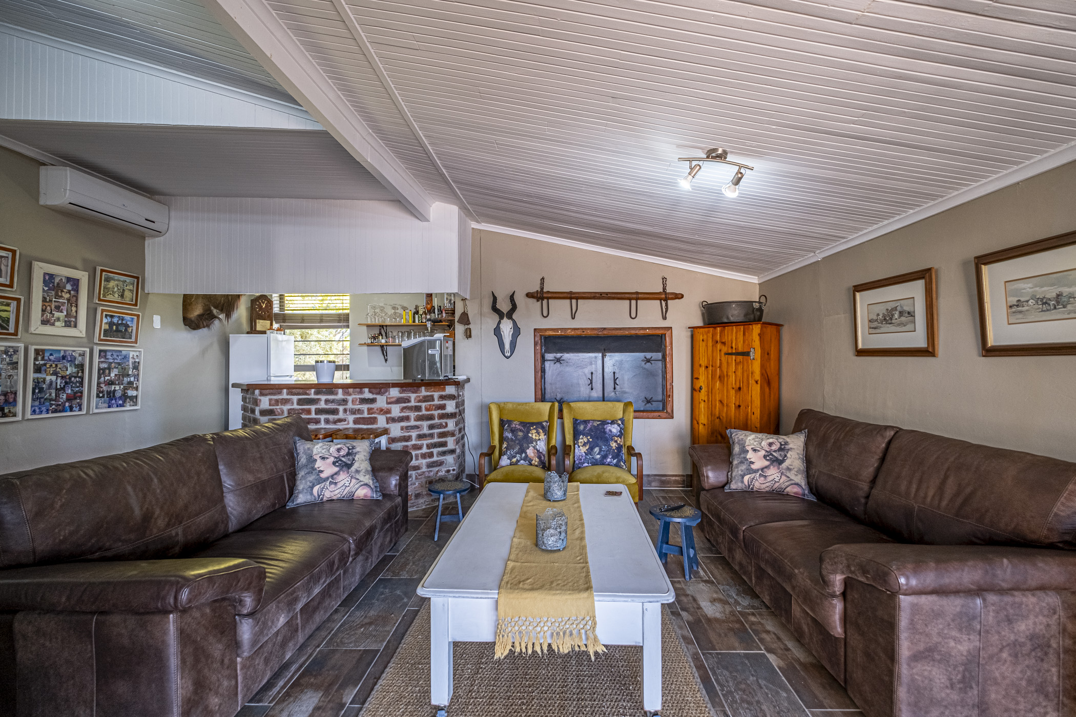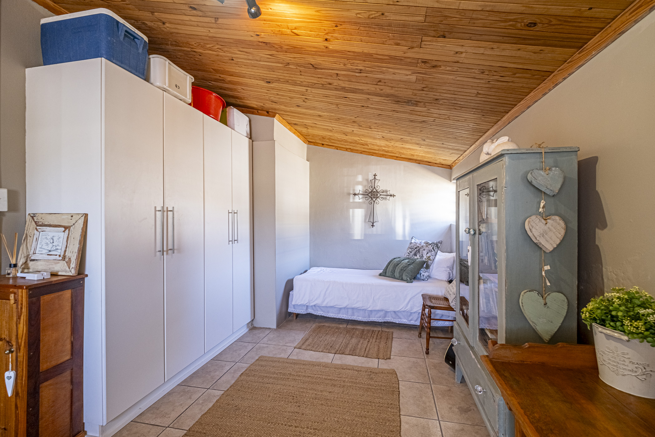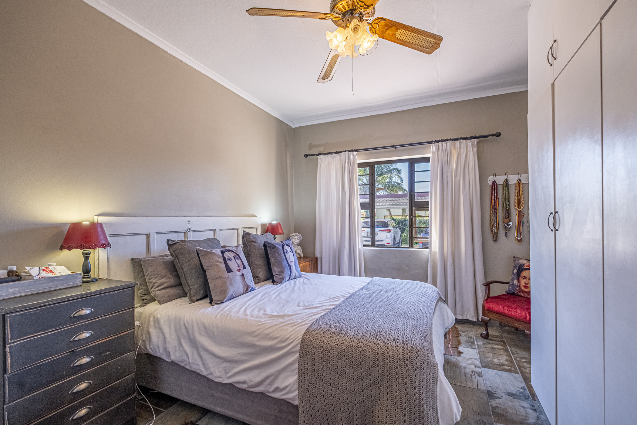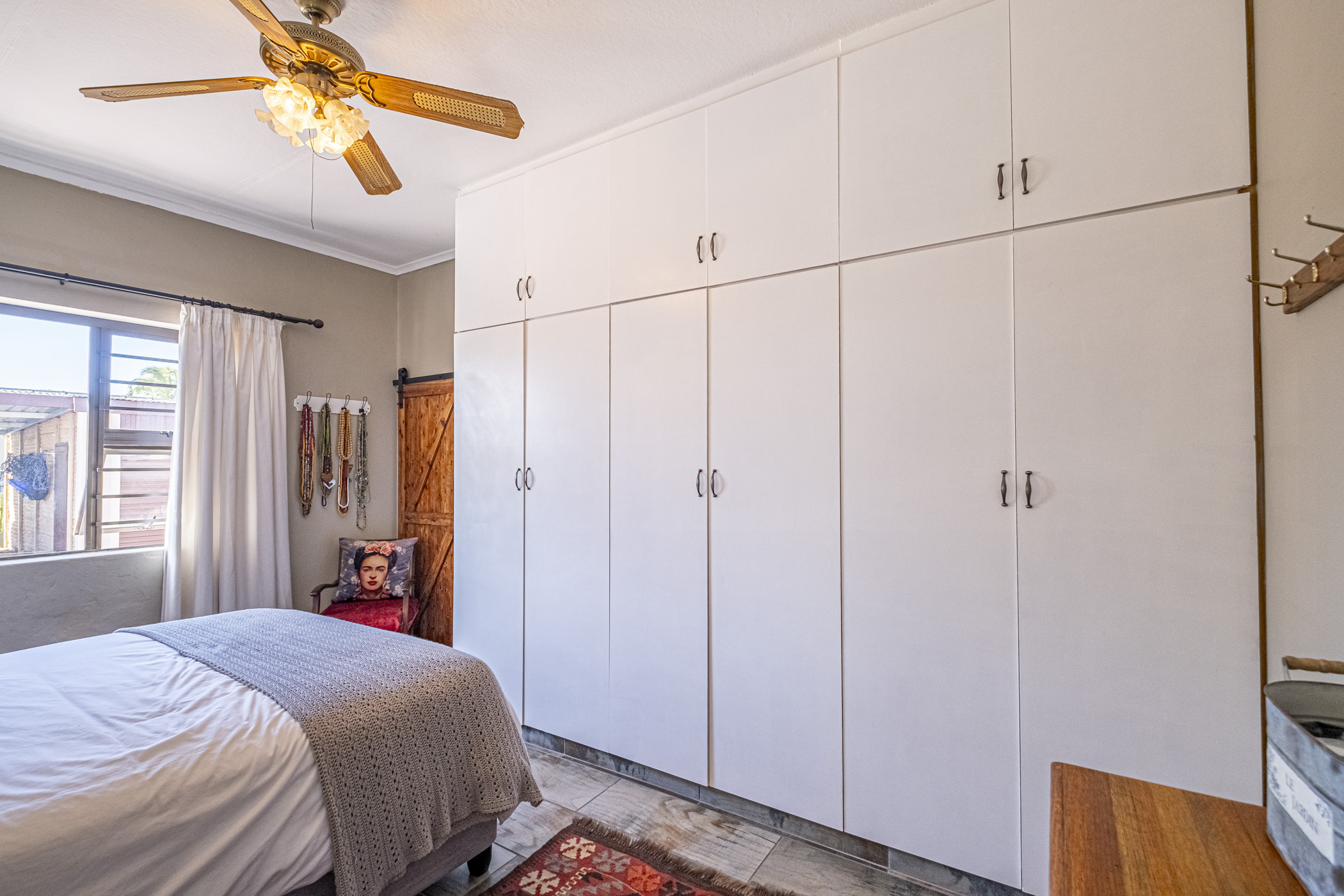 The guest room features built-in cupboards and air conditioning, ensuring comfort and convenience. Nortipine ceilings add a unique charm to the home. Three additional bedrooms, all with built-in cupboards, offer plenty of space for the family. Two of these rooms are equipped with ceiling fans, while the master bedroom boasts an en-suite bathroom with a bath, shower, basin, and toilet. A lovely built-in linen cupboard adds extra storage.