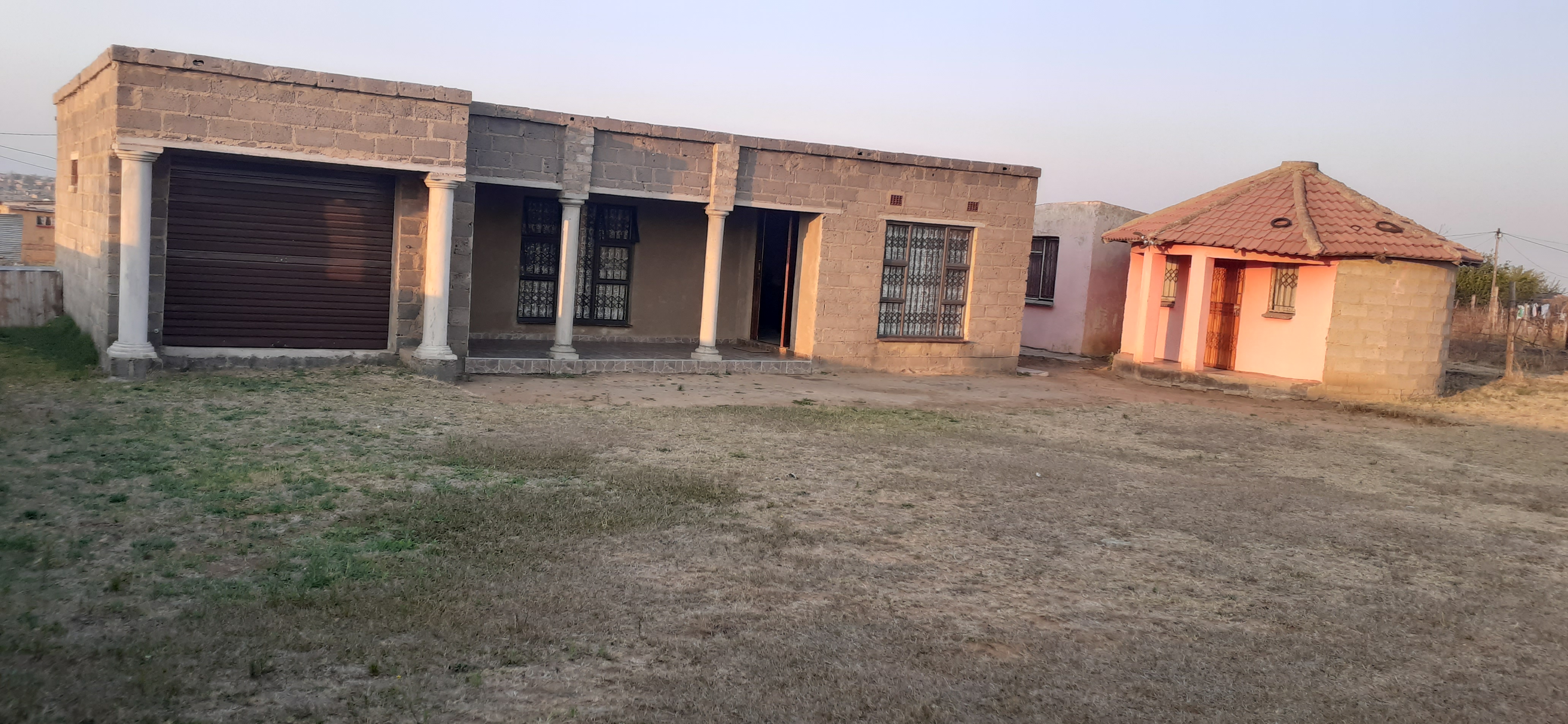 2 bedrooms, big lounge ,kitchen, main bedroom with en-suite and a single garage. The yard is very spacious and this property is next to Osizweni location, it is on a tarred road. There is a rondavel with a tiled roof and a huge 1 room outside building
