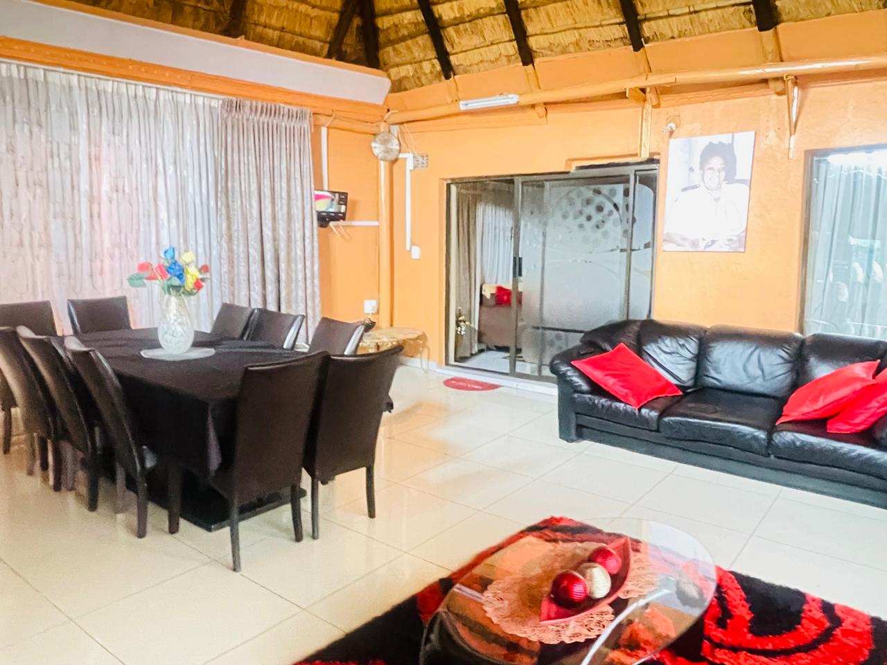 The main house is an absolute delight, featuring a well-appointed kitchen with ample cupboard space to cater to all your culinary needs. It includes two generously sized bedrooms and a separate full bathroom. The inviting lounge and dining room are perfect for family gatherings, with an additional lounge area adorned with a charming thatch roof. Historically serving as a tavern, the property comes with a liquor license should you wish to continue this venture.