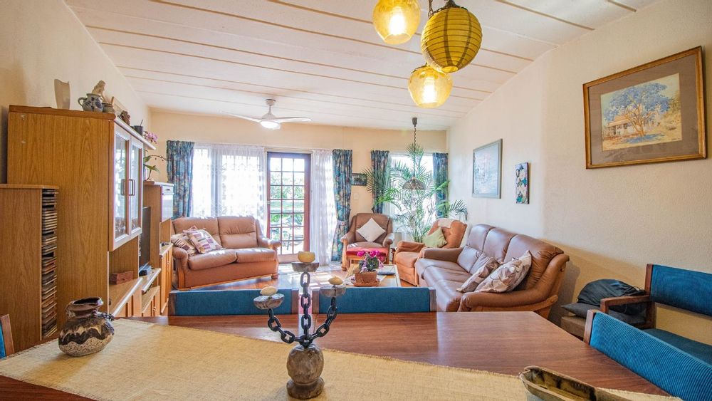 The main house features a spacious lounge and dining room, a TV room, and a kitchen with ample built-in cupboards and space for appliances.