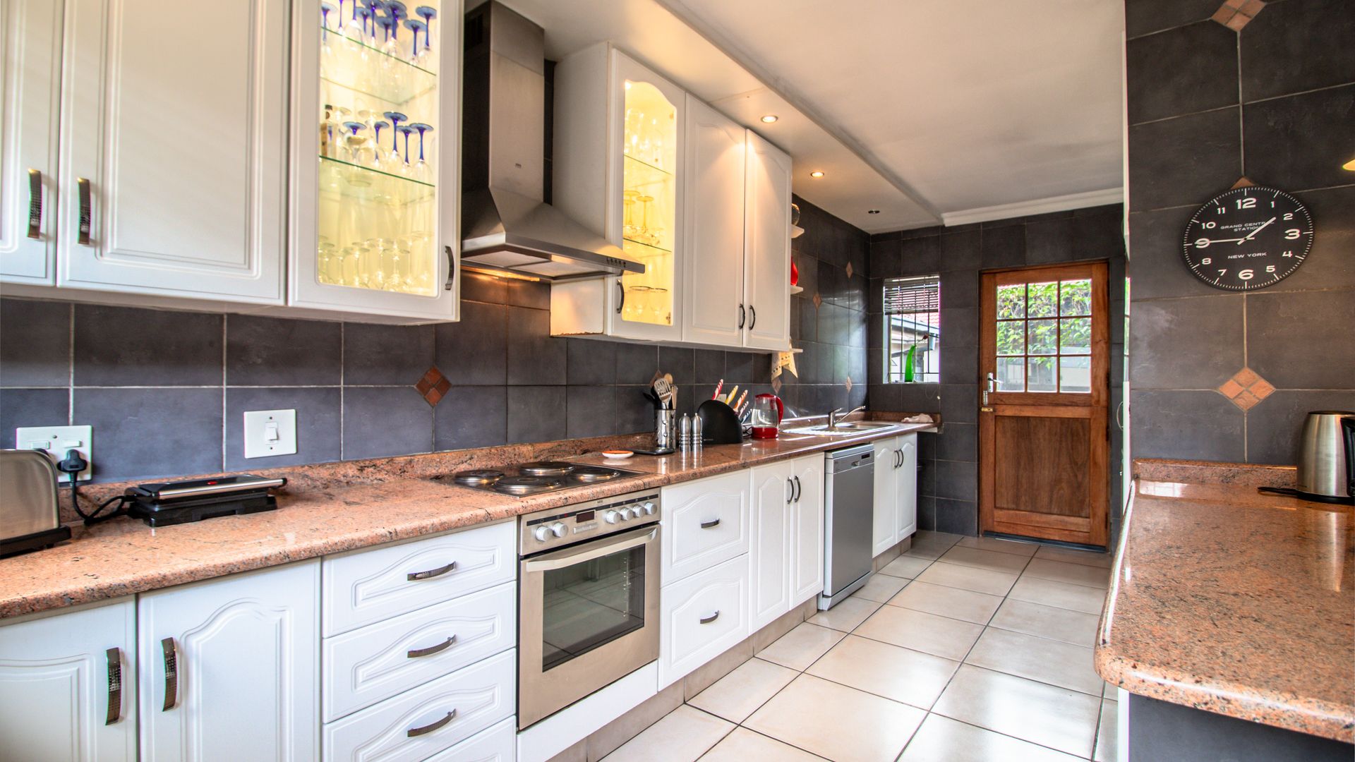 As you enter, you'll be greeted by a sun-drenched formal lounge, a serene space perfect for intimate gatherings or relaxed family moments. The open-plan dining room seamlessly transitions into a modern kitchen, a chef's delight featuring exquisite granite countertops and generous space for under-counter appliances—ideal for culinary creativity and effortless entertaining. Adjacent, a spacious TV lounge offers expansive views of the lush garden, providing the perfect retreat for family relaxation and connection with nature.