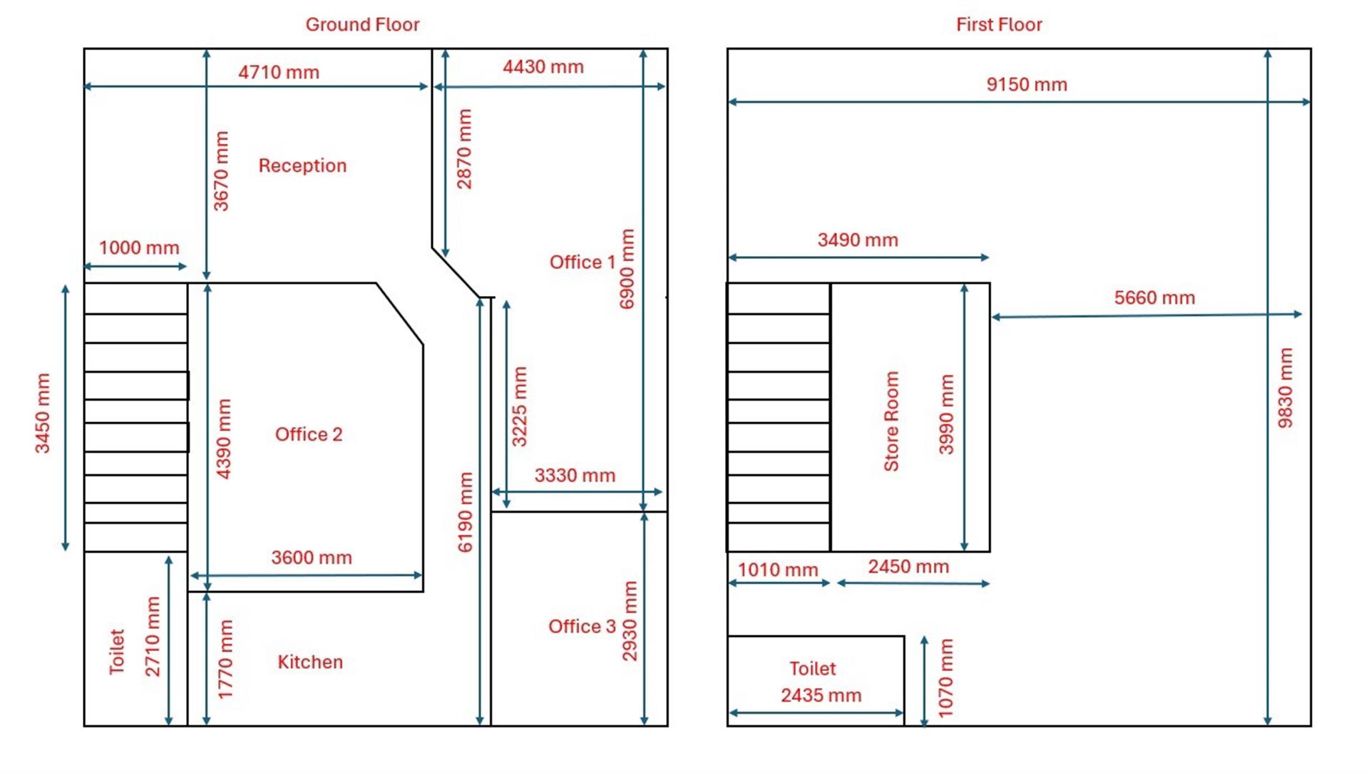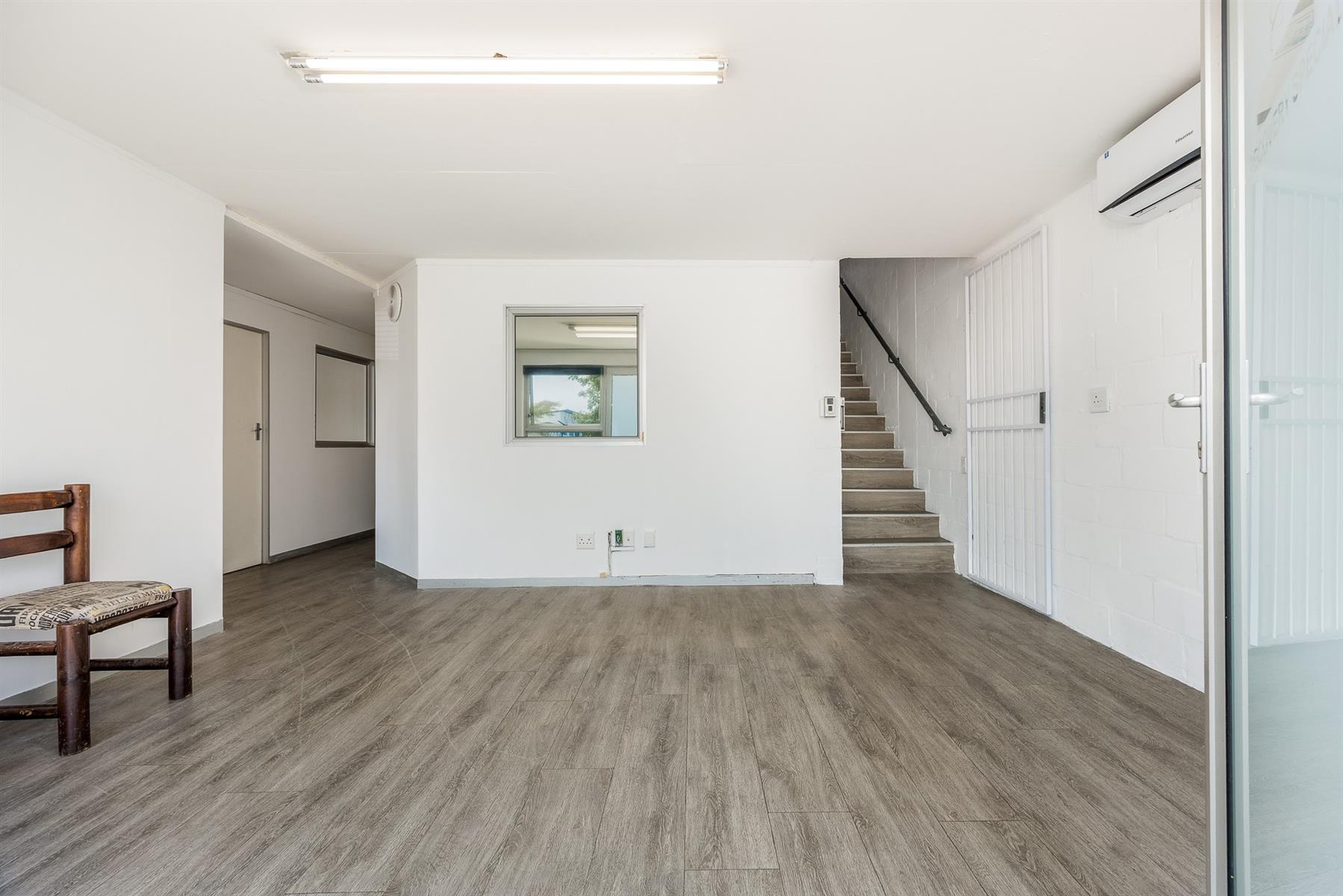 The ground floor features a welcoming reception area, three private offices, a kitchenette, and an ablution facility. Upstairs, the double-volume first floor offers an open-plan workspace, an additional storage room, and a second ablution providing excellent flexibility for growing businesses.