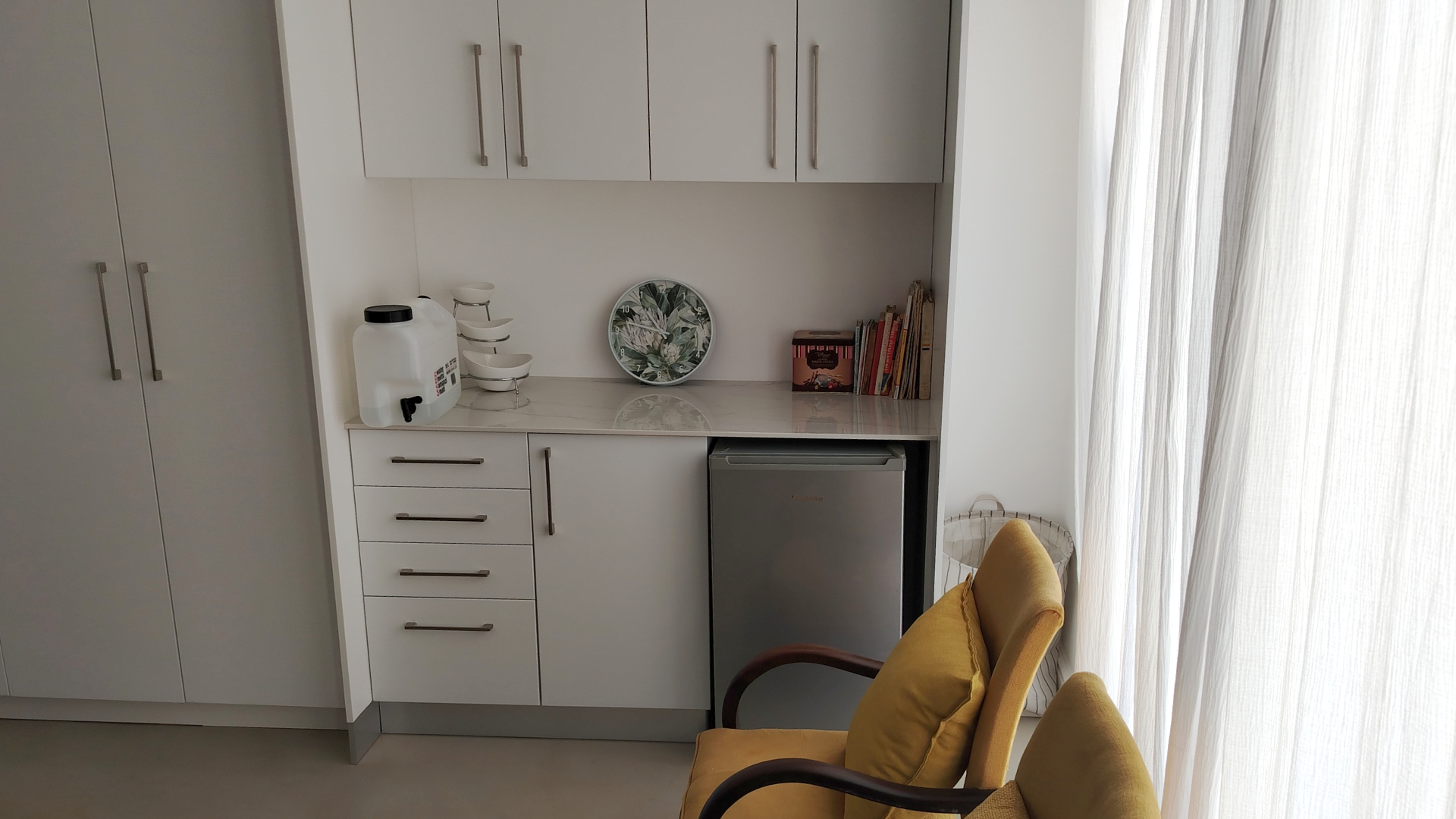 The heart of the home is a beautifully considered kitchen that balances style with practicality. Clean lines, quality finishes, and a separate scullery keep everyday living effortless, whether you enjoy cooking for guests or prefer a calm, uncluttered space. From here, the home flows naturally into the weather-protected patio, where a built-in braai and pizza oven set the scene for relaxed lunches, evening fires, and slow weekends surrounded by nature.