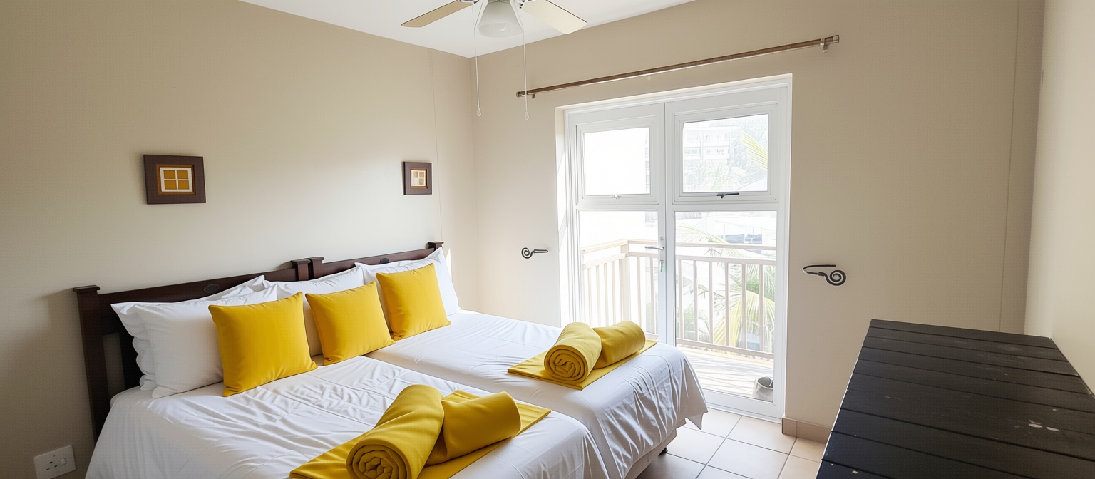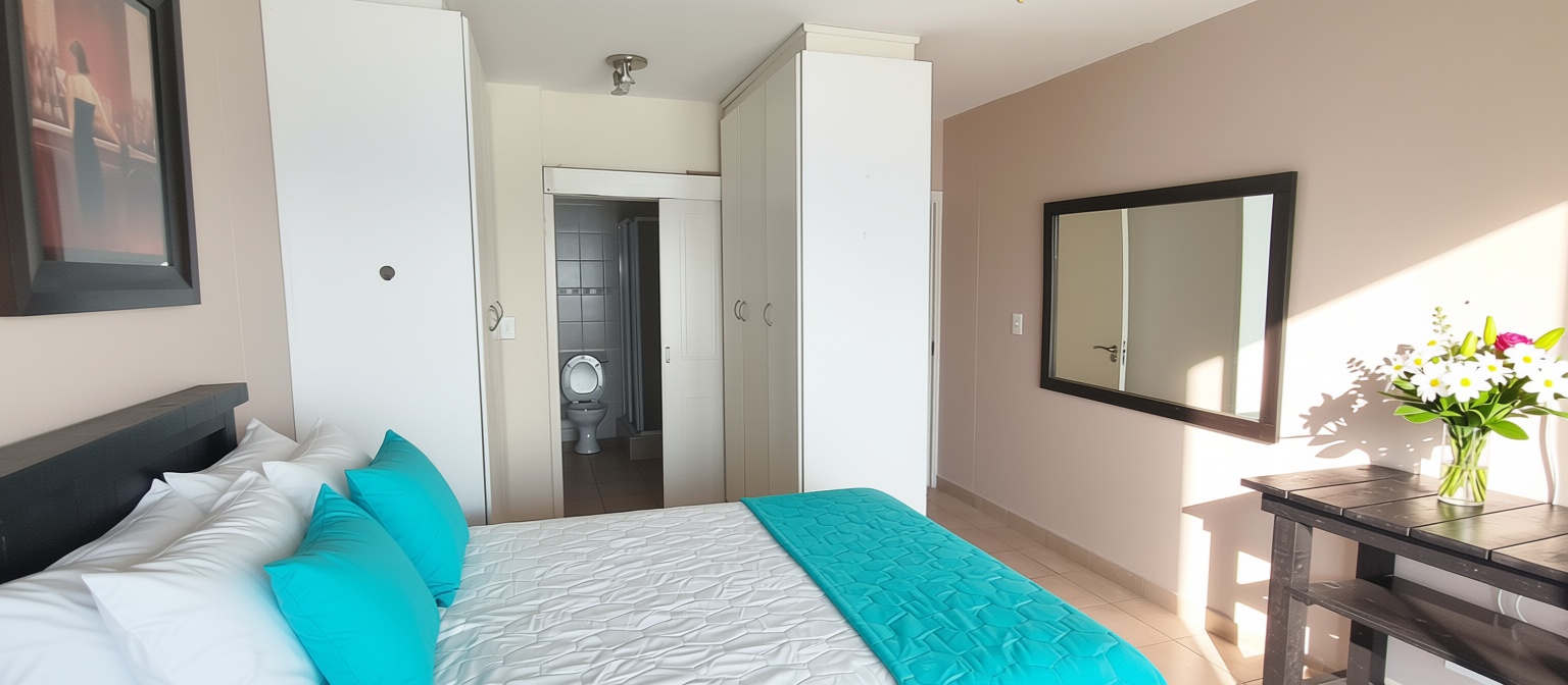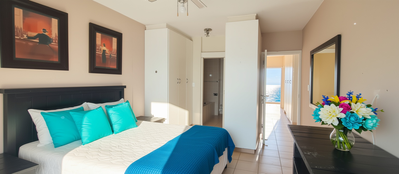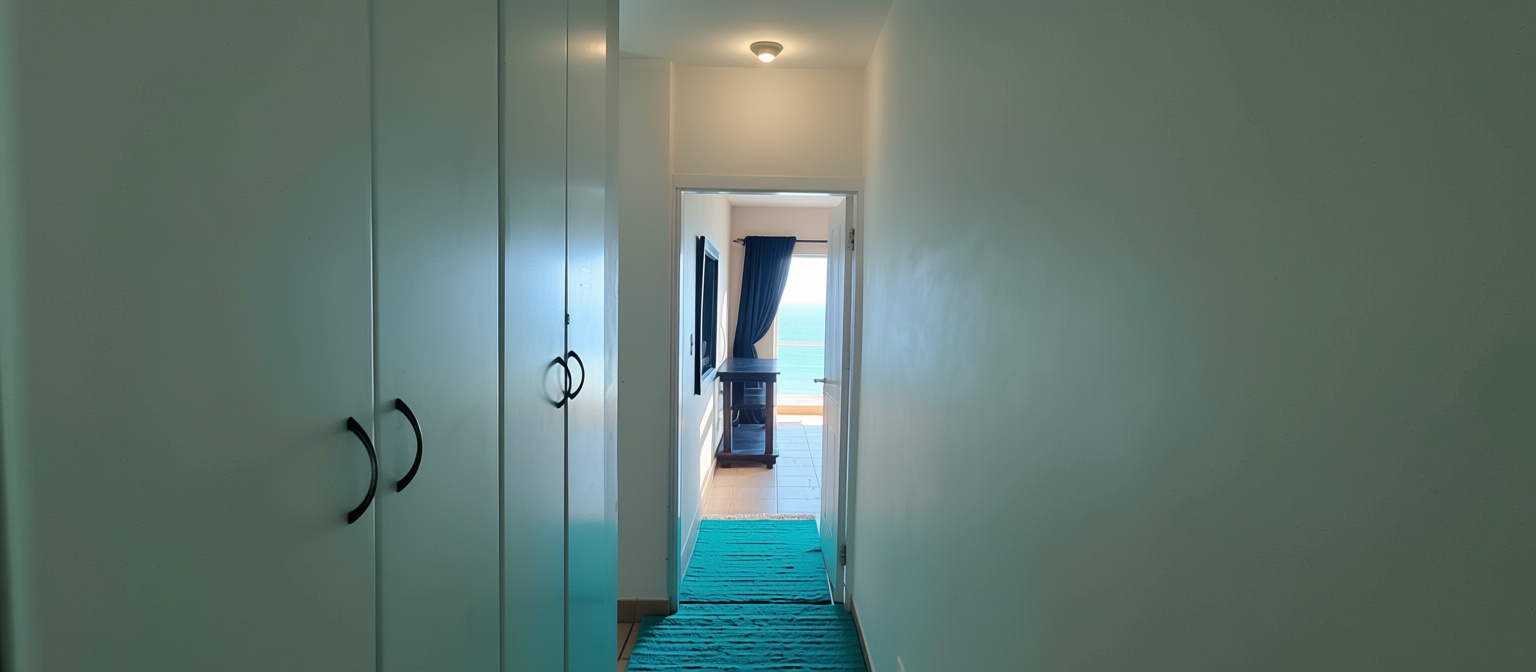 The Master suite is a serene retreat, boasting direct access to the balcony, mesmerising sea views, and a stylish en-suite with his-and- hers built -in cupboards.
