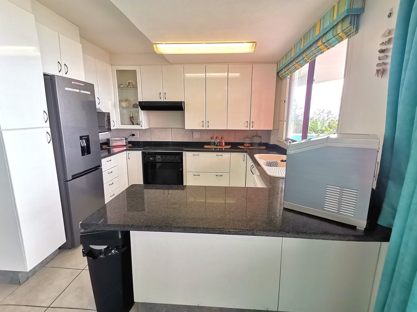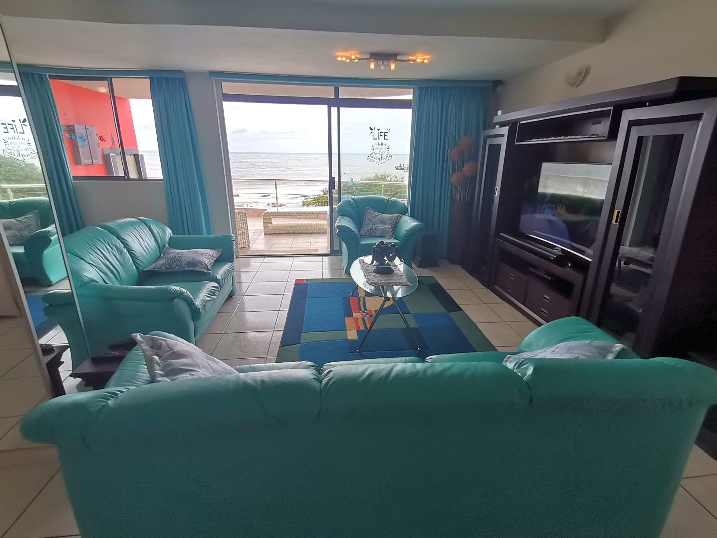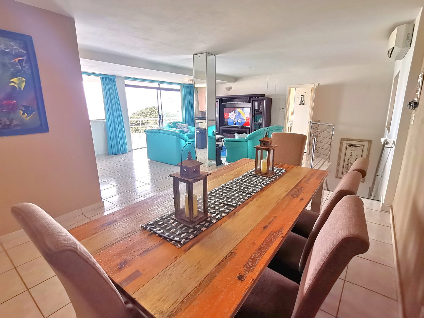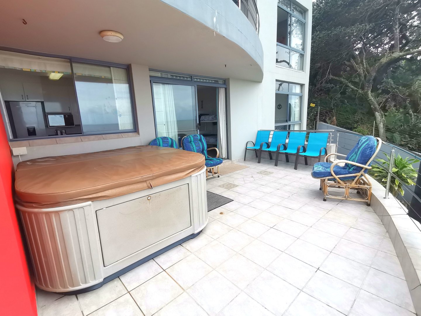 Let the Jones' envy you when you buy this gorgeous unit. Take a walk through the unit with me. When entering the complex the single garage greets you - with an interleading door into the spacious entrance hall and a store room. The steps leading to the first floor is inviting and the sea view and open plan space will take your breath away. Lets start on the right first. Walking through the lounge towards the main bedroom. The main bedroom is spacious with it's own full bathroom and flows out onto the balcony with spectacular sea views. The lounge flows out onto the balcony and the dining room is next to the kitchen, with granite tops and electrical top and oven - the glass sliding windows gives you un-interrupted sea views from anywhere inside the unit. Down the corridor - the invertor is mounted on the wall - so loadshedding will be a breeze. The second bedroom is to the right with access to the balcony (bonus is the jacuzzi), the third bedroom is situated next door with sliding glass windows - the family bathroom has a bath. The small entrance hall that leads out to the court yard with a Jojo tank, has space for a washing machine. All I can say is ... this is a gorgeous unit and because you are not in Margate central where the noise and activities are - you can enjoy breakfast at sunrise on the balcony and you are still close enough to shops, schools and the beach.