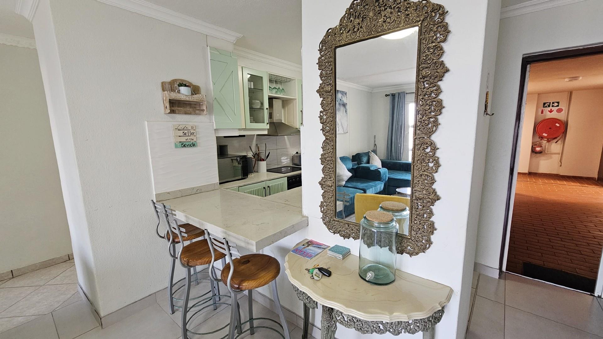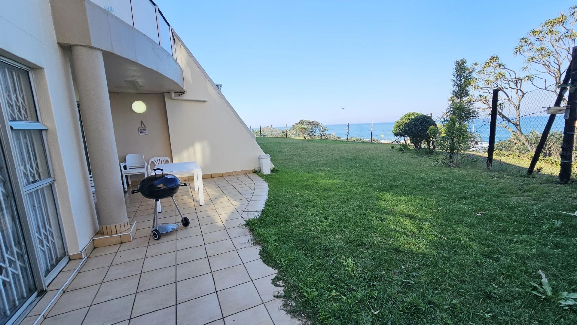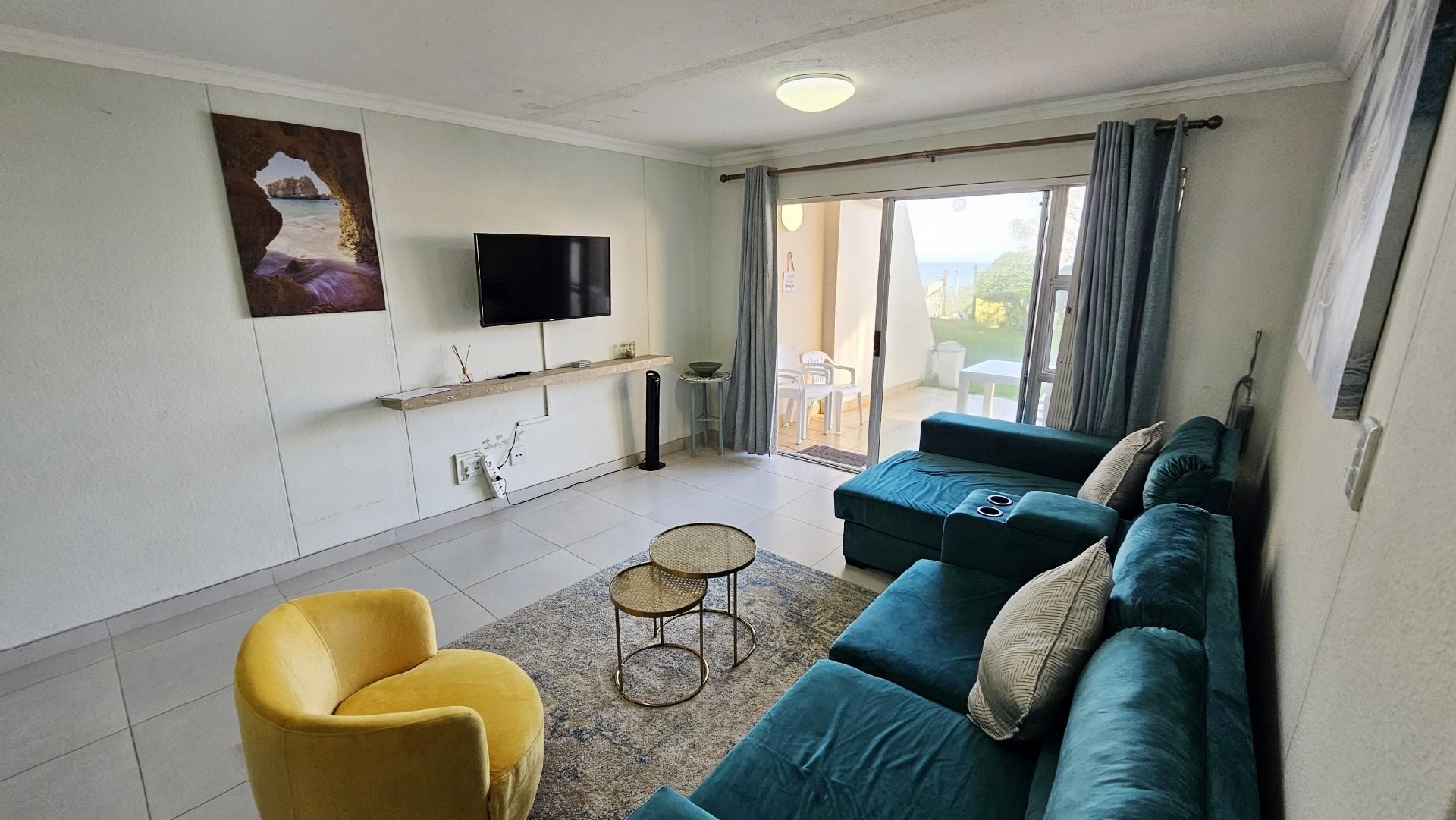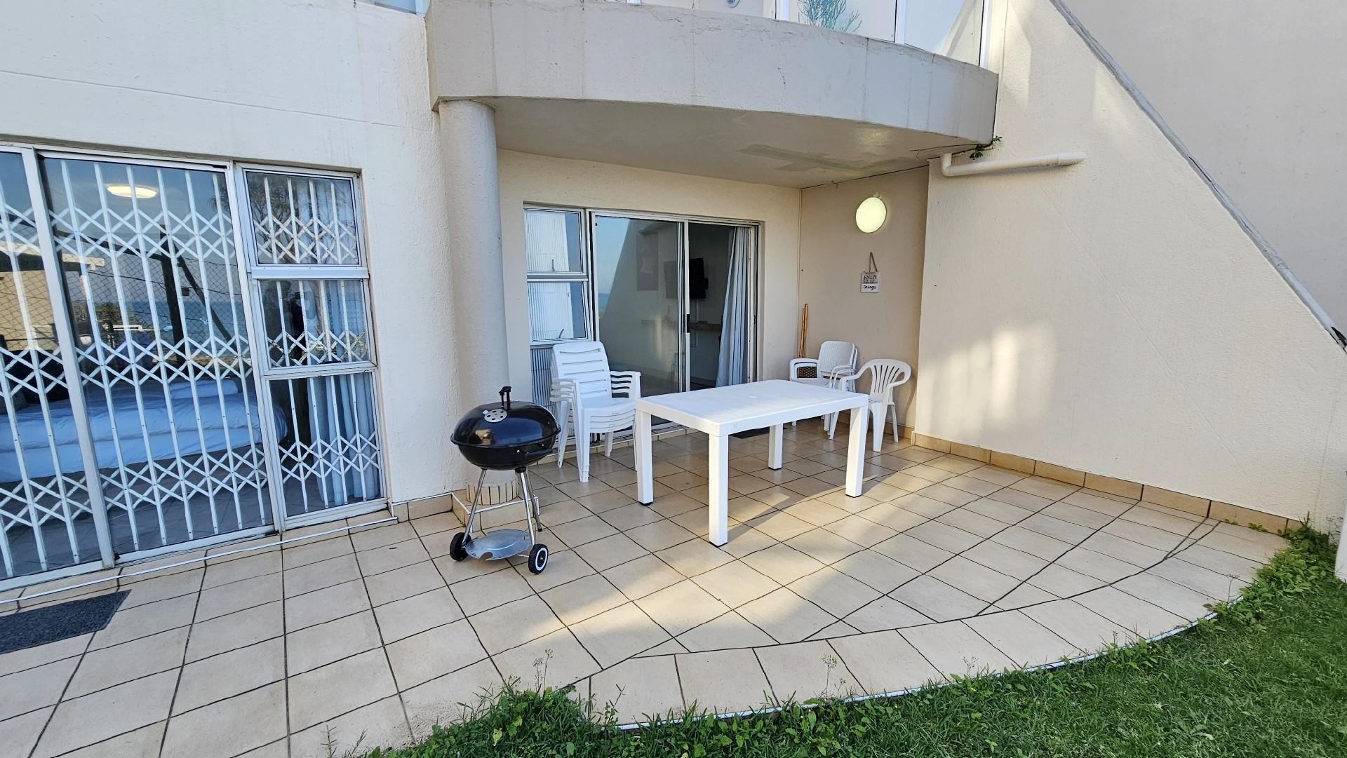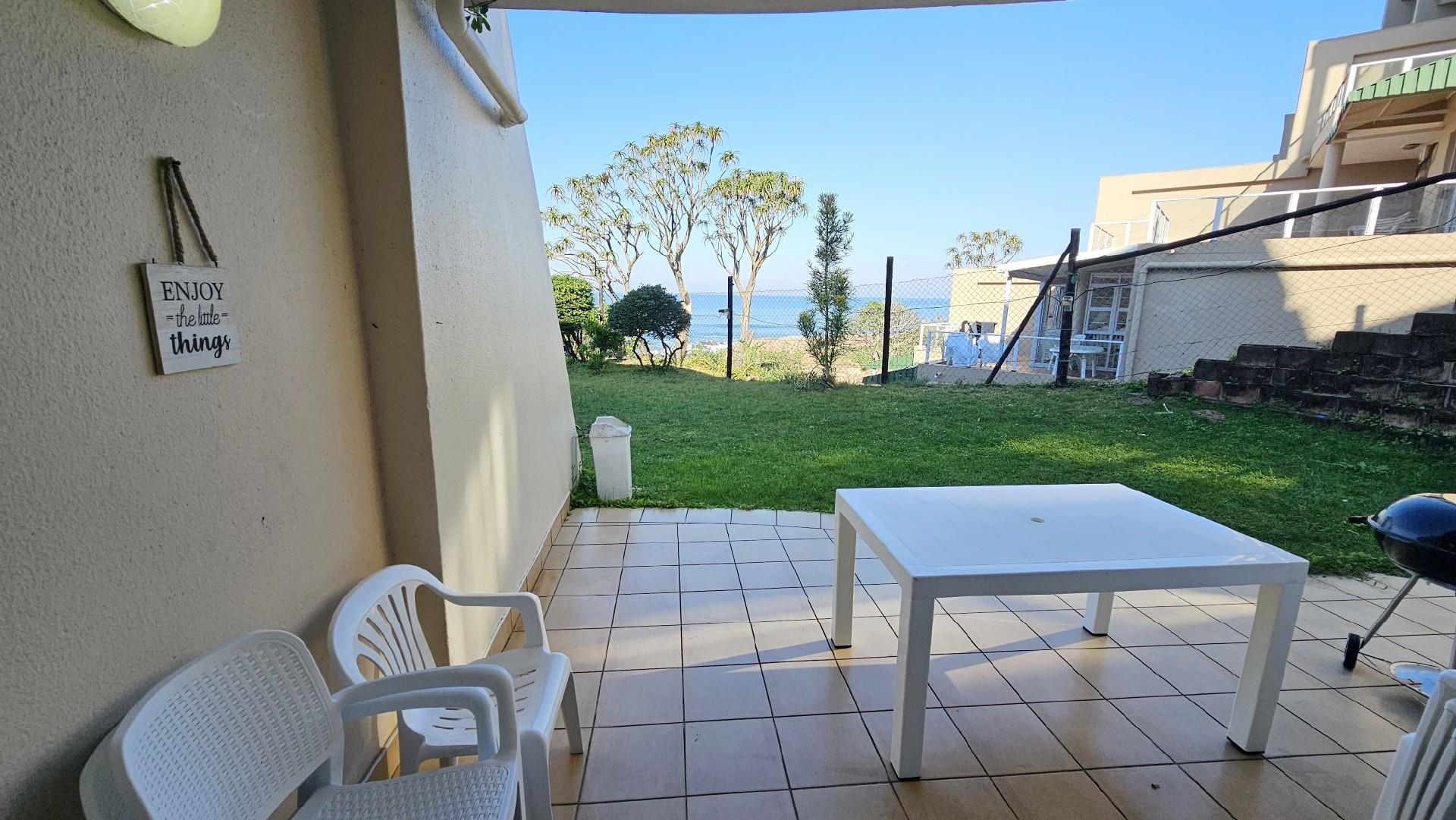This beautiful unit is in a very popular complex on Marine Drive and has so much to offer. Although this is a ground floor unit, it is two flights of stairs to get down to ground floor. On entering the unit, you are greeted by a beautiful kitchenette with white crystal quartz tops, a prep basin, ample packing space, an undercounter oven, an electric hob with extractor fan and a breakfast nook. This open plan unit flows beautifully into a cosy lounge area, with sliding doors going out onto the patio. The ocean is literally on your doorstep, at less than 250m away from your front door!