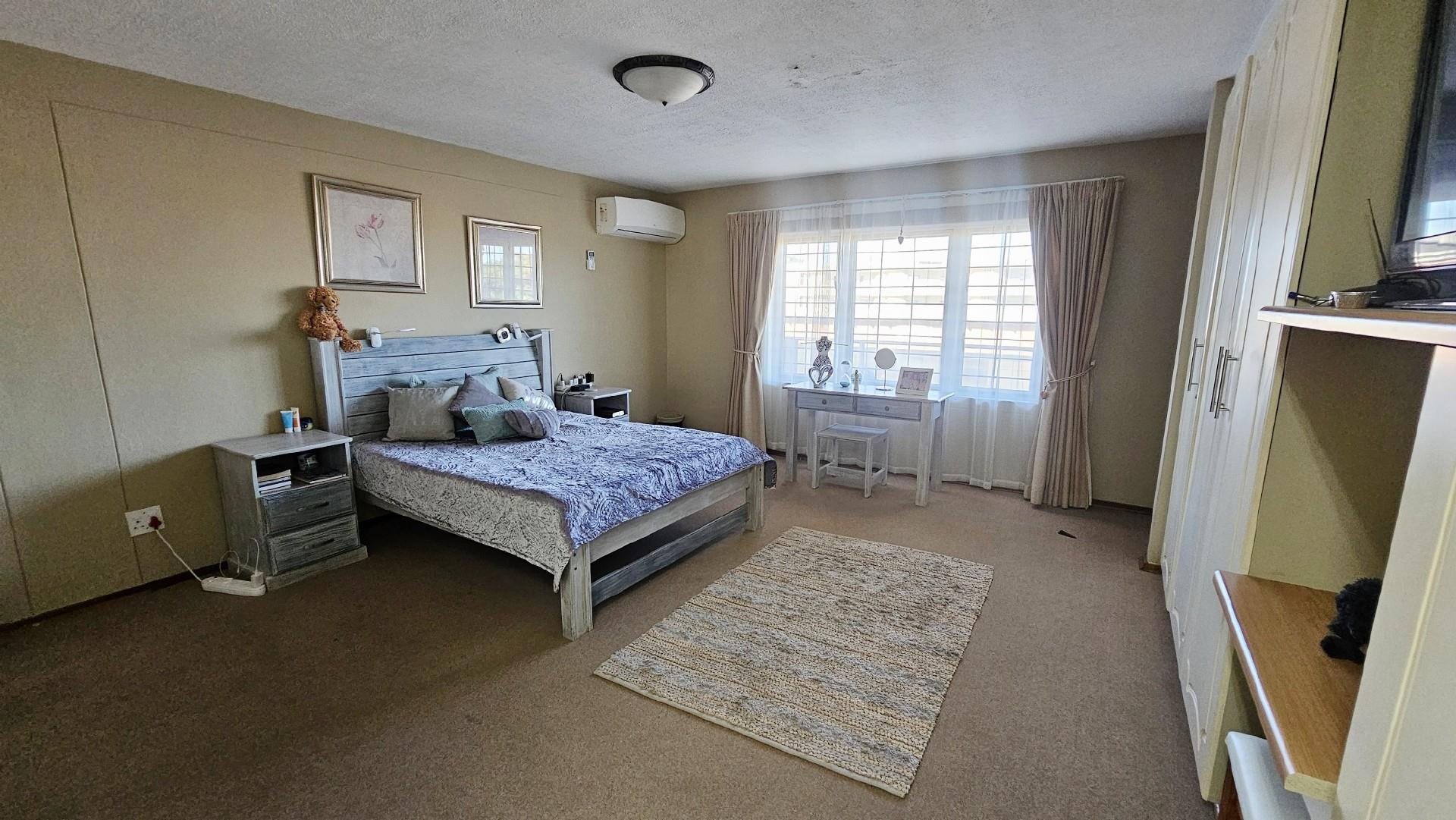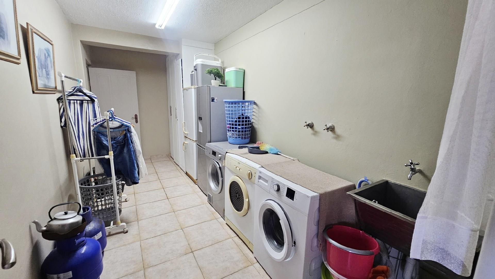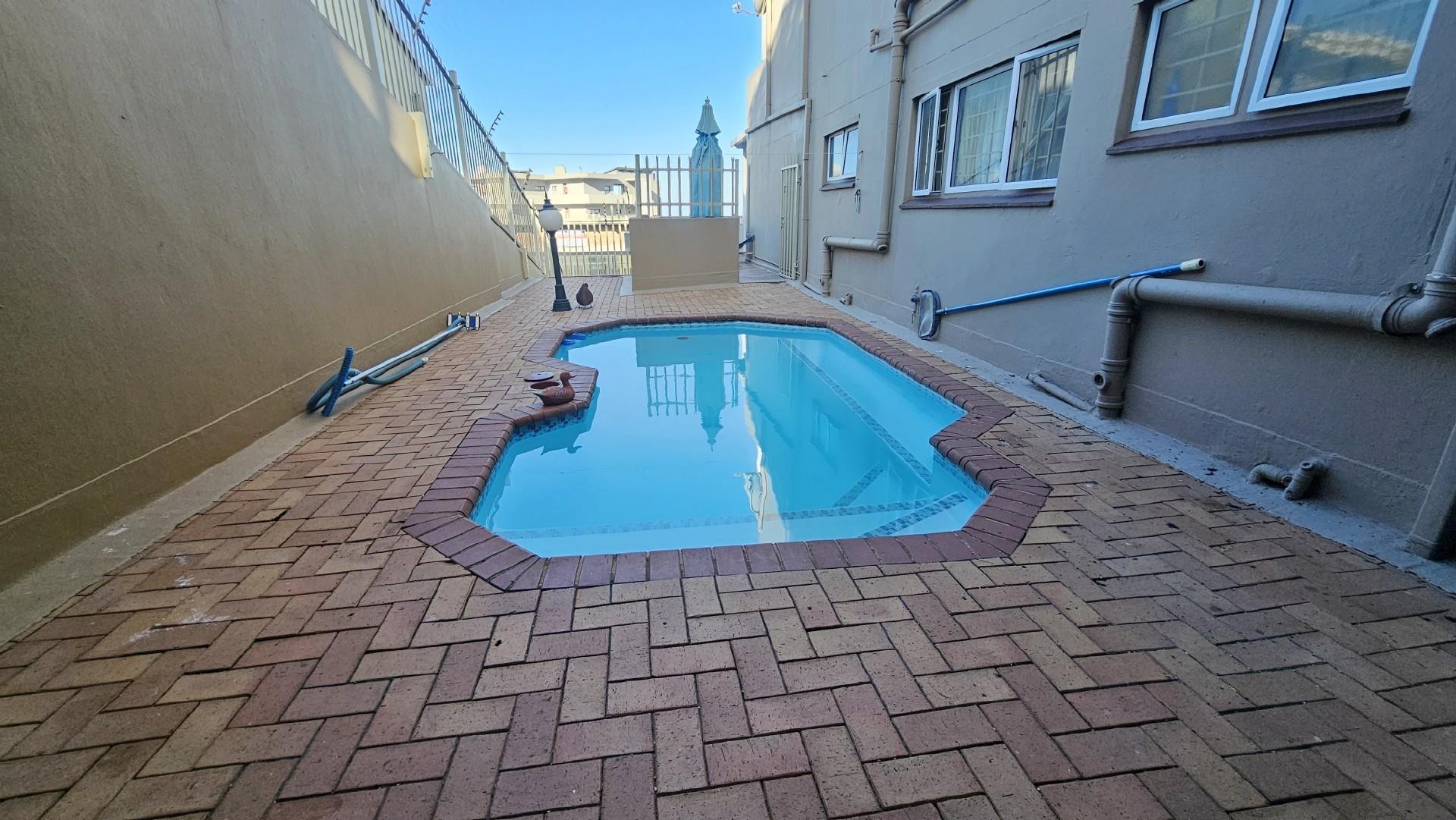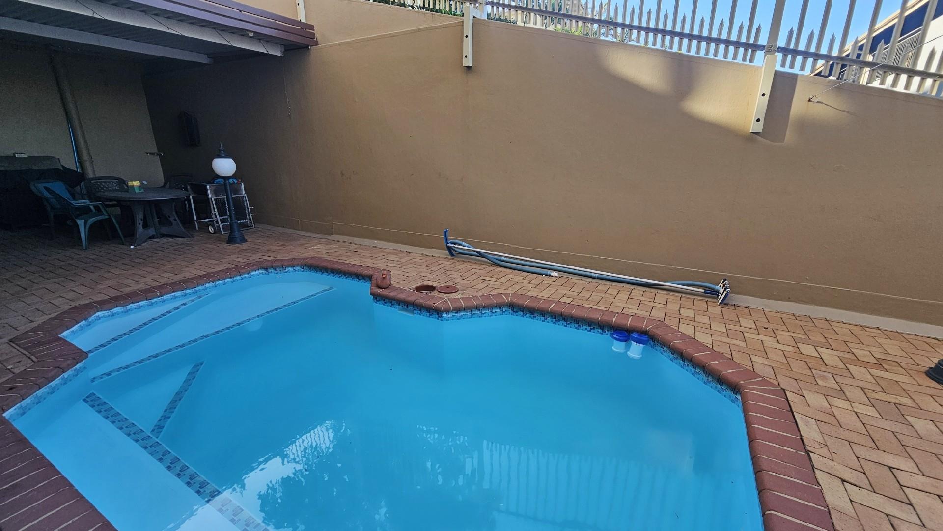 The kitchen is generously proportioned, fitted with ample cabinetry, melamine tops, a freestanding stove, prep basin, and a convenient breakfast nook. Flowing seamlessly from the kitchen, a charming dining area sets the stage for intimate dinners with family and friends. The main bedroom is a serene retreat, boasting abundant wardrobe space, private access to the patio, air‐conditioning, and a luxurious ensuite bathroom with a double basin. The remaining three bedrooms share a second well‐appointed bathroom. Each bedroom is carpeted, with ample cupboard space, natural light, and a fresh, airy feel. At the back of the unit, a spacious laundry area is fitted with multiple washing machines and tumble dryers, ensuring effortless convenience. From here, you step out onto a second undercover patio that leads to your very own private swimming pool, the only unit in the complex to enjoy this exclusive feature.